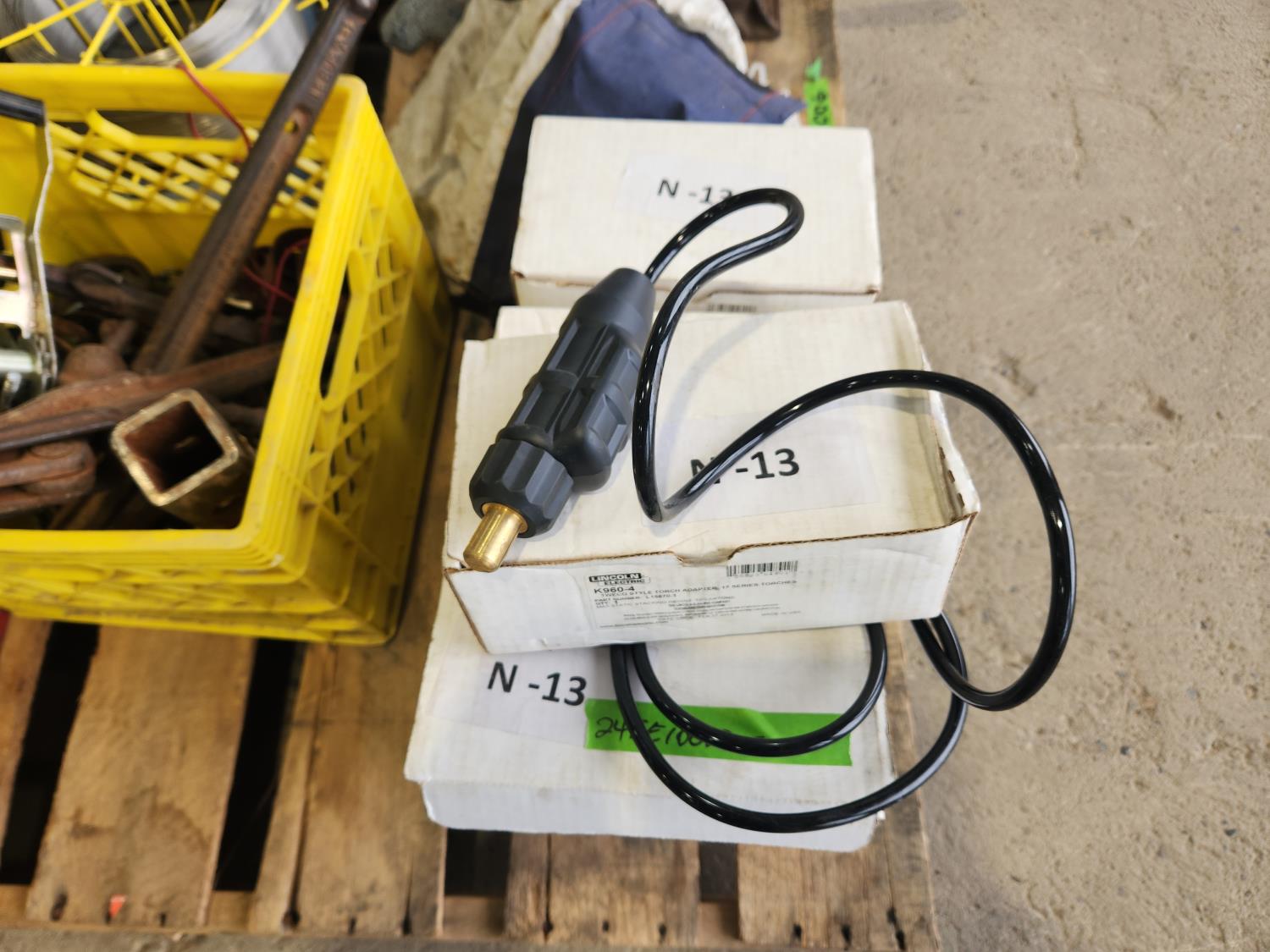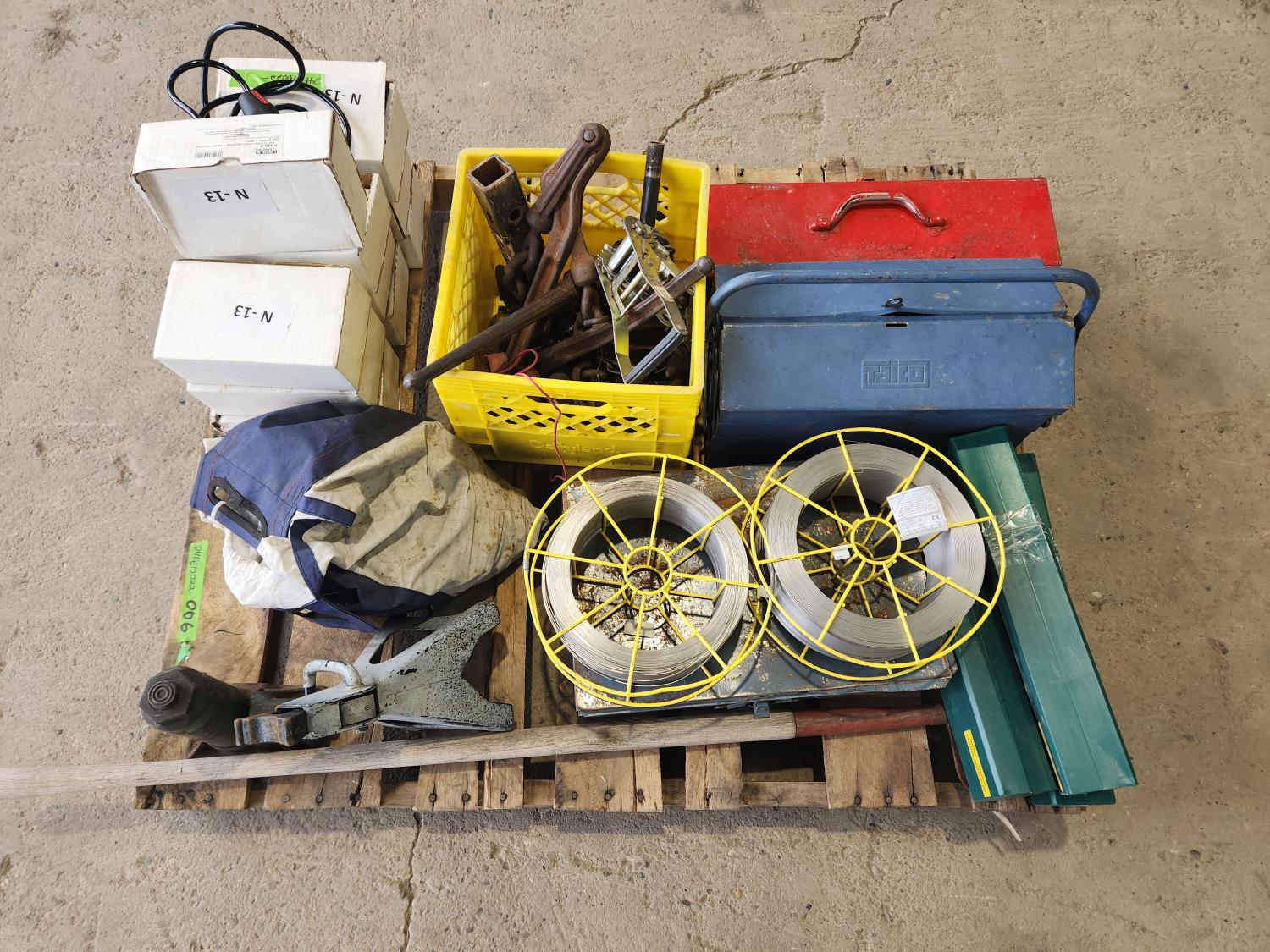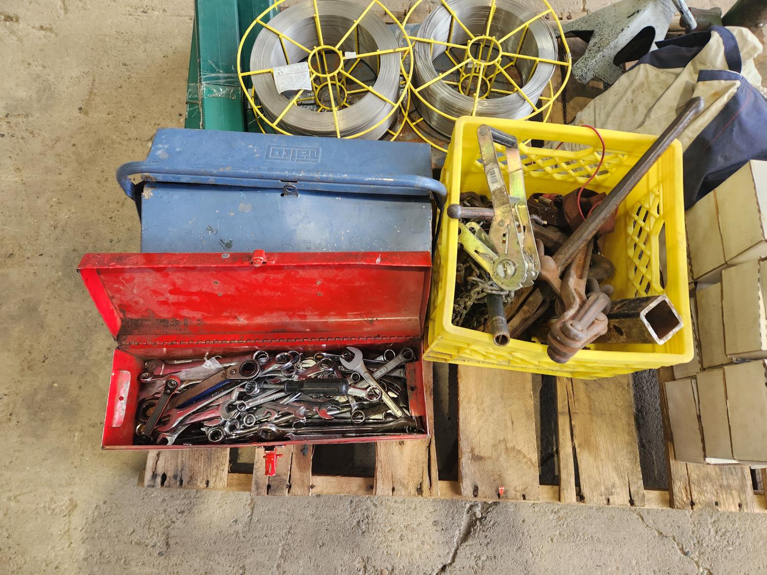 Tool box with miscellaneous wrenches, tool box with miscellaneous tools, (2) rolls of 308l 0.30 mig wire, (3) tapered shank drill bits 1-3/4 inch, bag of tire chains, k960-4 tweco torch adapters (11)