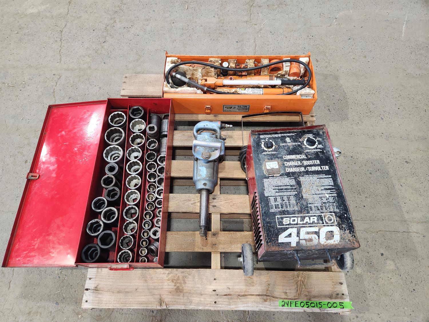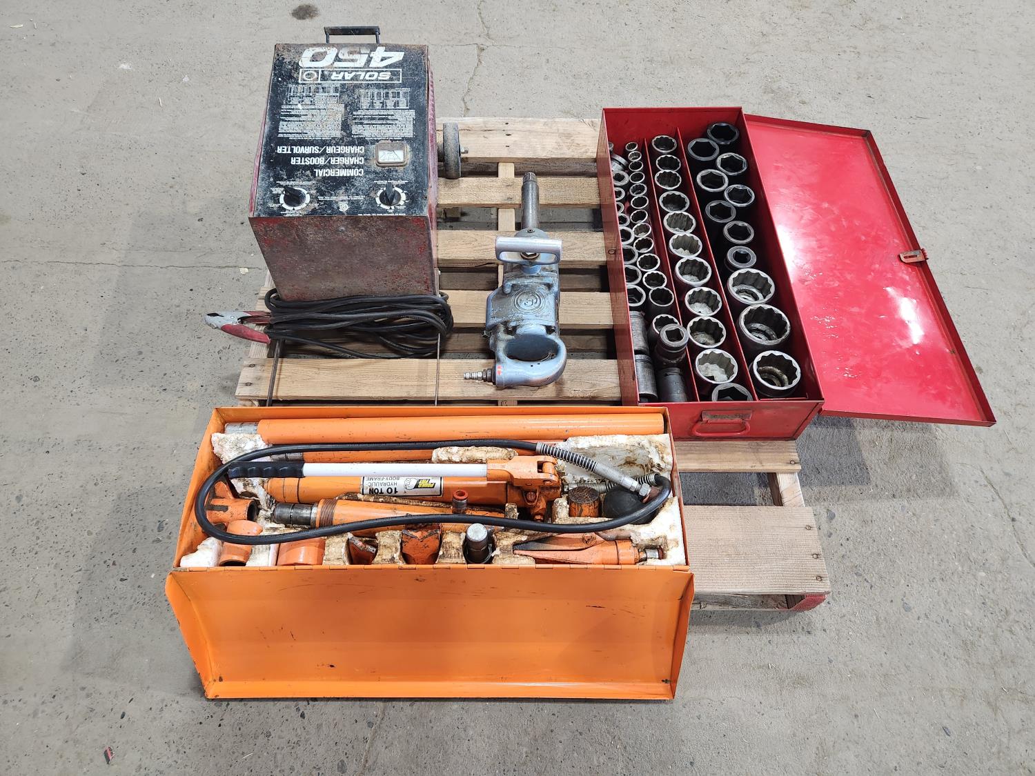 set of 1 inch drive sockets impact and standard, 1 inch air impact gun Chicago pneumatic, 10 ton porta power set, commercial charger / booster 60/60 a 6/12 volt