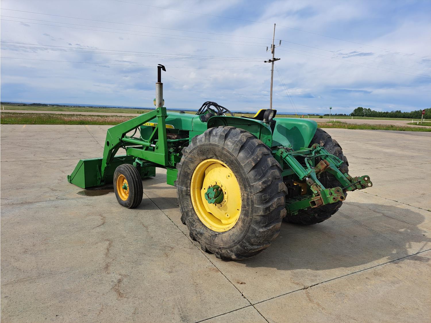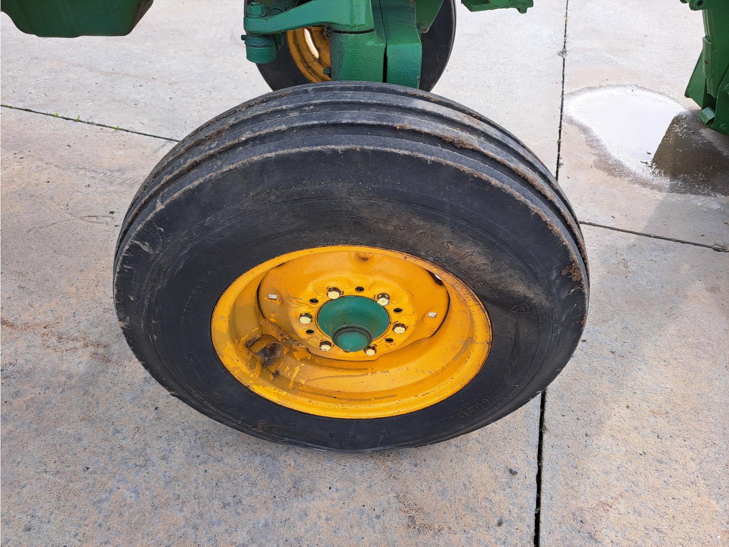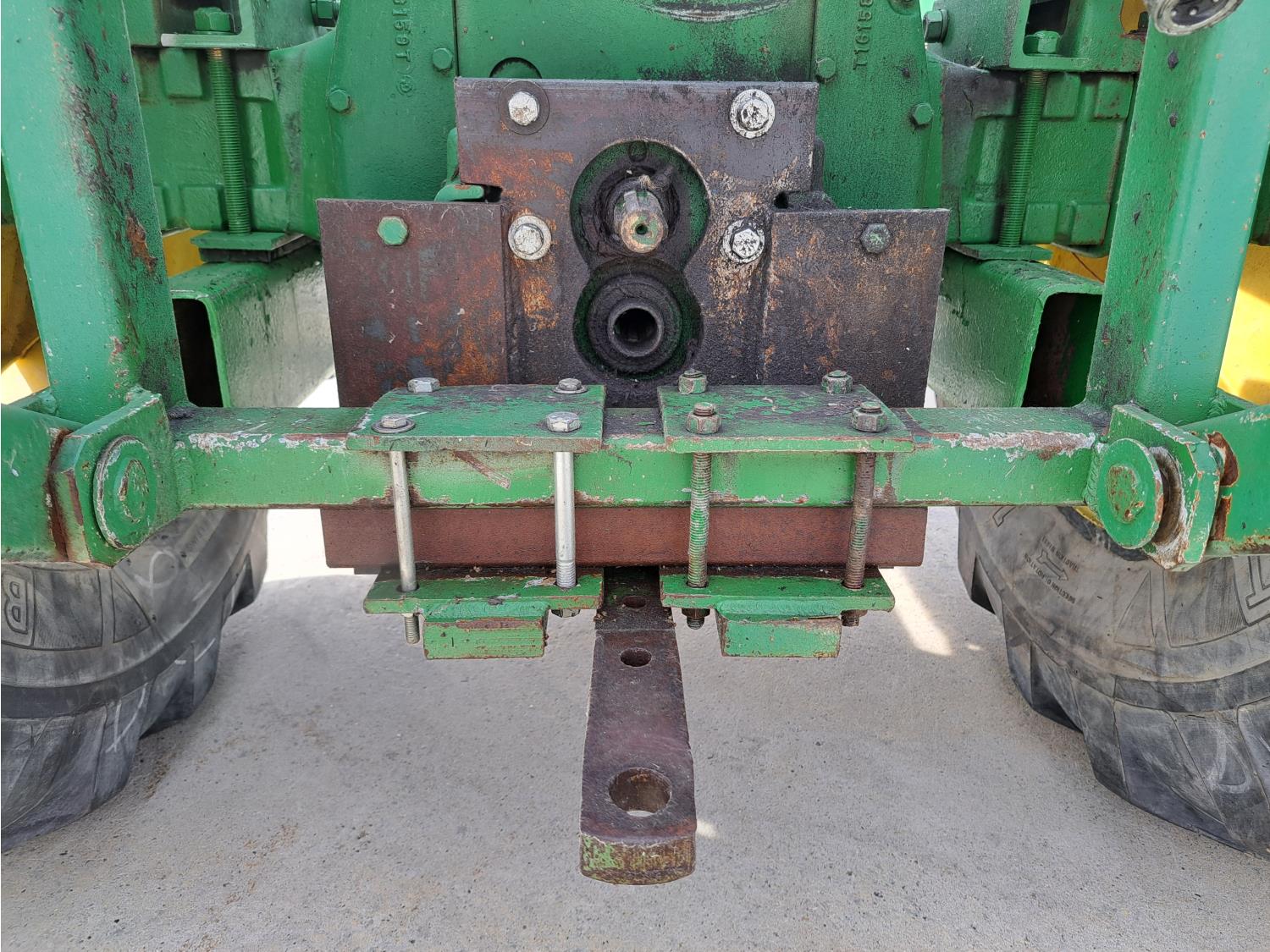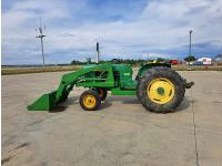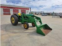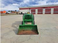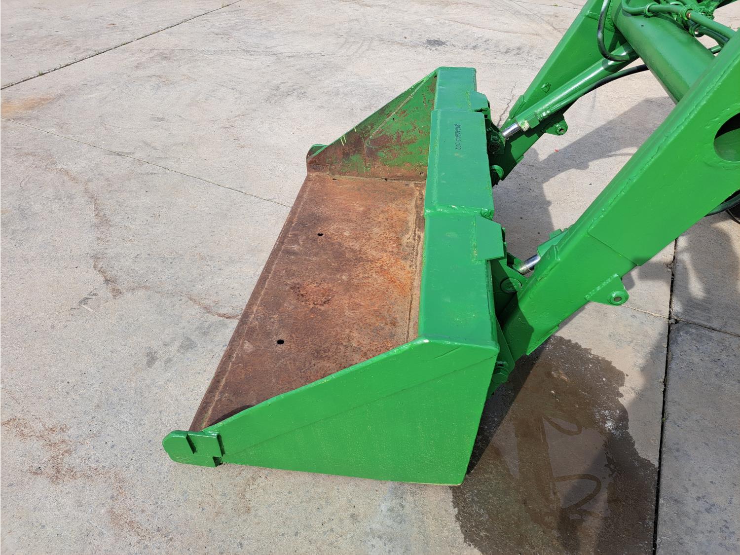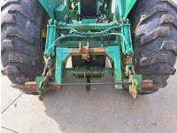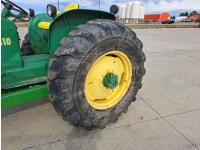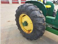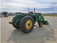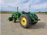 John Deere loader, 60 inch bucket, John Deere 2.4 L 4 cylinder 51 HP, gas engine, 46 PTO HP, 8 speed manual transmission, 540 PTO, 7.60-15 front tires, 16.9-28 rear tires