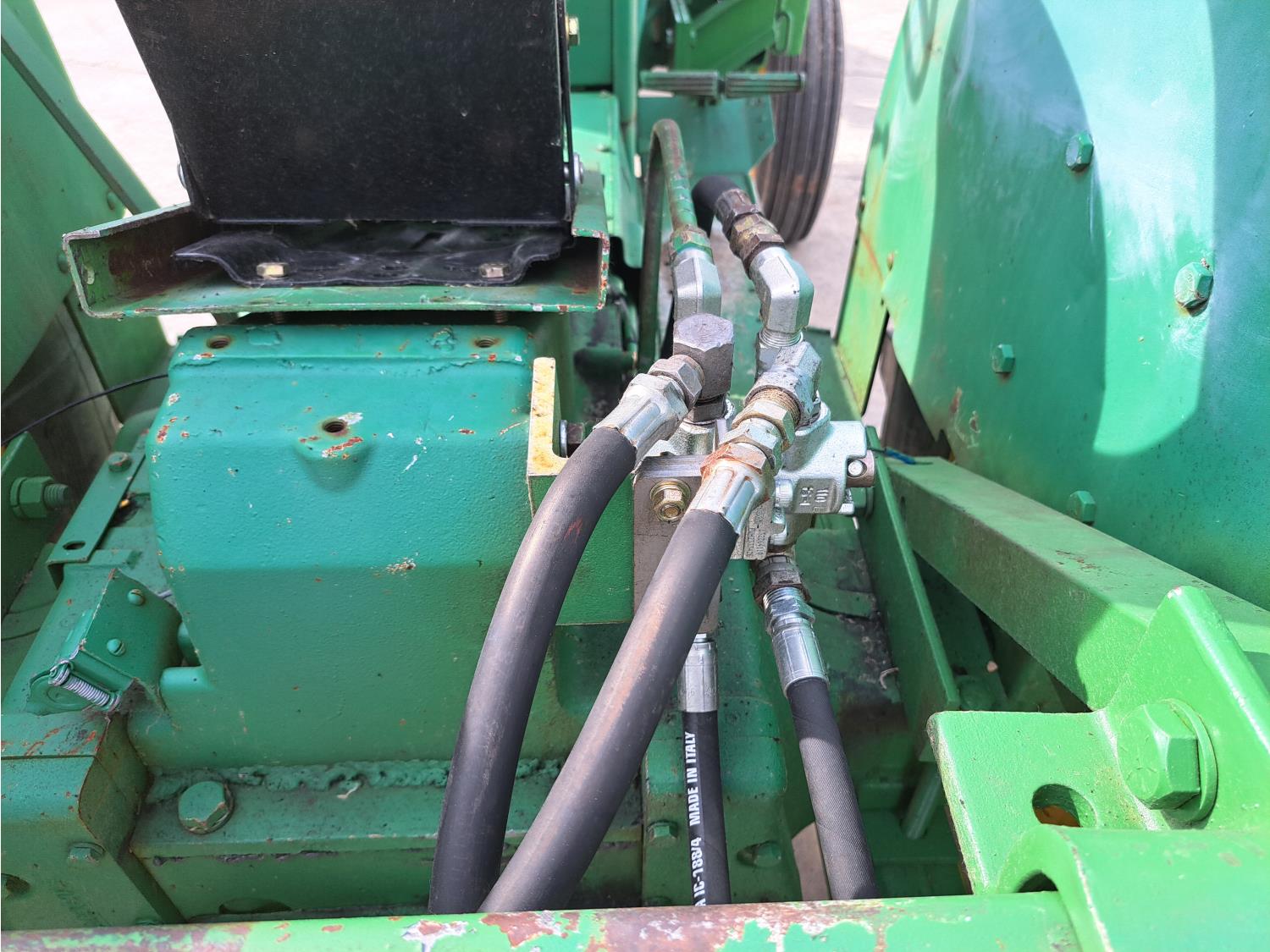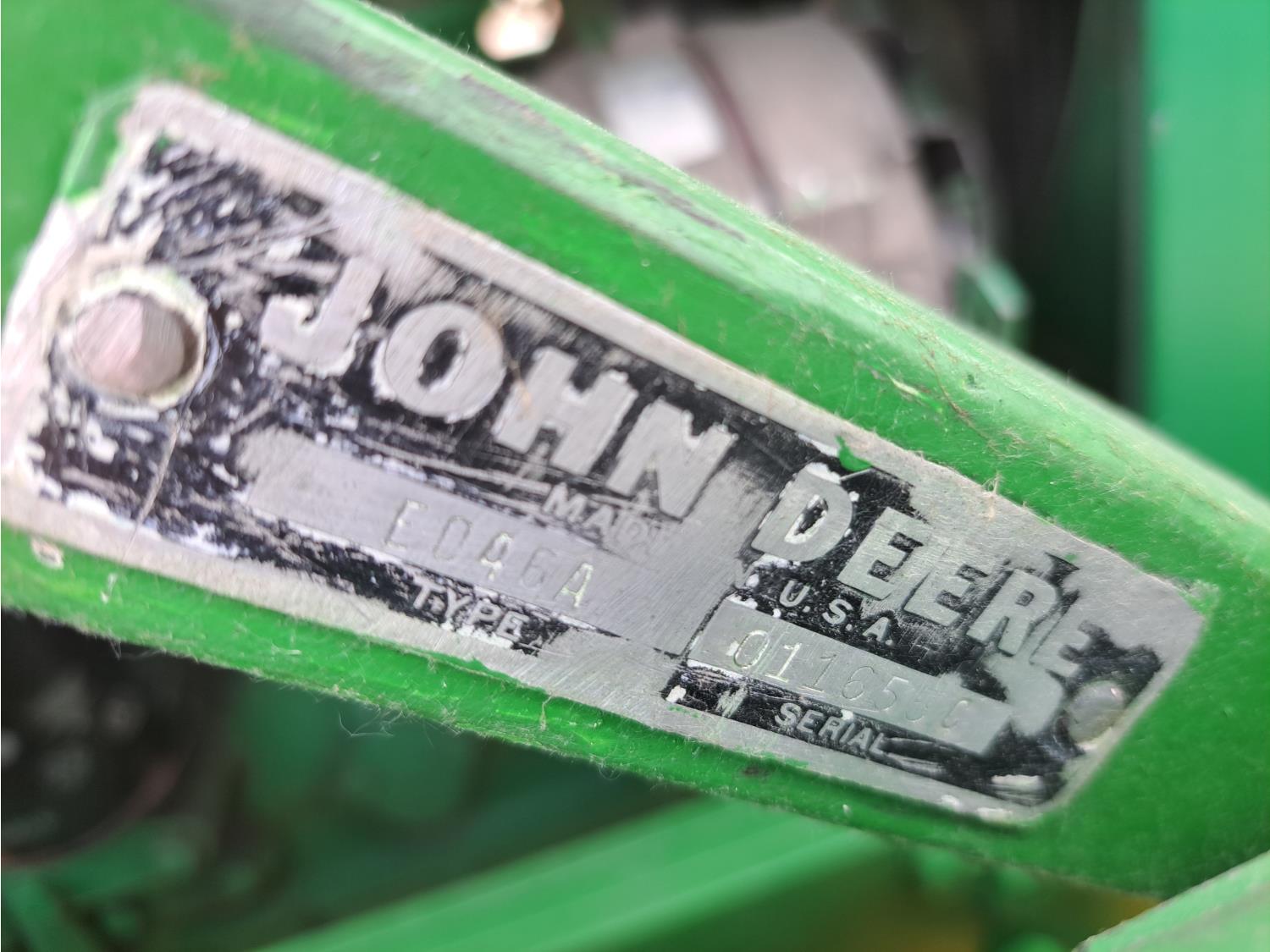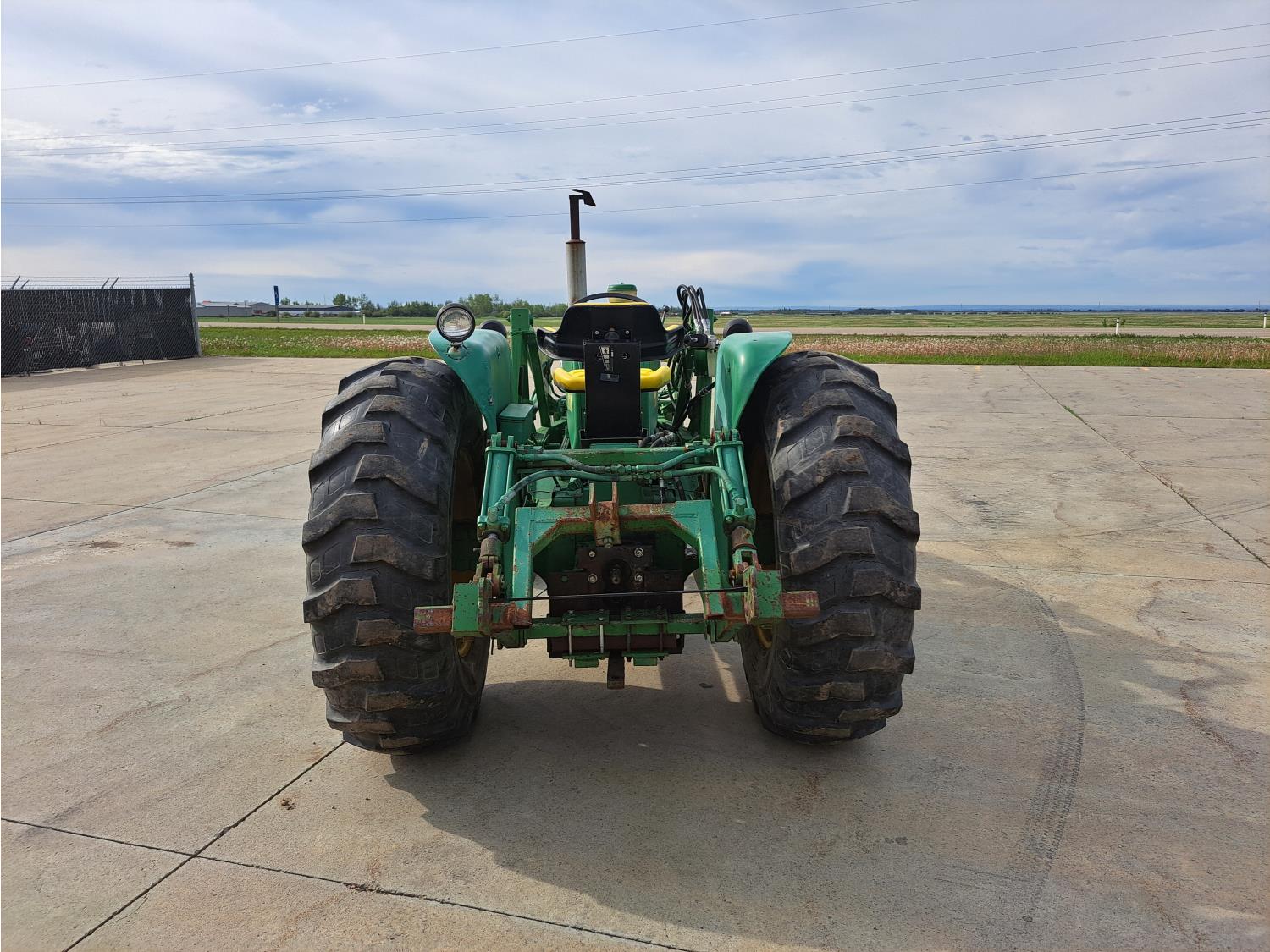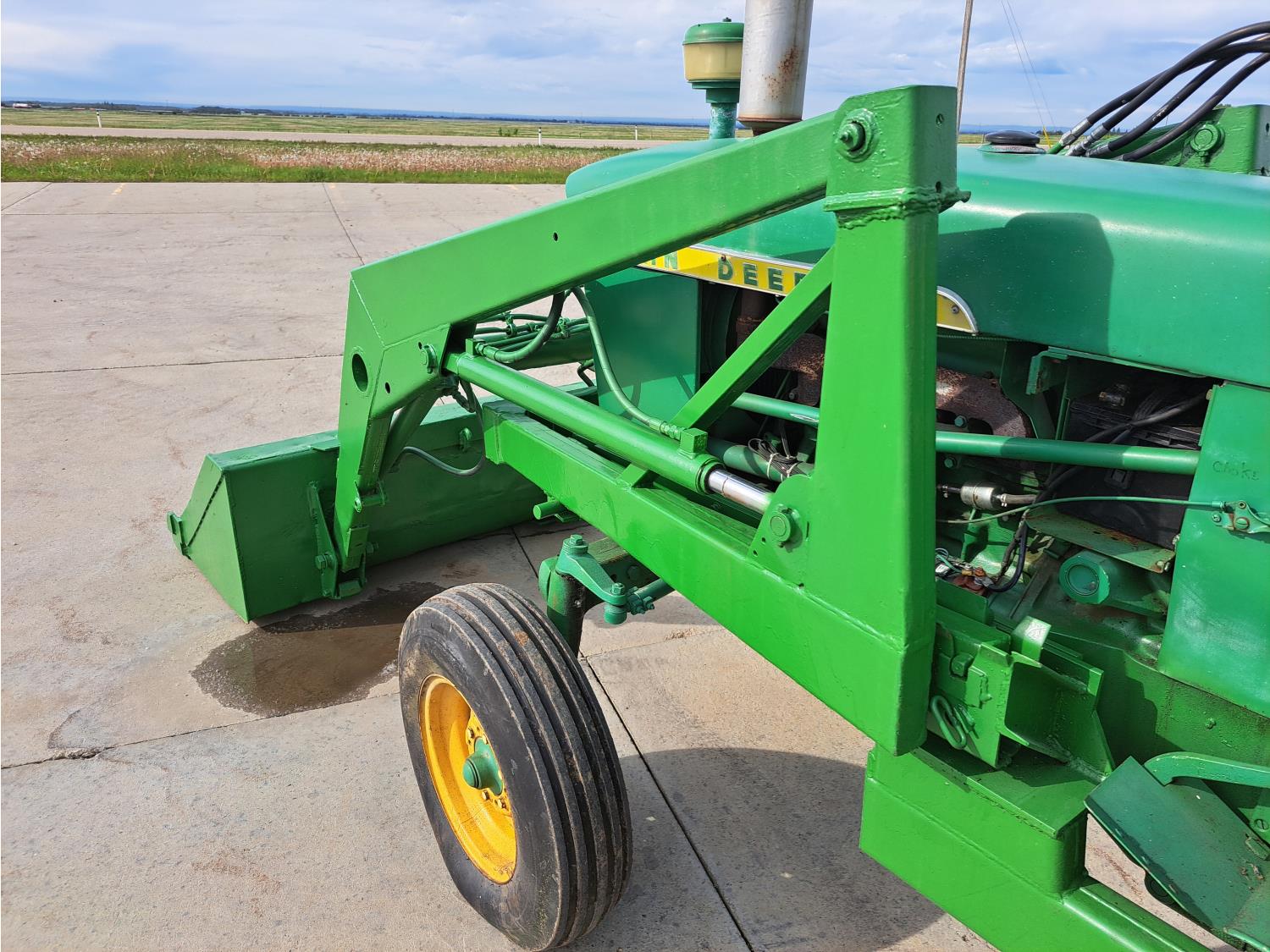 John Deere loader, 60 inch bucket, John Deere 2.4 L 4 cylinder 51 HP, gas engine, 46 PTO HP, 8 speed manual transmission, 540 PTO, 7.60-15 front tires, 16.9-28 rear tires