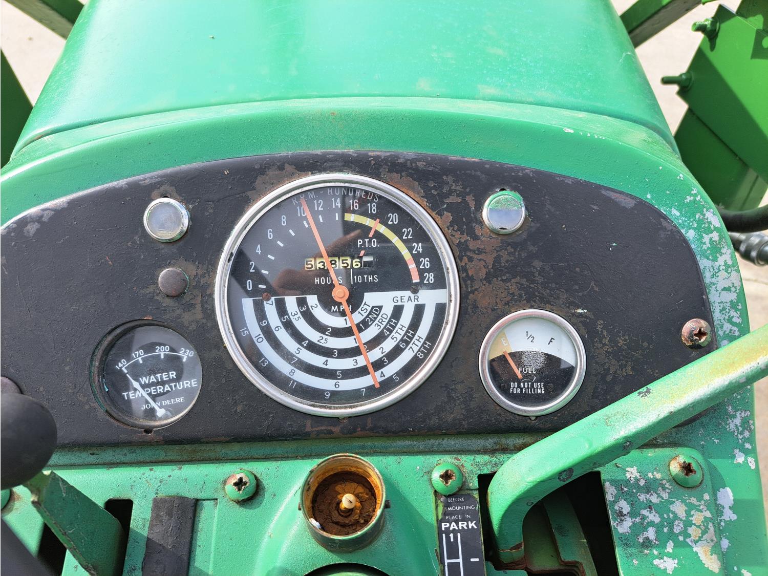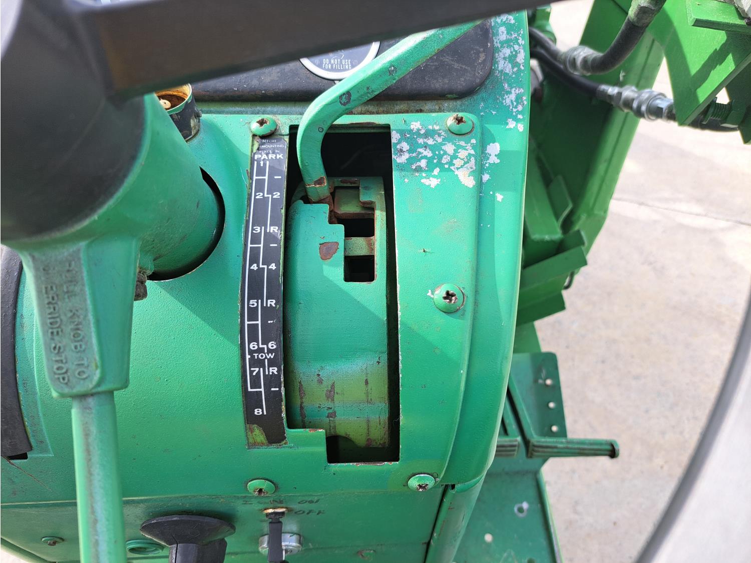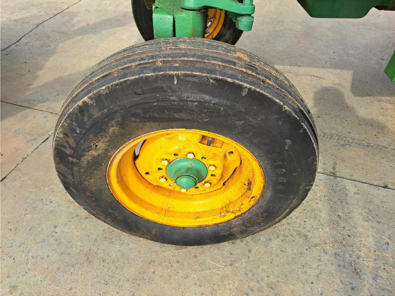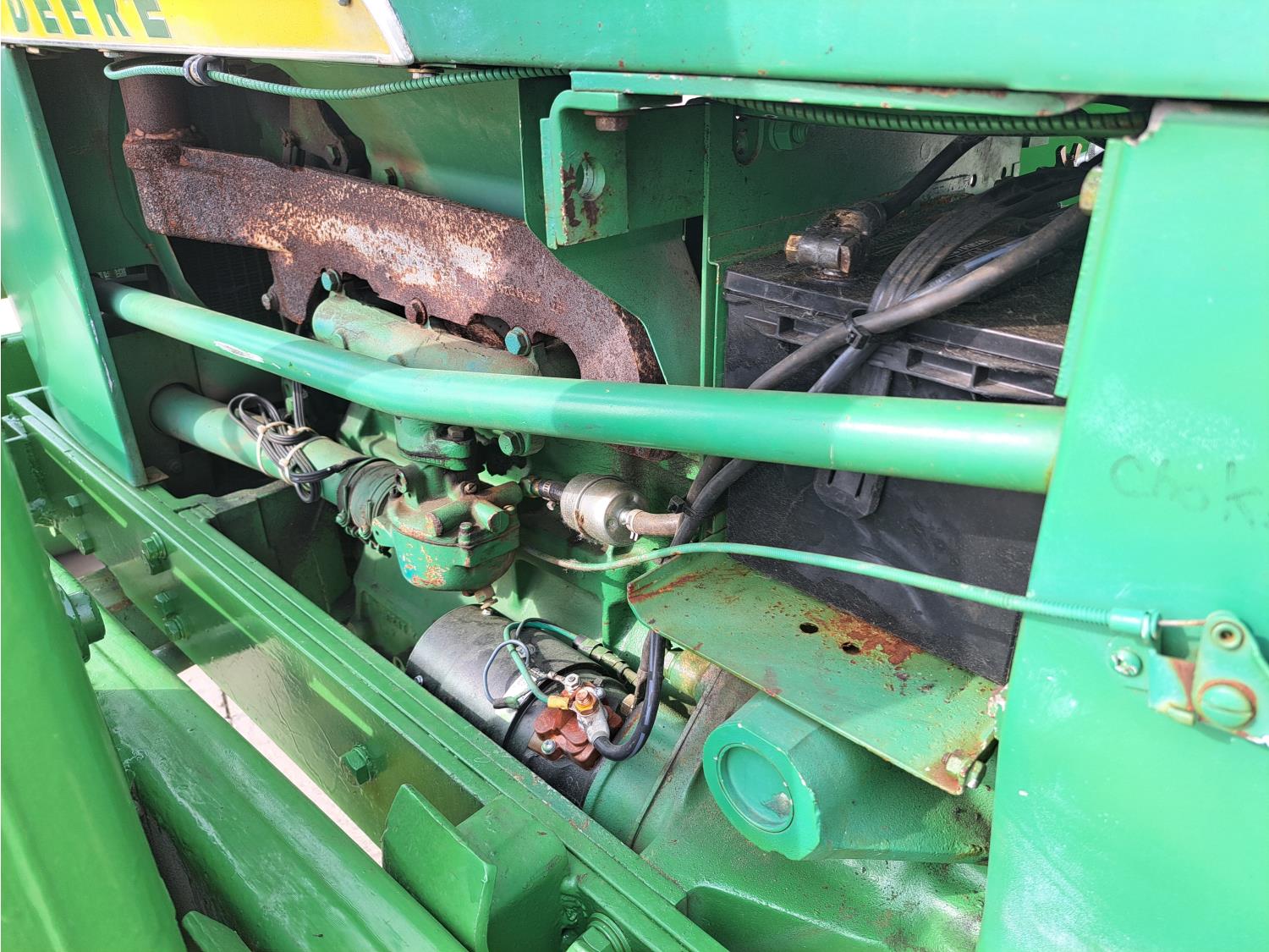John Deere loader, 60 inch bucket, John Deere 2.4 L 4 cylinder 51 HP, gas engine, 46 PTO HP, 8 speed manual transmission, 540 PTO, 7.60-15 front tires, 16.9-28 rear tires