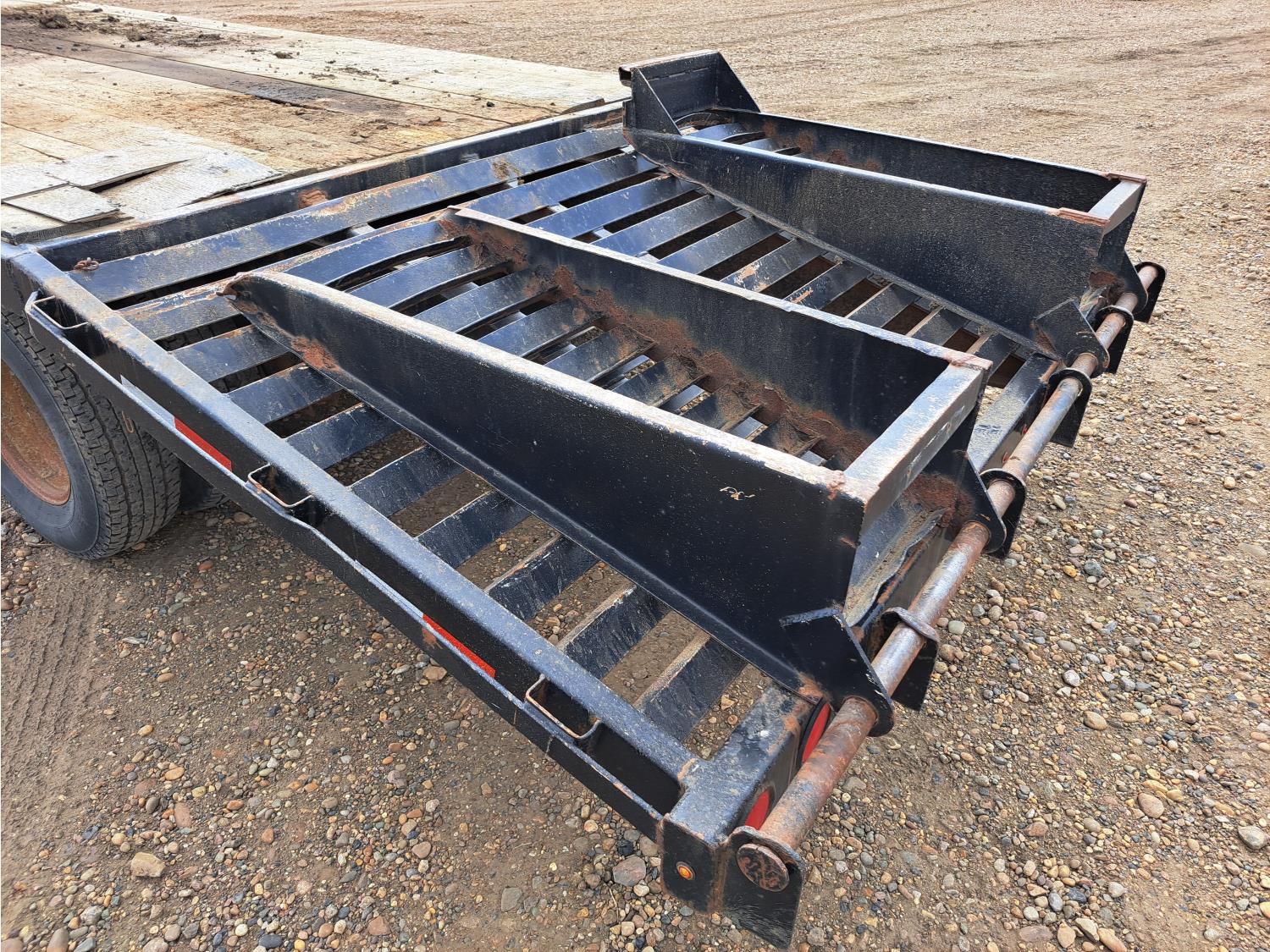 98 inch wide deck, wood deck, stake pockets, rub rails, 19 ft deck, 5 ft beaver tails, 4 ft ramps, 12,000 lb axles, spring suspension, 235/85R16 tires