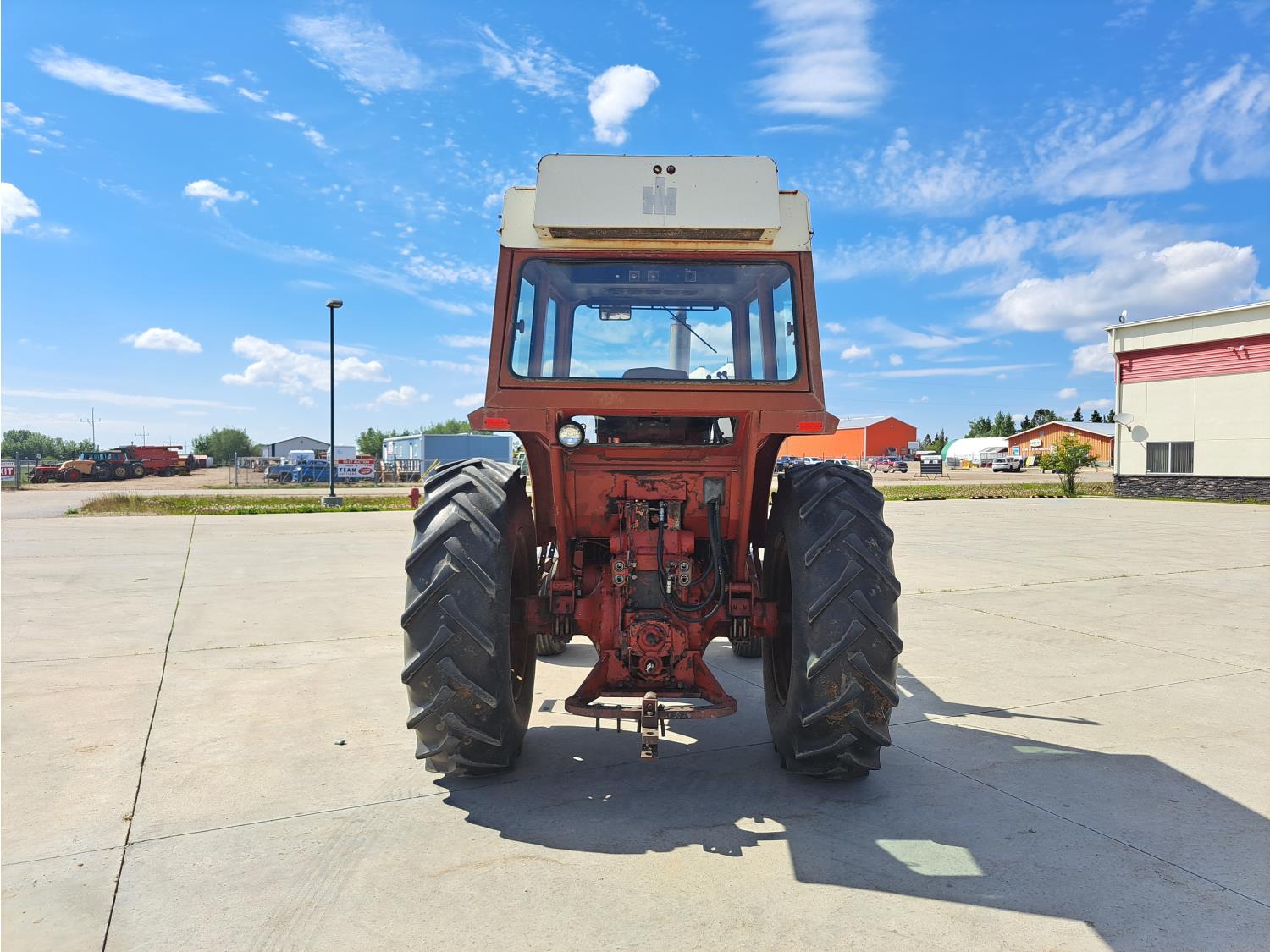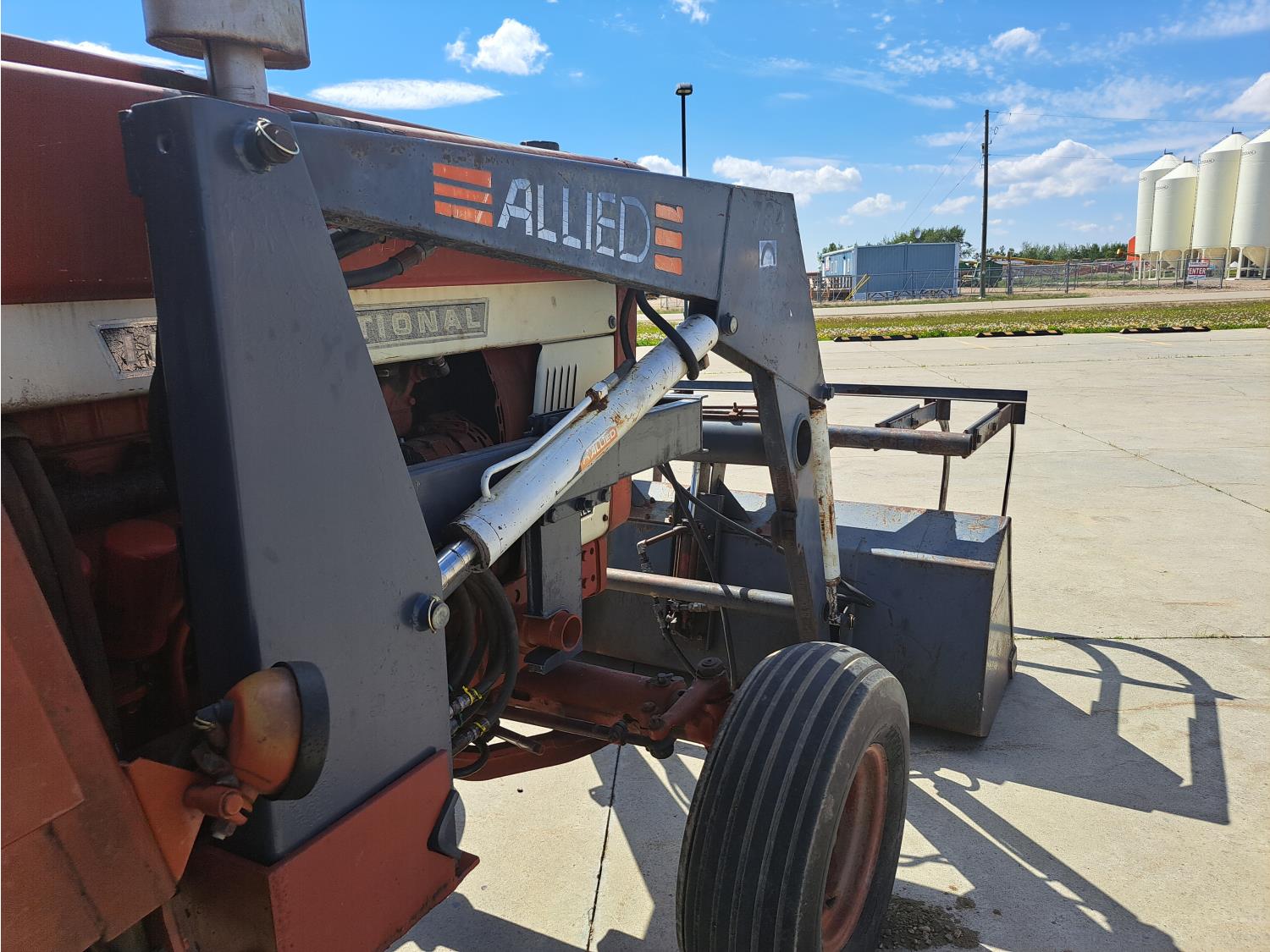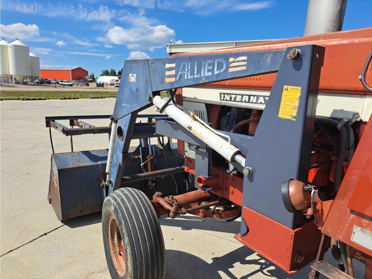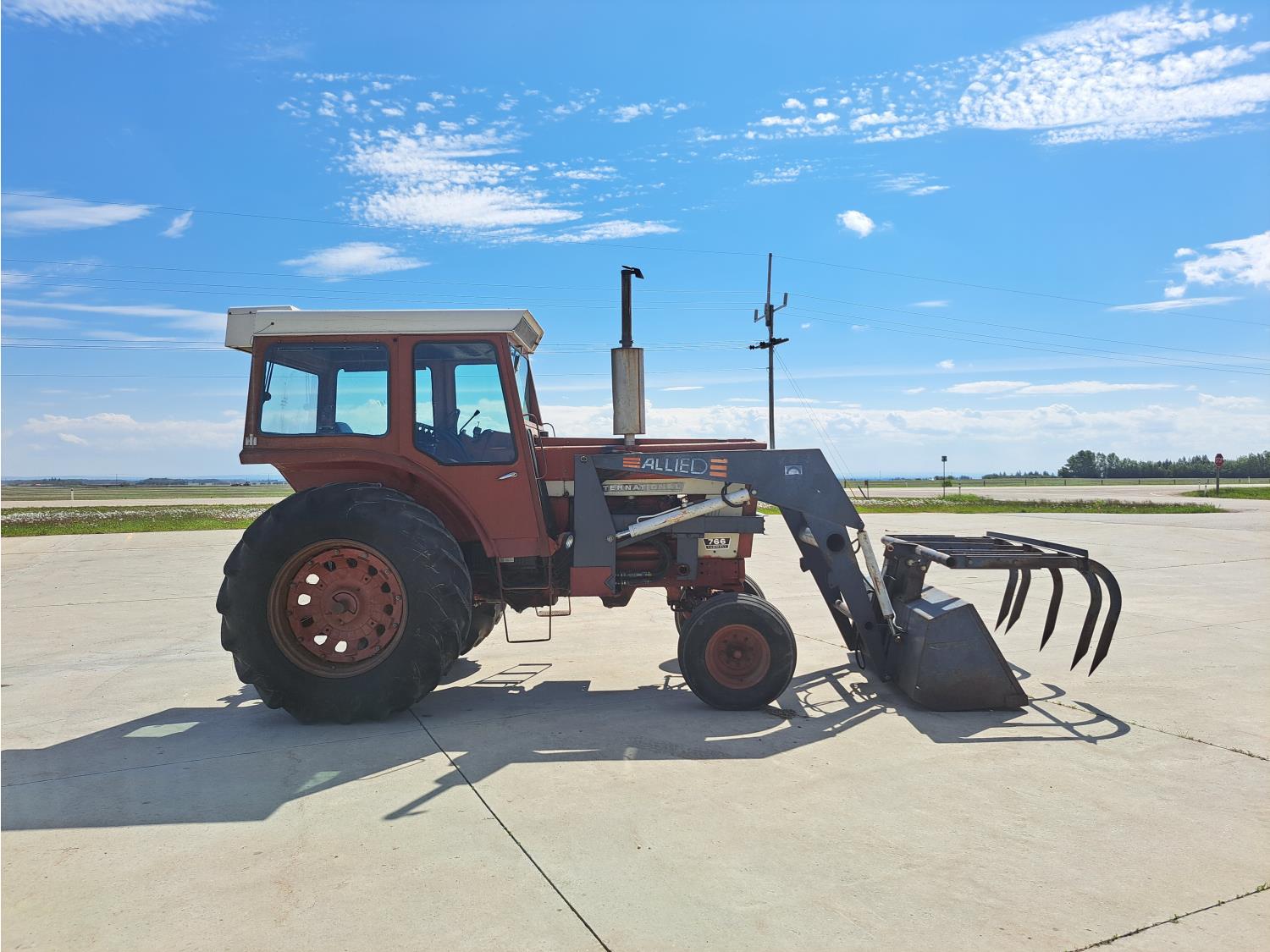 Allied 784 loader, 84 inch bucket, grapple, International HARVESTER 5.9 L 6 cylinder 88 HP, diesel engine, 85 PTO HP, 8 speed partial power shift transmission, cab, 540/1000 PTO, 2 rear hydraulic outlets, 12.5L-16 front tires, 18.4/15-34 rear tires