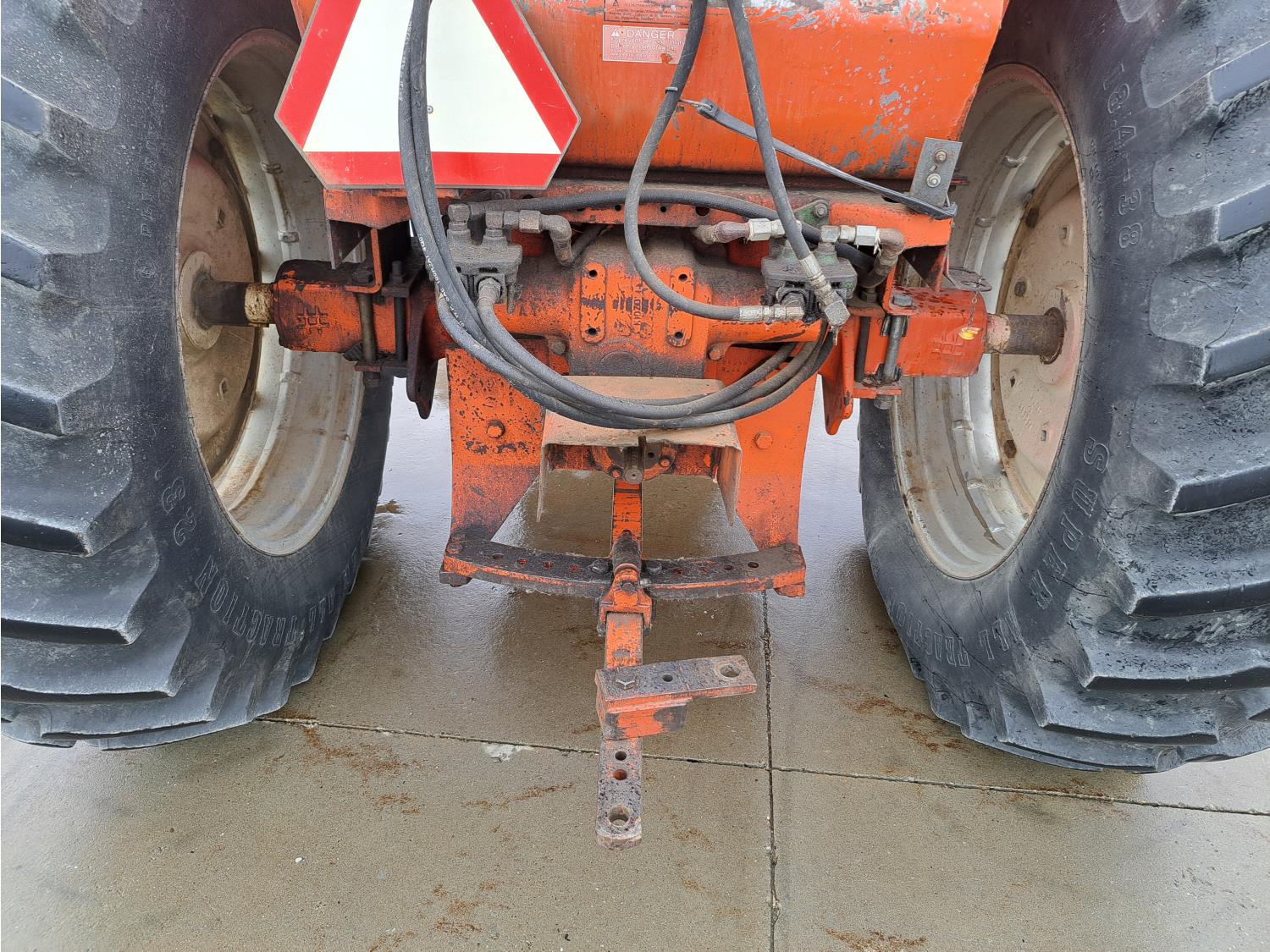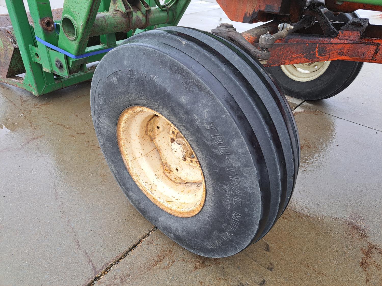 John Deere 48 loader, 60 inch bucket, bale forks, pallet forks, Allis Chalmers 4.9 L 6 cylinder 104 HP, diesel engine, 93 PTO HP, 8 speed manual transmission, cab, 540 PTO, 2 rear hydraulic outlets, rear wheel weights, 11L-15 front tires, 18.4-38 rear tires