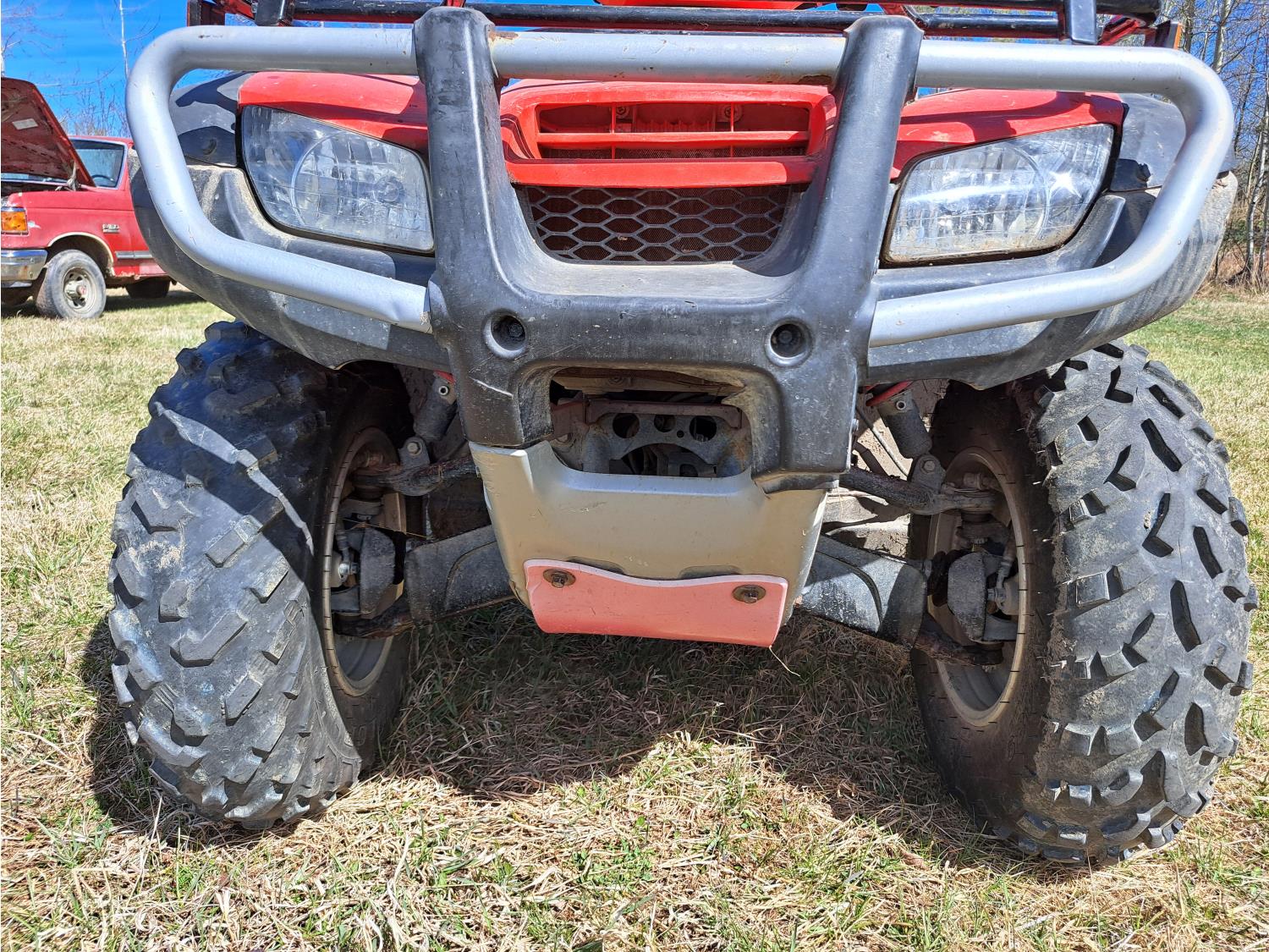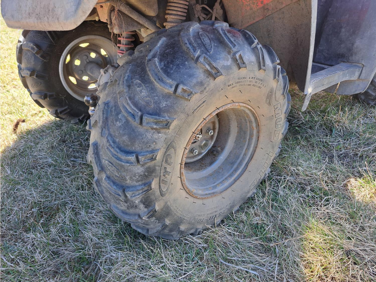 engine, automatic transmission, electric shift, reverse, hitch, front and rear racks, 25X8.00-12 front tires, 25X12.00-12 rear tires