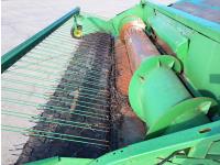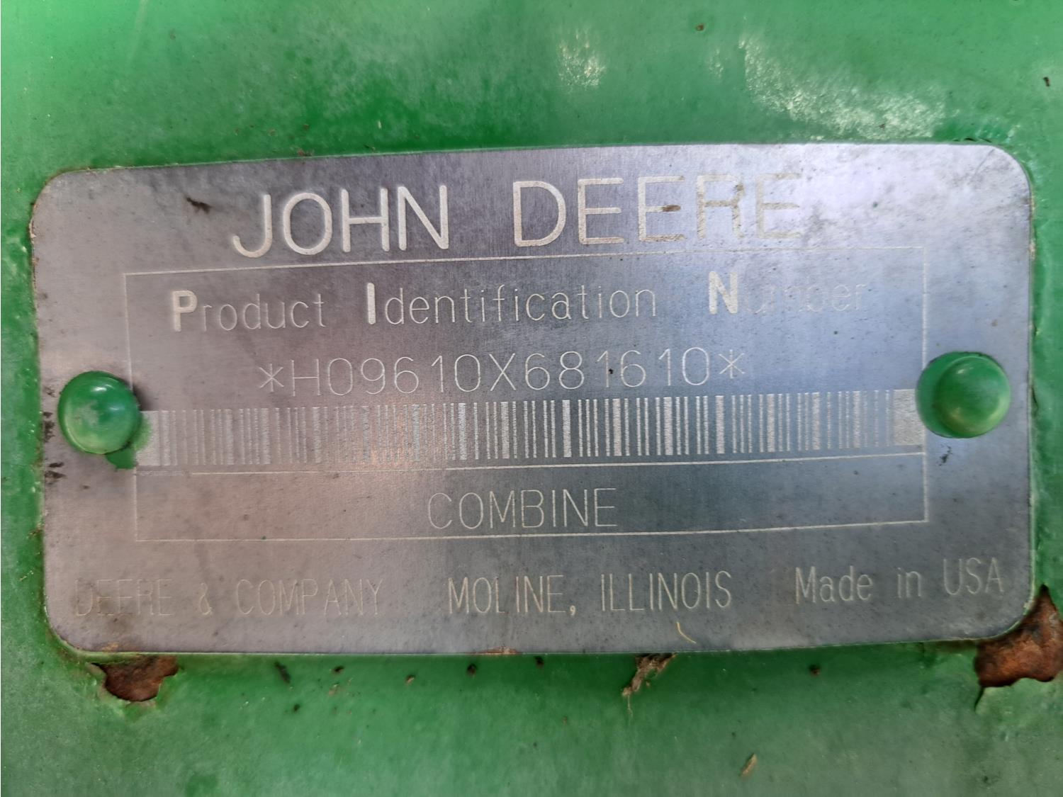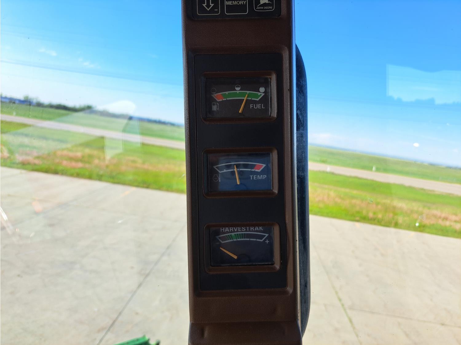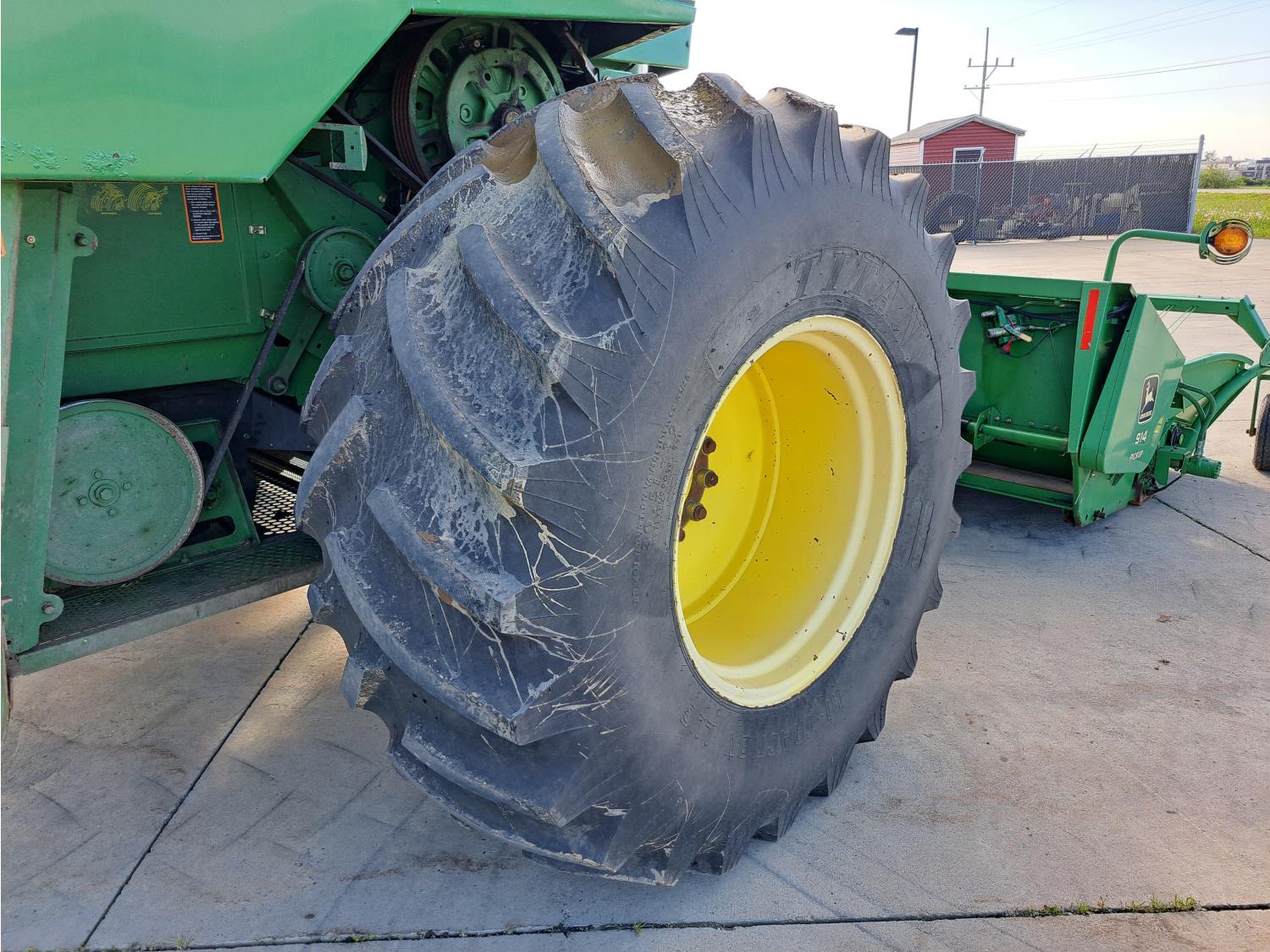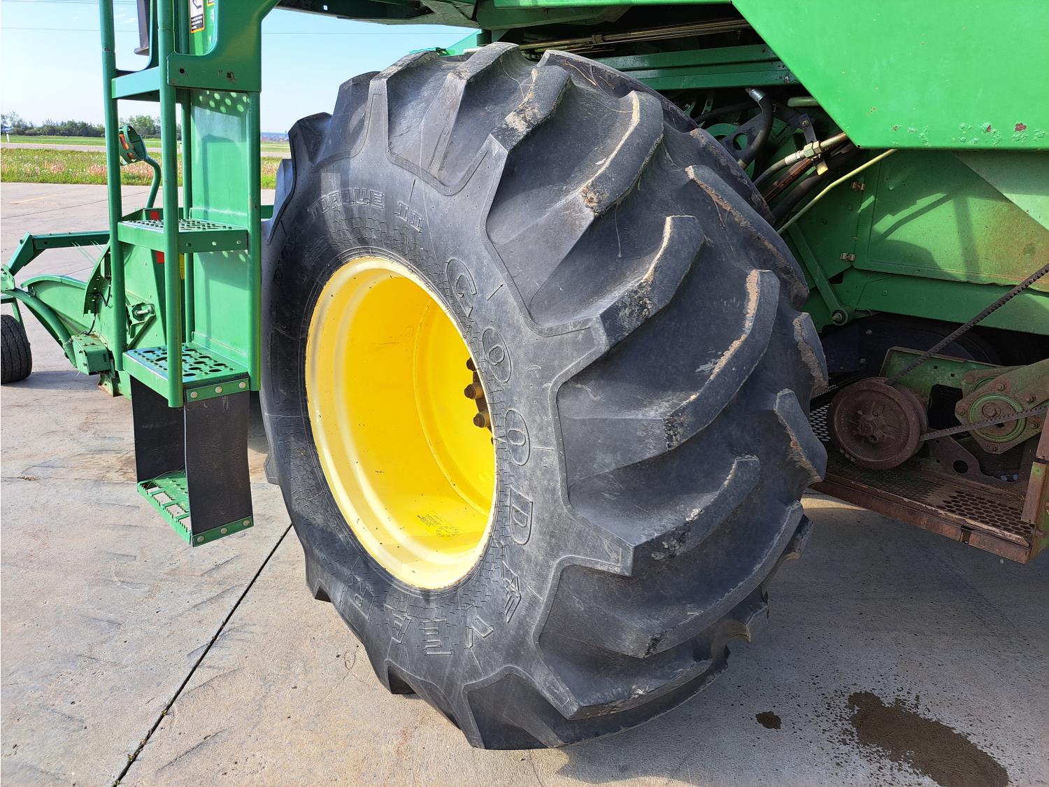 John Deere 914 13 ft pick-up header, variable speed reel, reverser, rock trap, chopper/straw spreader, grain tank extensions, 20 ft auger, A/C, radio, air ride seat, buddy seat, 30.5L-32 front tires, 16.9-24 rear tires