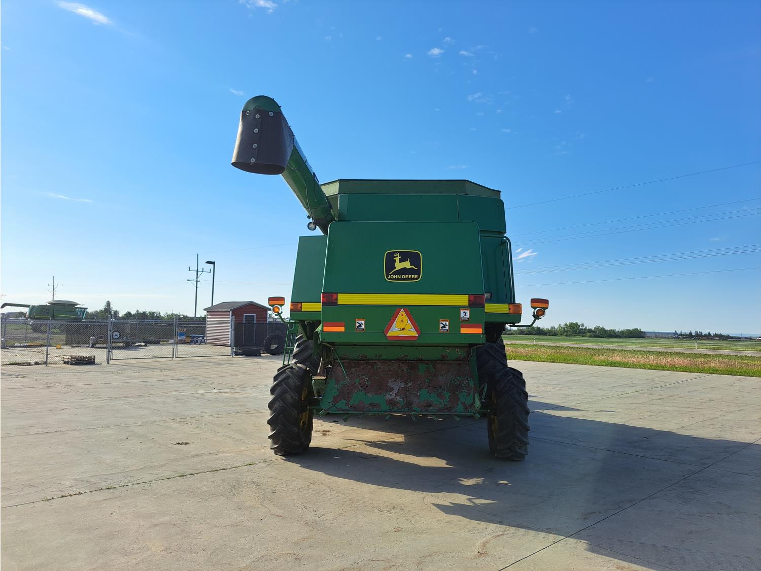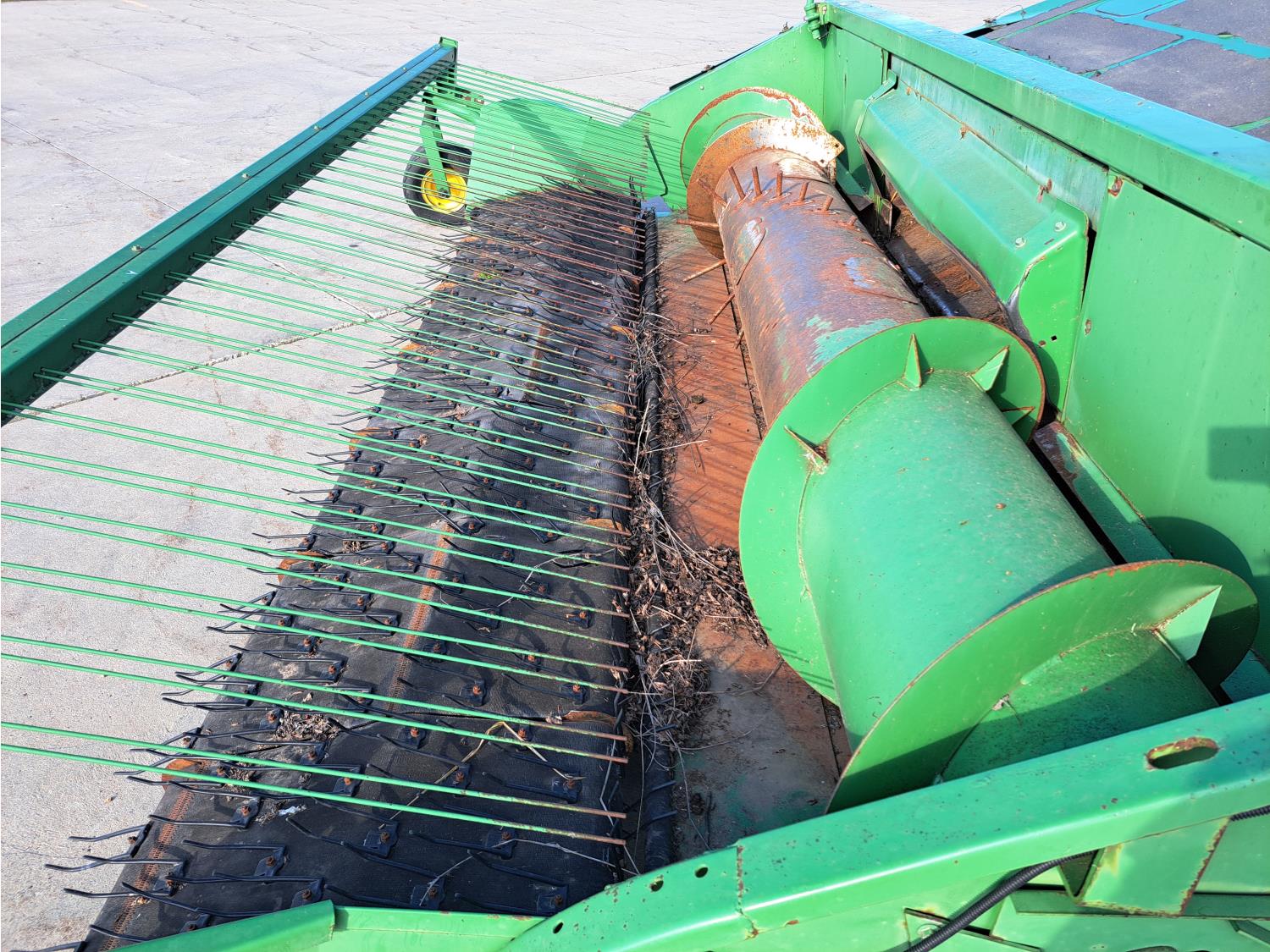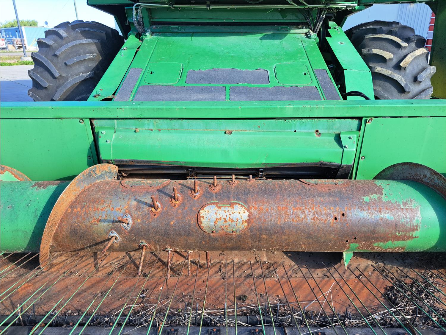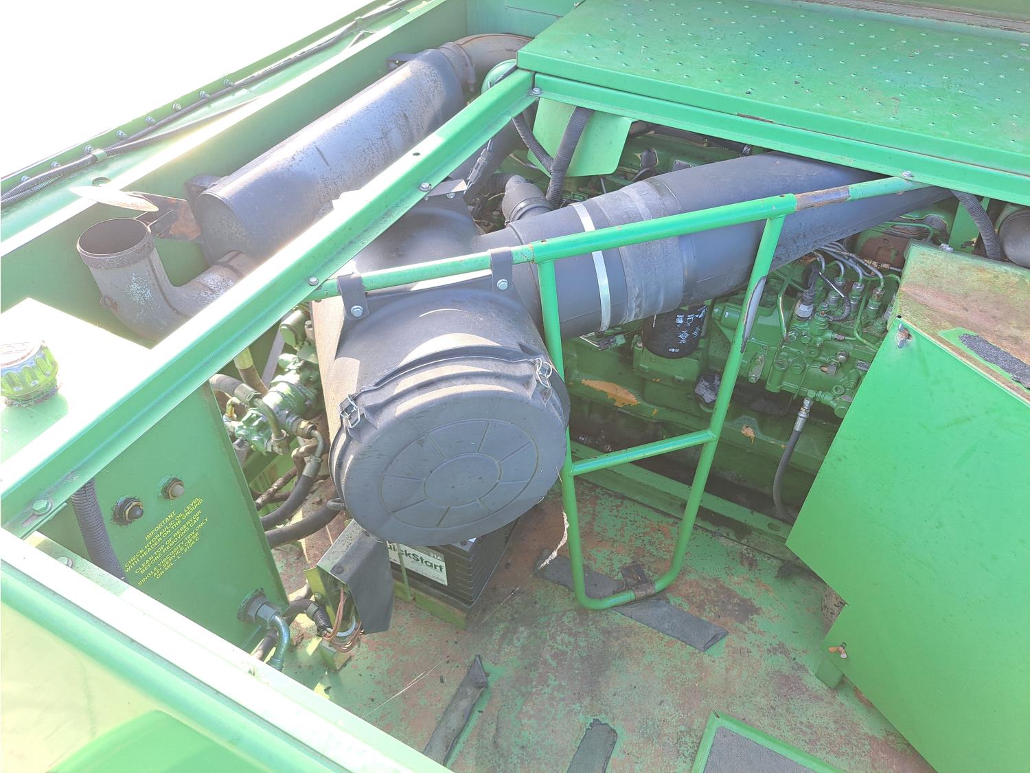 John Deere 914 13 ft pick-up header, variable speed reel, reverser, rock trap, chopper/straw spreader, grain tank extensions, 20 ft auger, A/C, radio, air ride seat, buddy seat, 30.5L-32 front tires, 16.9-24 rear tires