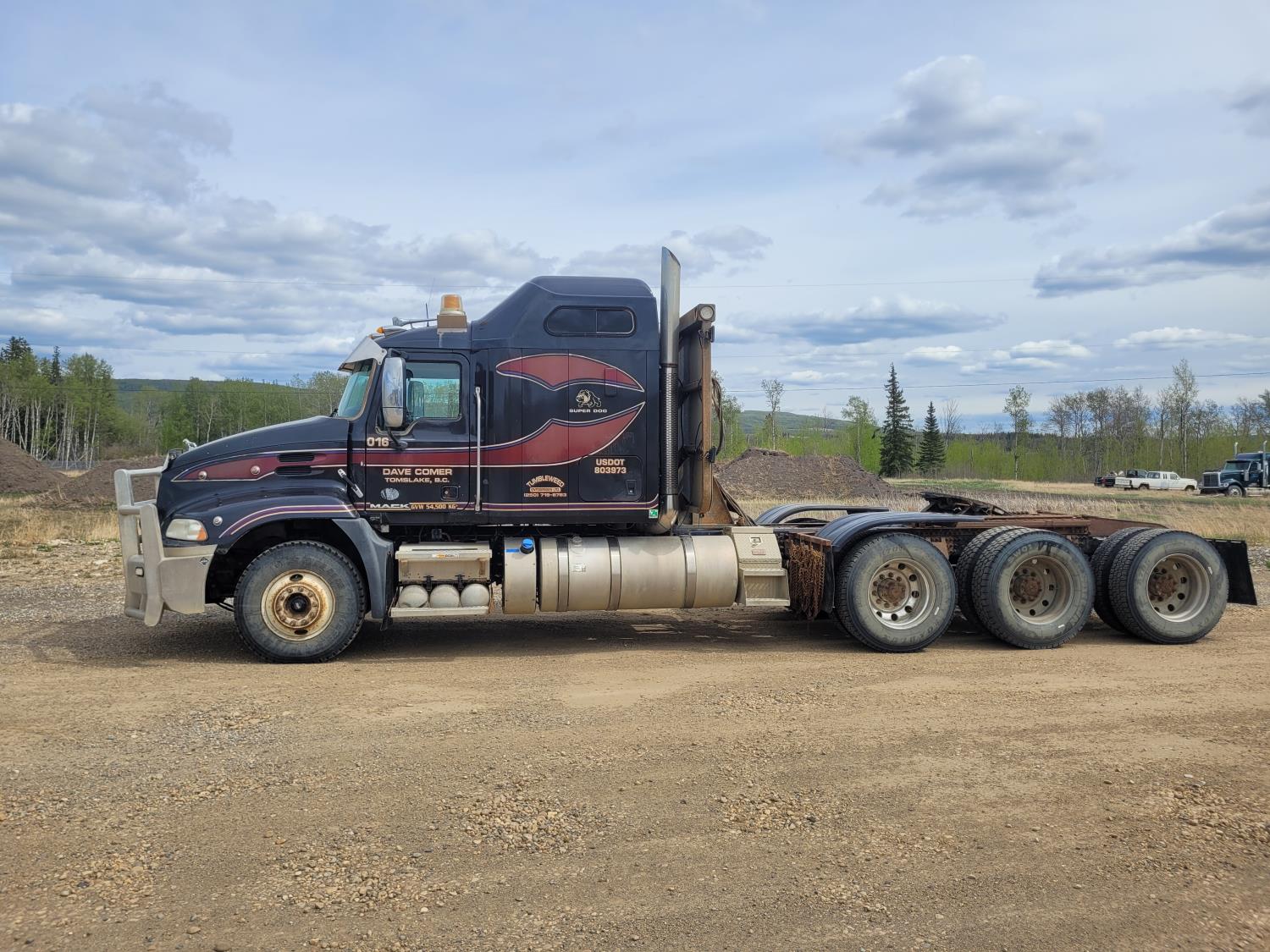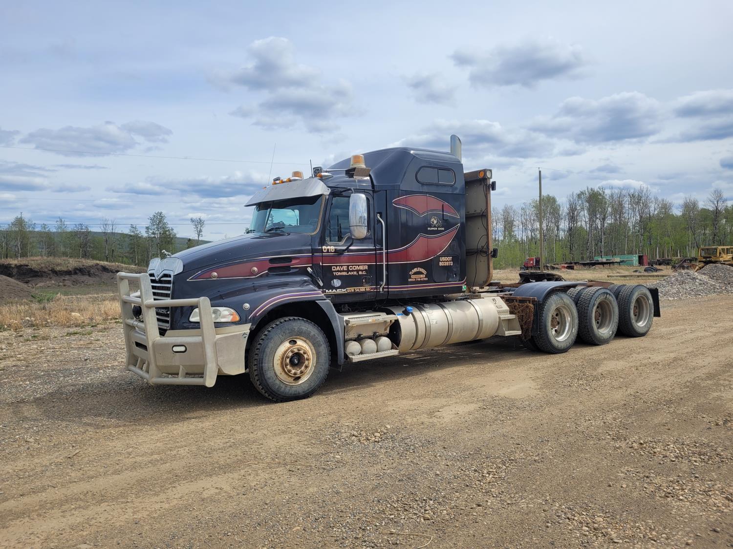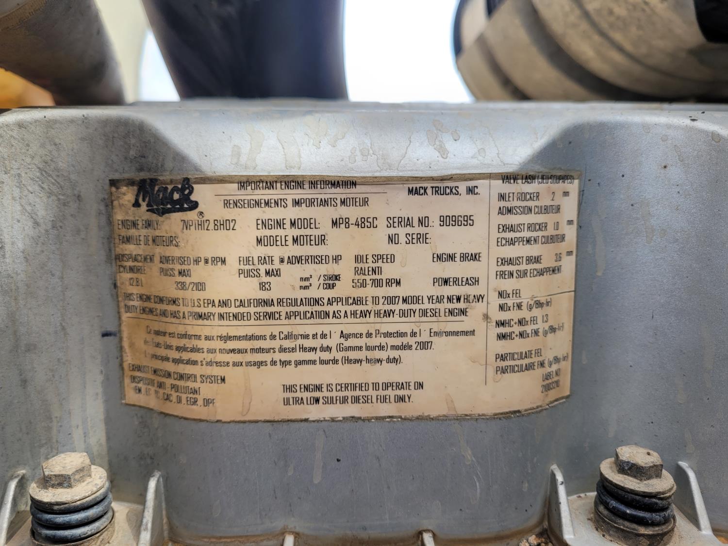 Mack MP8 485 505 HP diesel engine, emissions deleted, 18 speed transmission, sleeper, fridge, A/C, cruise control, leather interior, air ride seats, stereo, moose bumper, headache rack, Arctic HR, FGI rigging, PTO, air ride suspension, diff lock, Sliding 5th, all aluminum wheels, 11R24.5 rear tires
