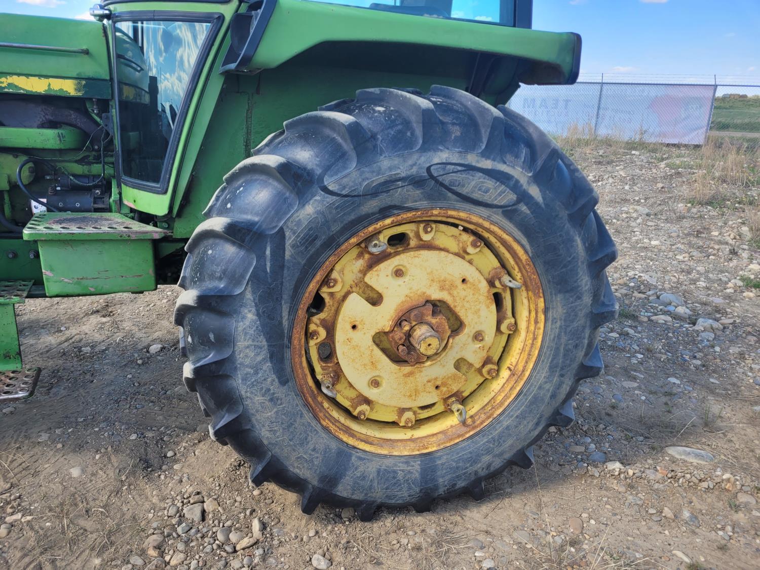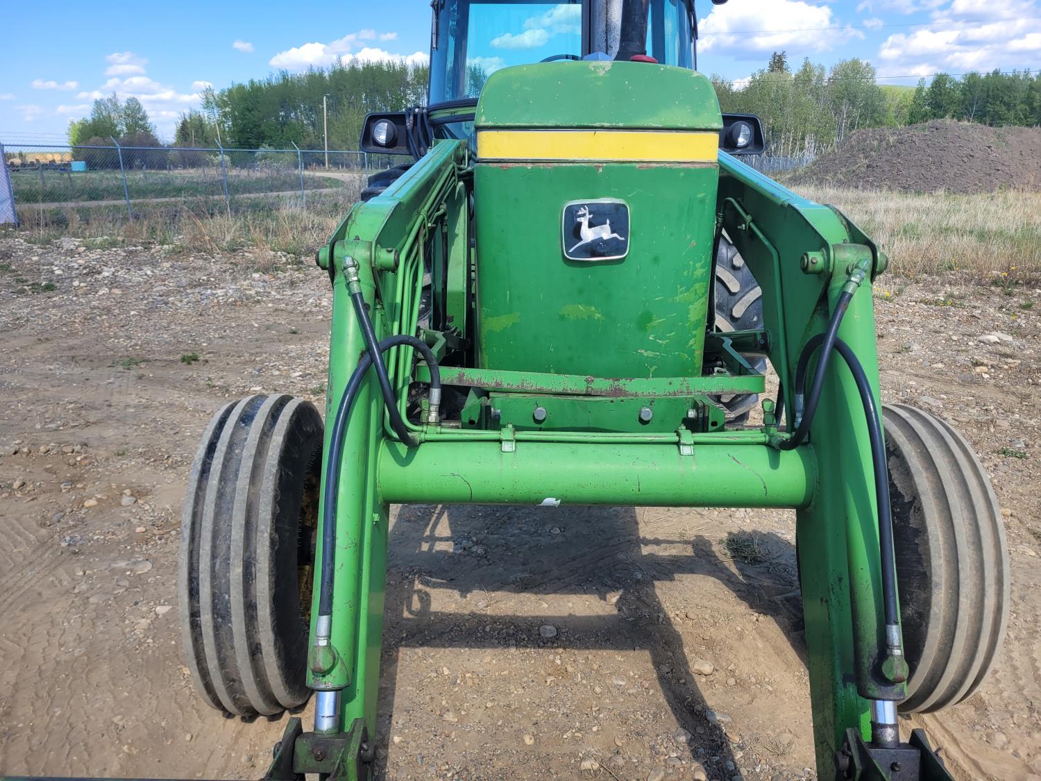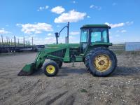 John Deere 148 loader, bucket, John Deere 6.6 L 6 cylinder 111 HP, diesel engine, 100 PTO HP, 8 speed John Deere power shift transmission, cab, radio, 540 PTO, 3 point hitch