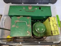 Cast iron sandwich maker, Coleman stove, Coleman lanterns, cast iron pot, Tupperware container, first aid kit log tongues and river boat/mattress pump