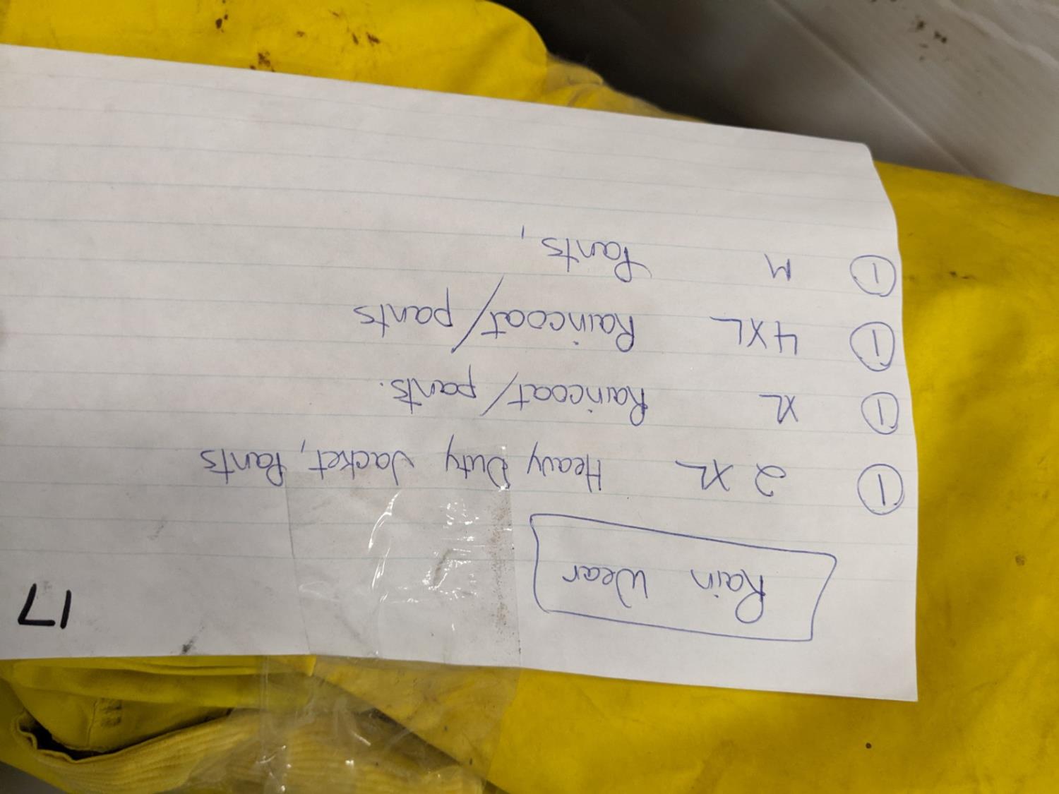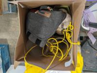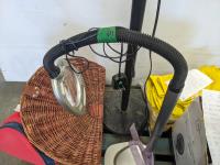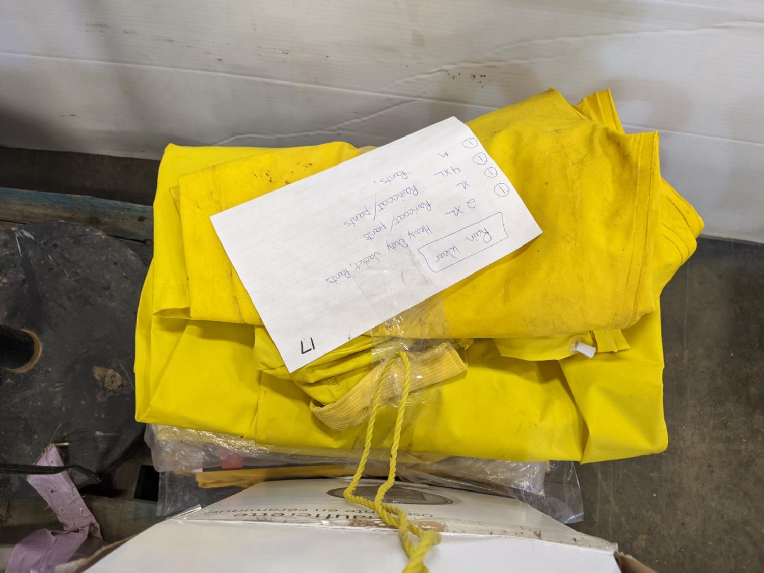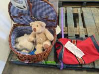 Work lamps, wicker picnic basket, 4 rain coats and assorted pet items