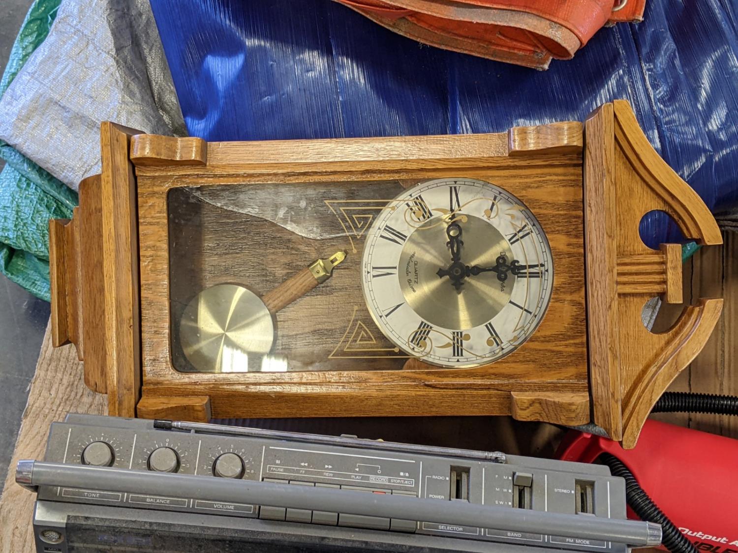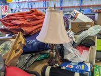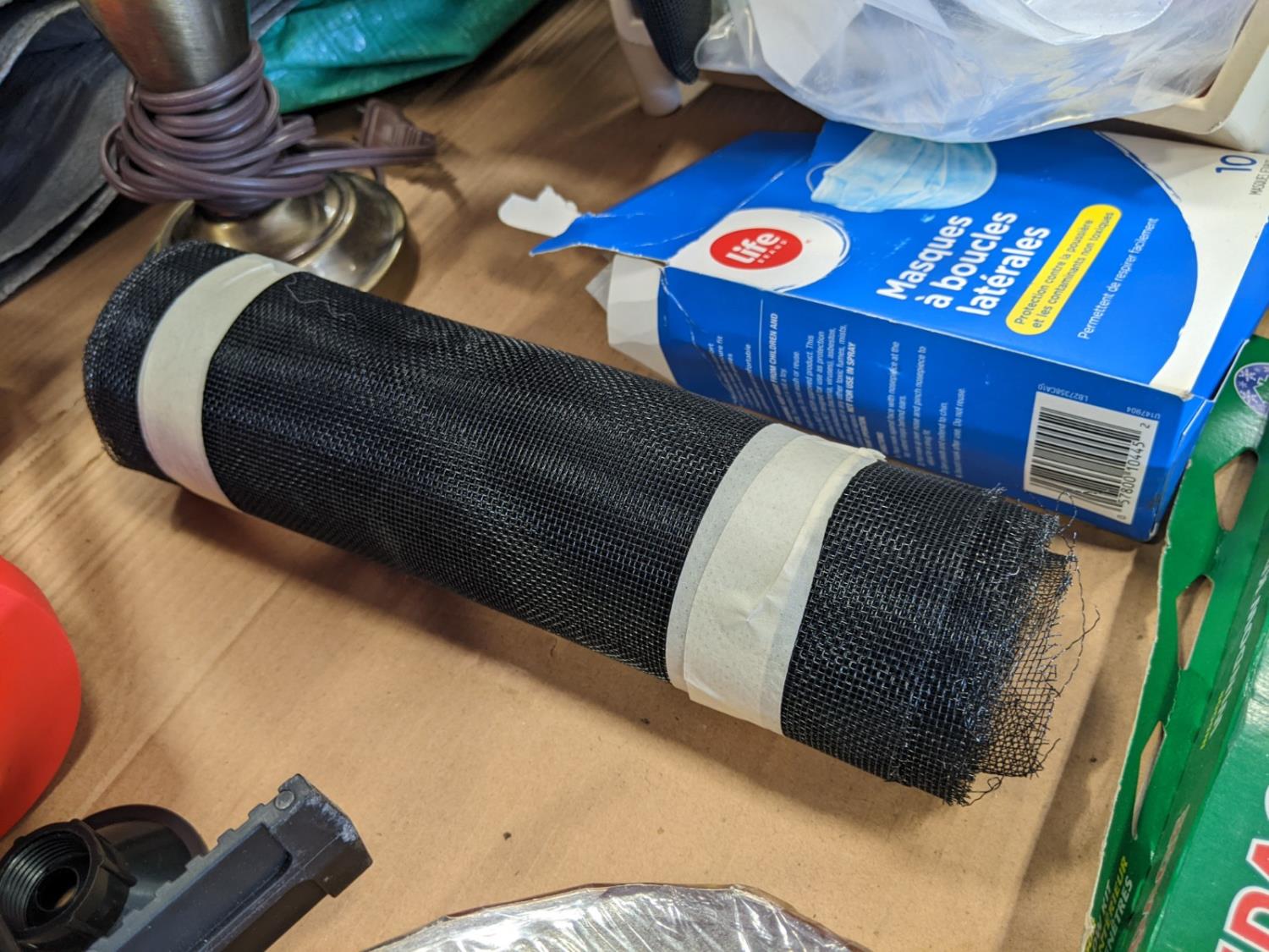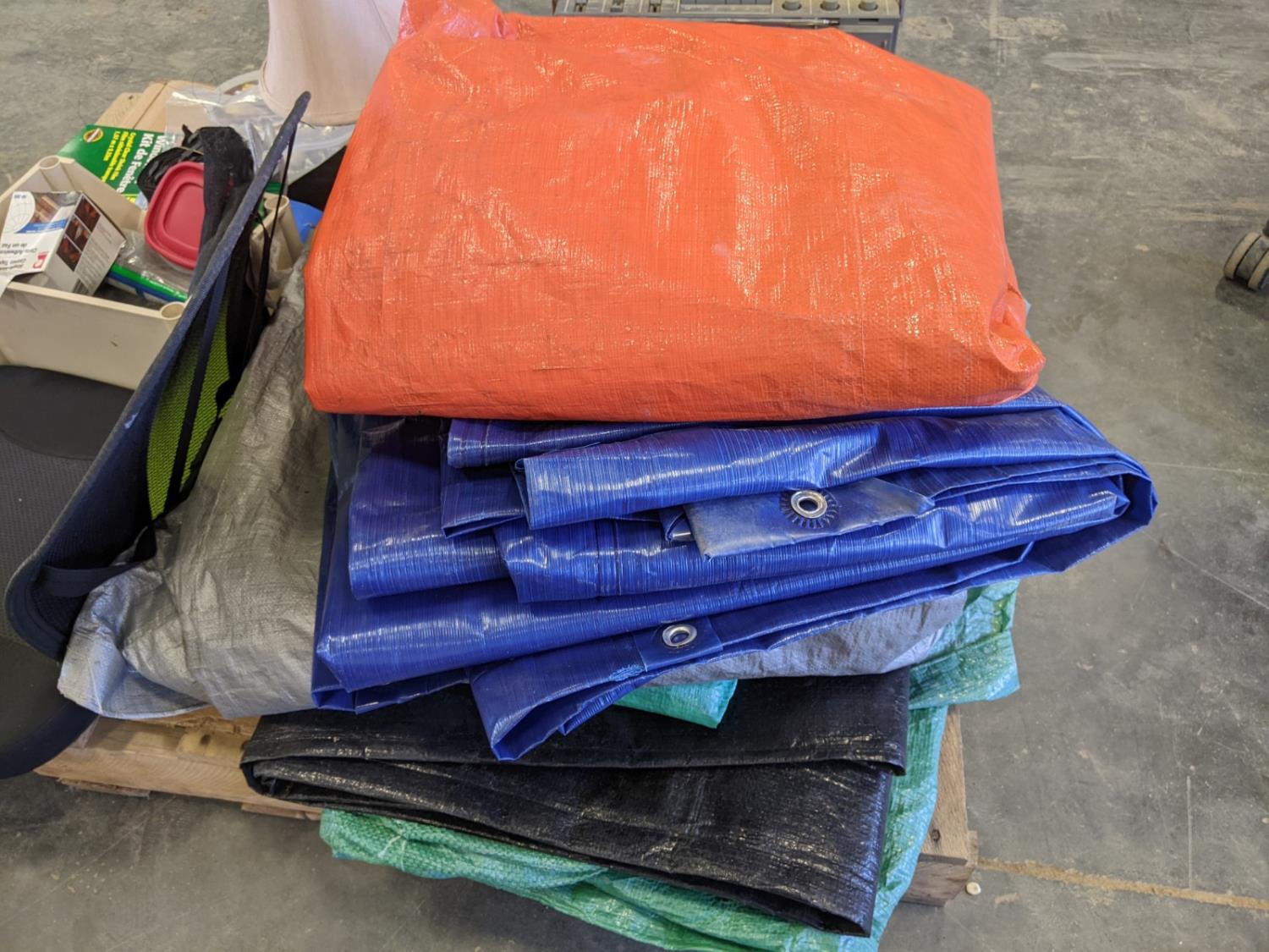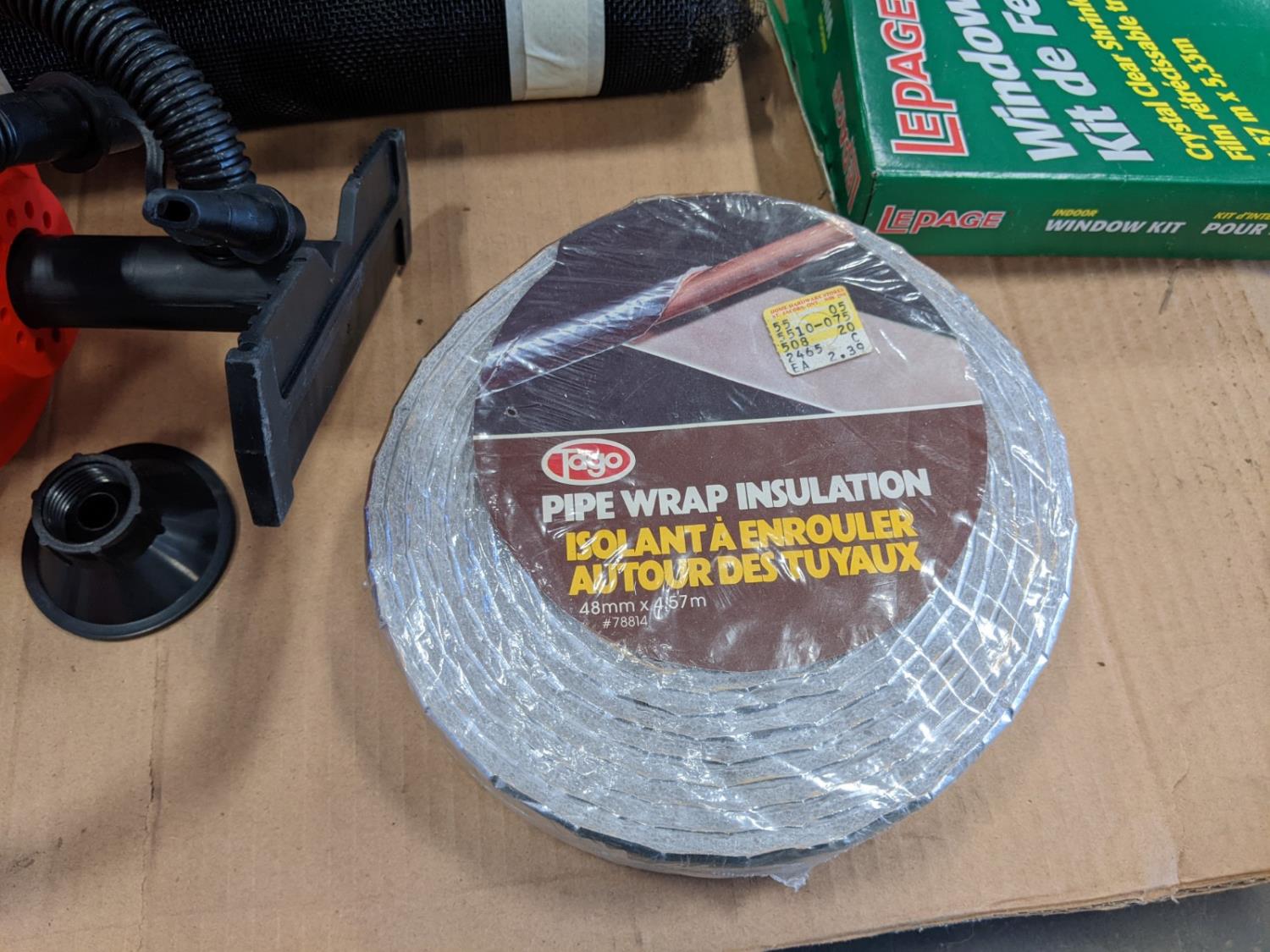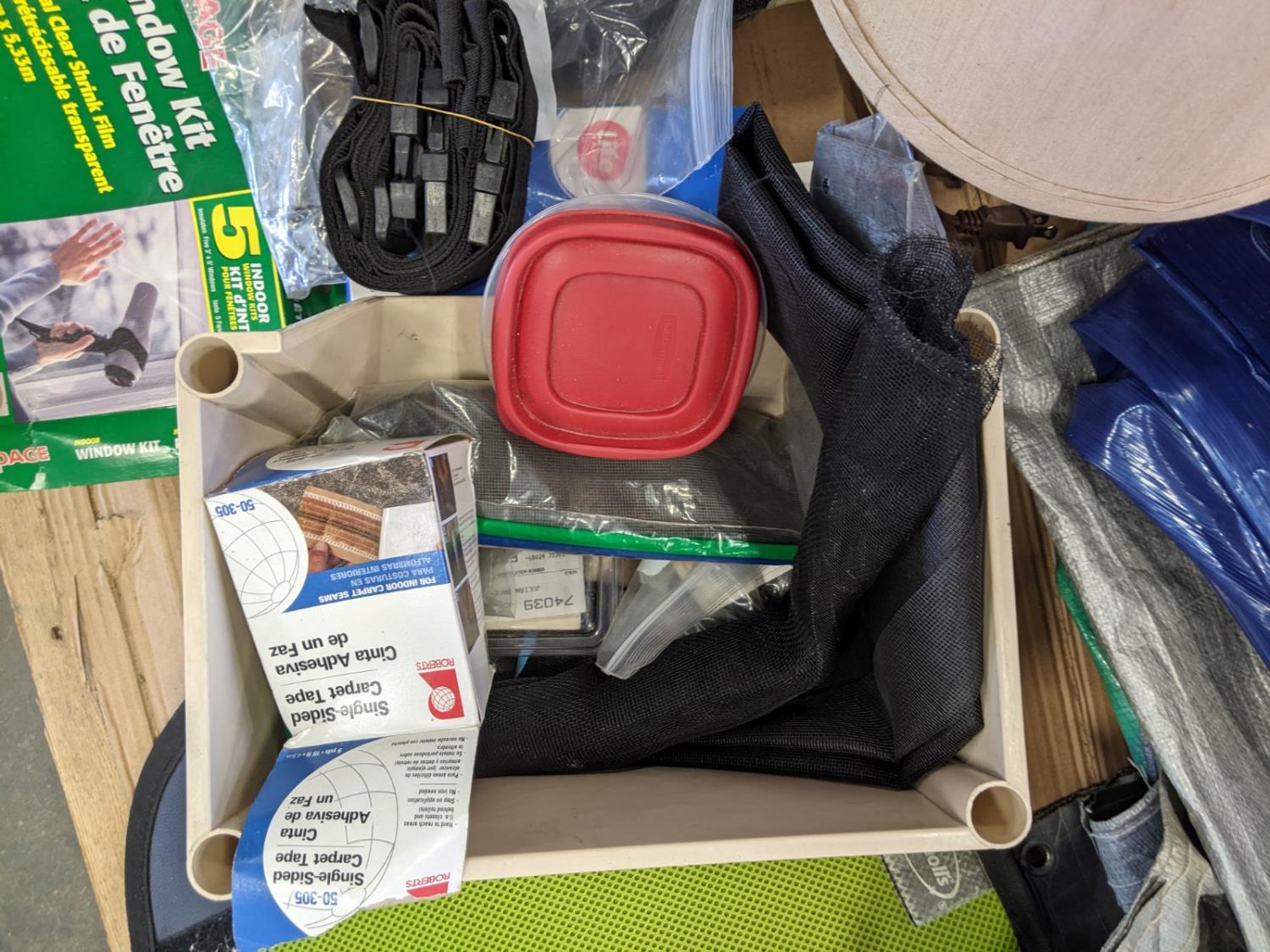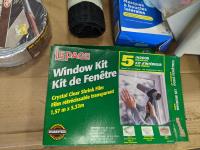 Radio, clack, lamp, chair cushion, tarps, window kit, pipe wrap insulation, wire mesh