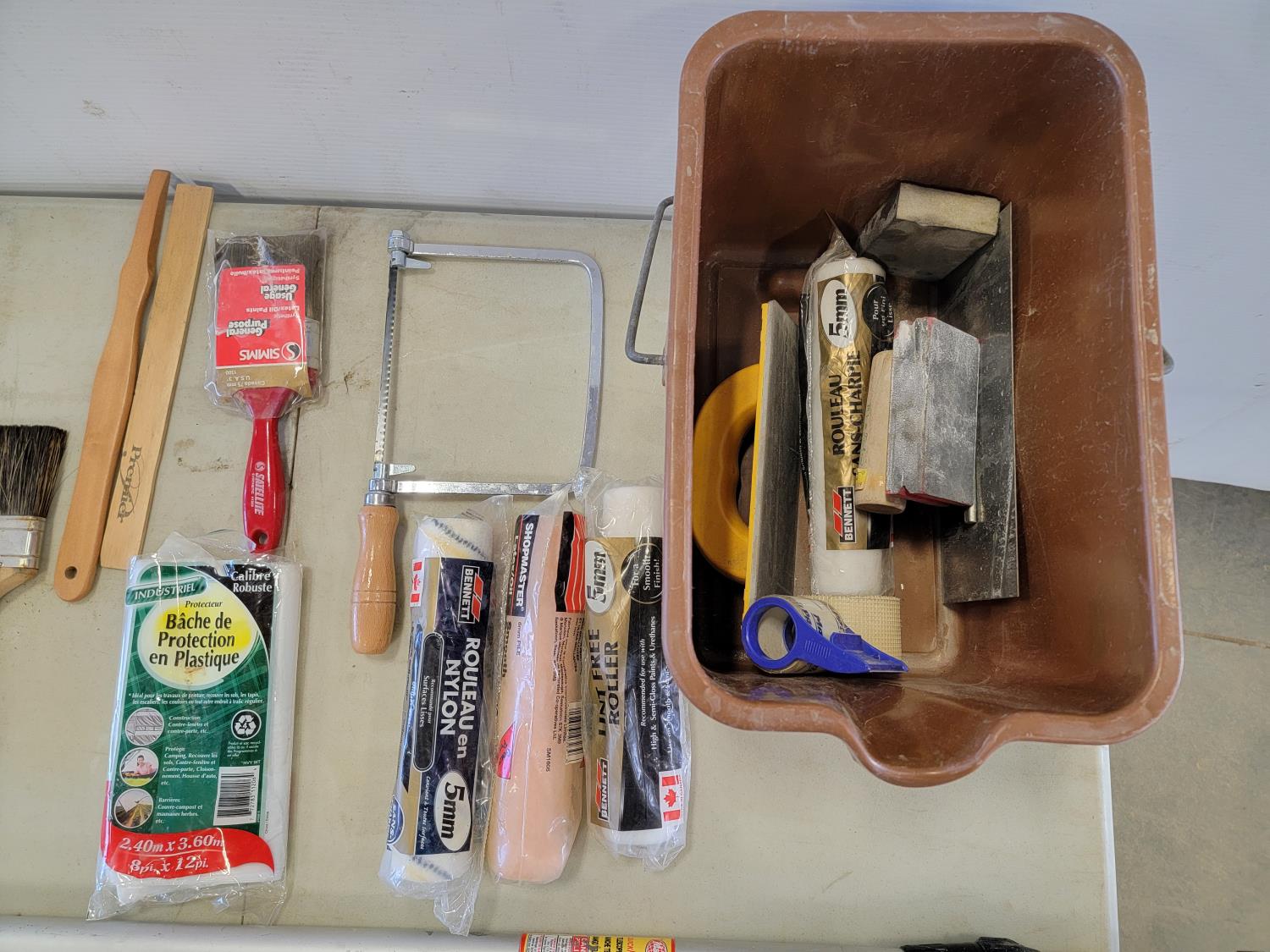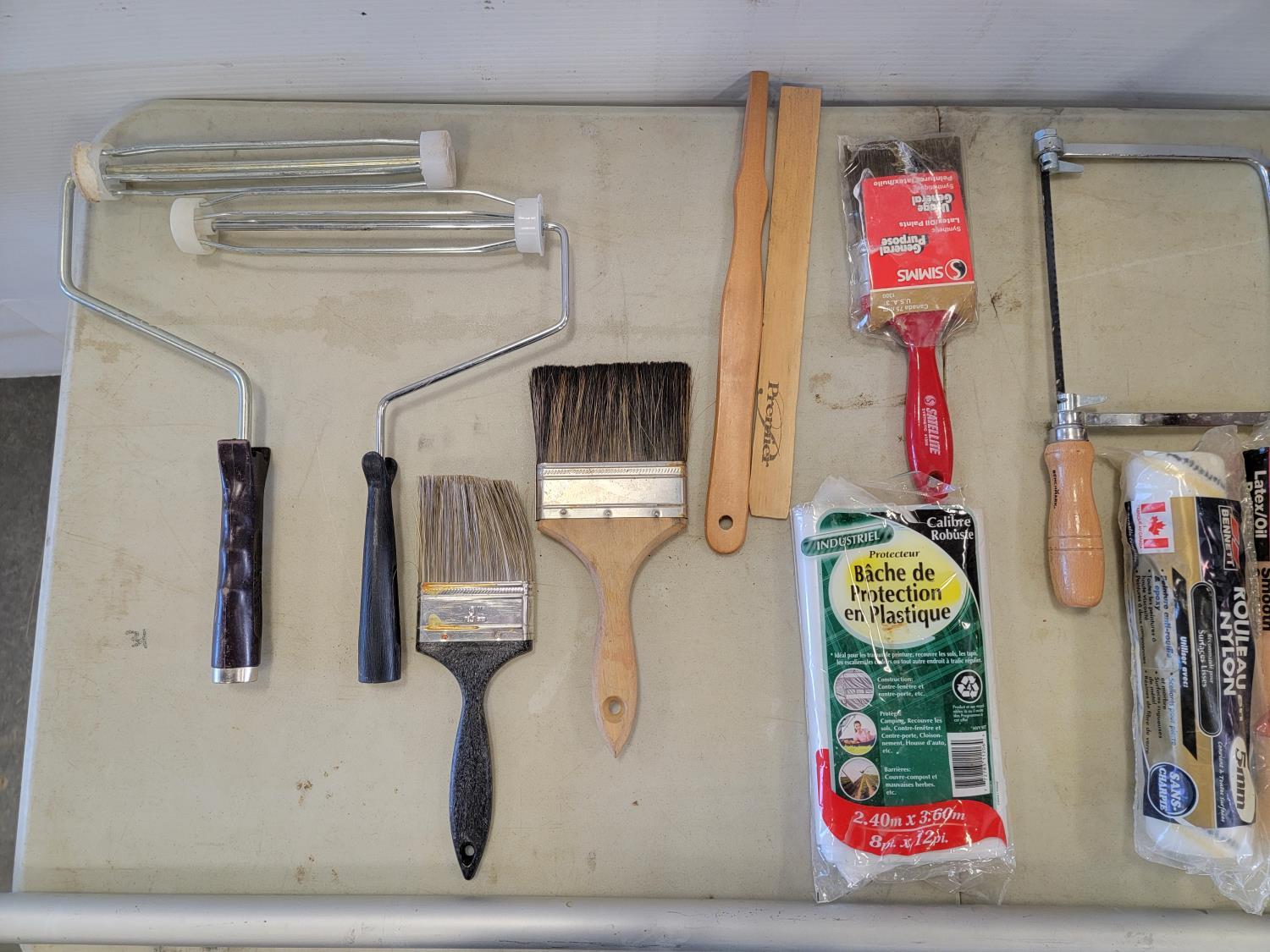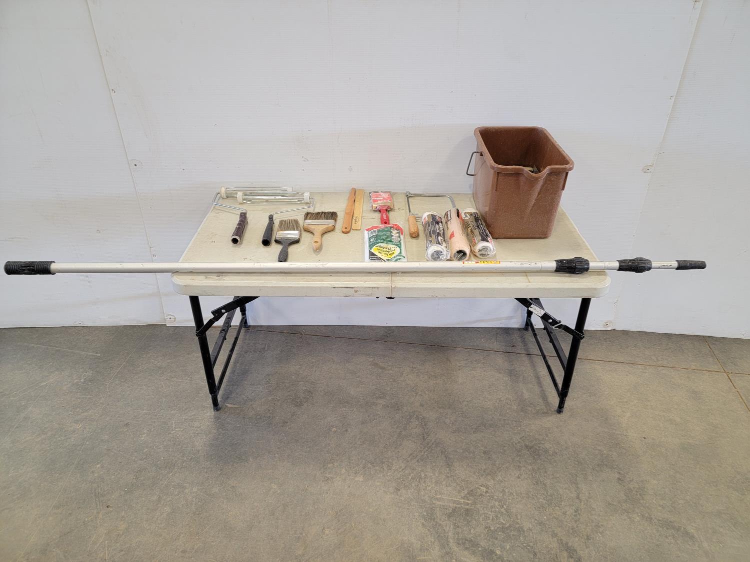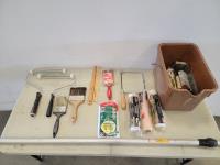 Paint rollers, paint brushes, stir sticks, hand saw, protective plastic, hand sanders, 18 ft telescopic handle