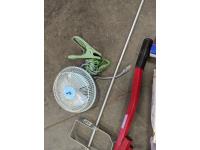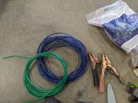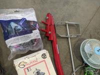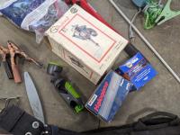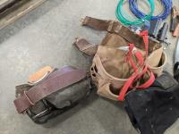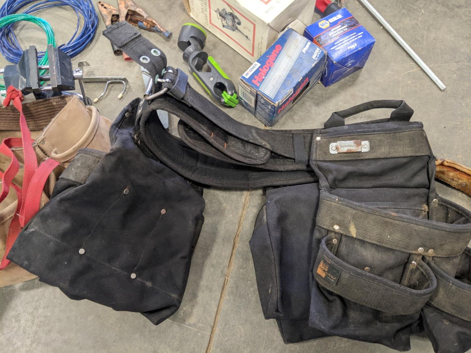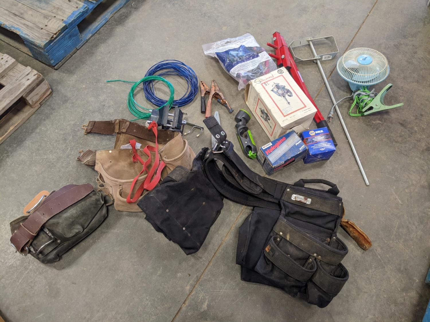 Tool belts, 3 M 1/2 piece silicone face masks, tabletop vise, deck board tightener, mud mixer for drill, wire, halogen head lamp, new distributor cap, clip on flashlight, clip on fan, knife stone, exterior lantern light
