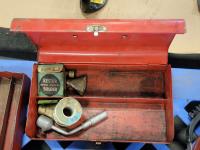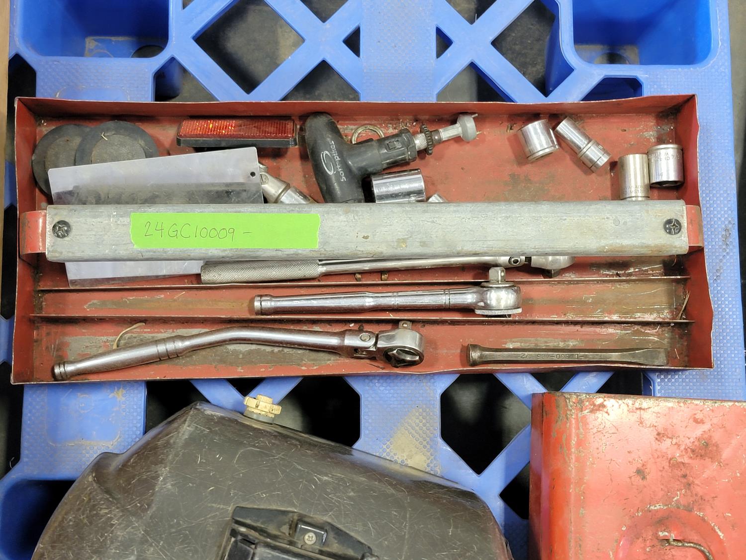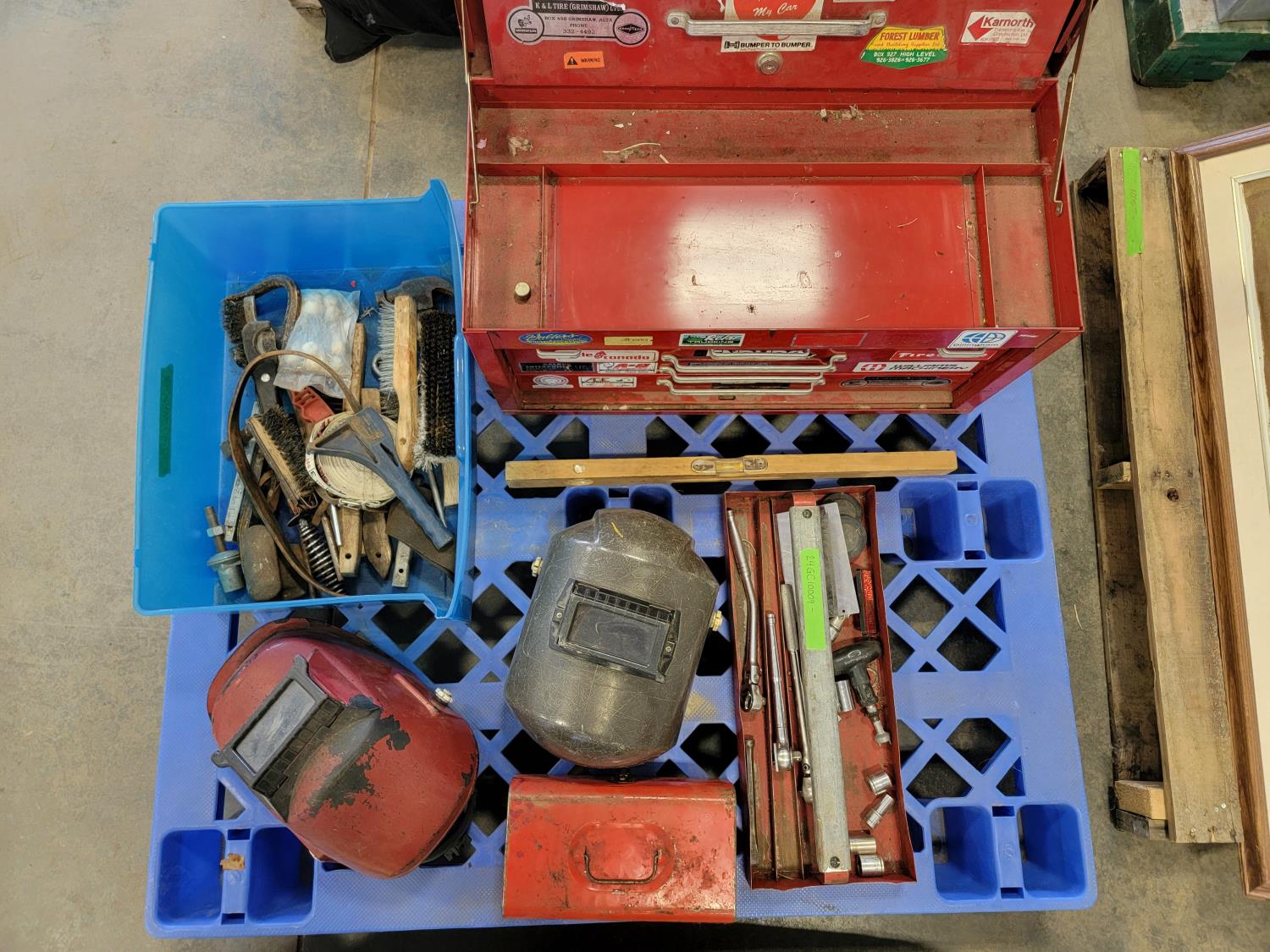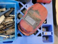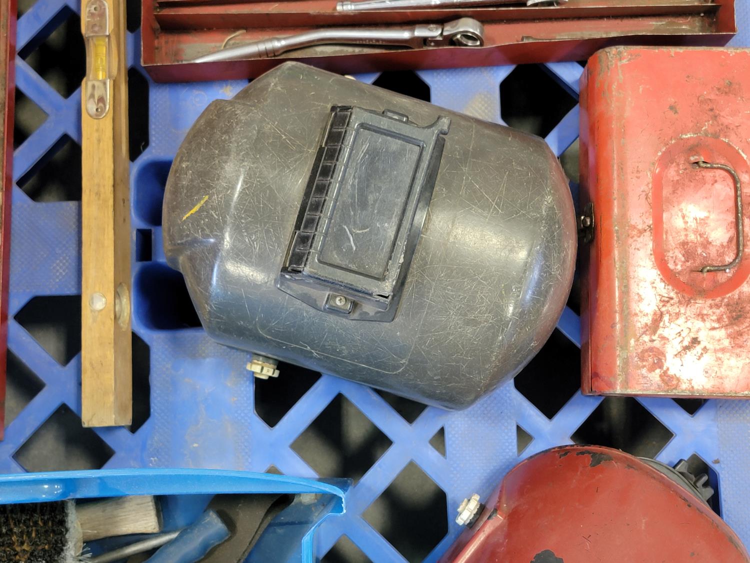 tool box, welding masks, wire brushes, measuring tapes, ratchets