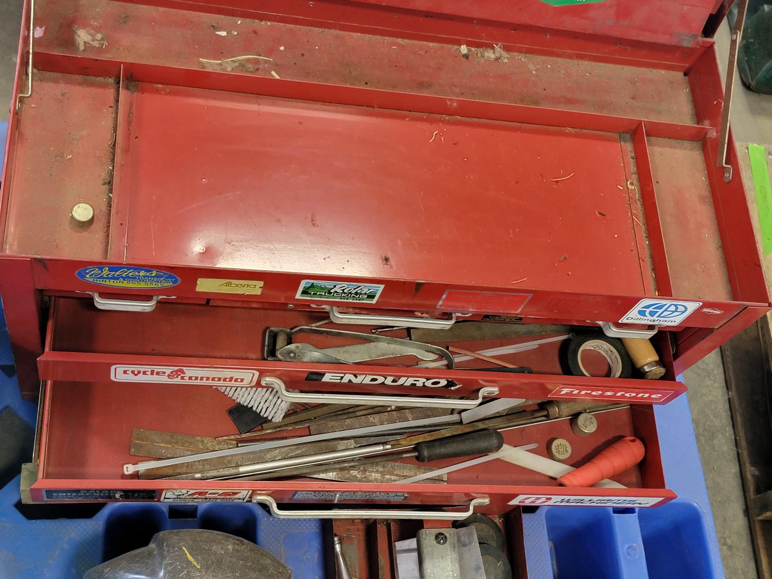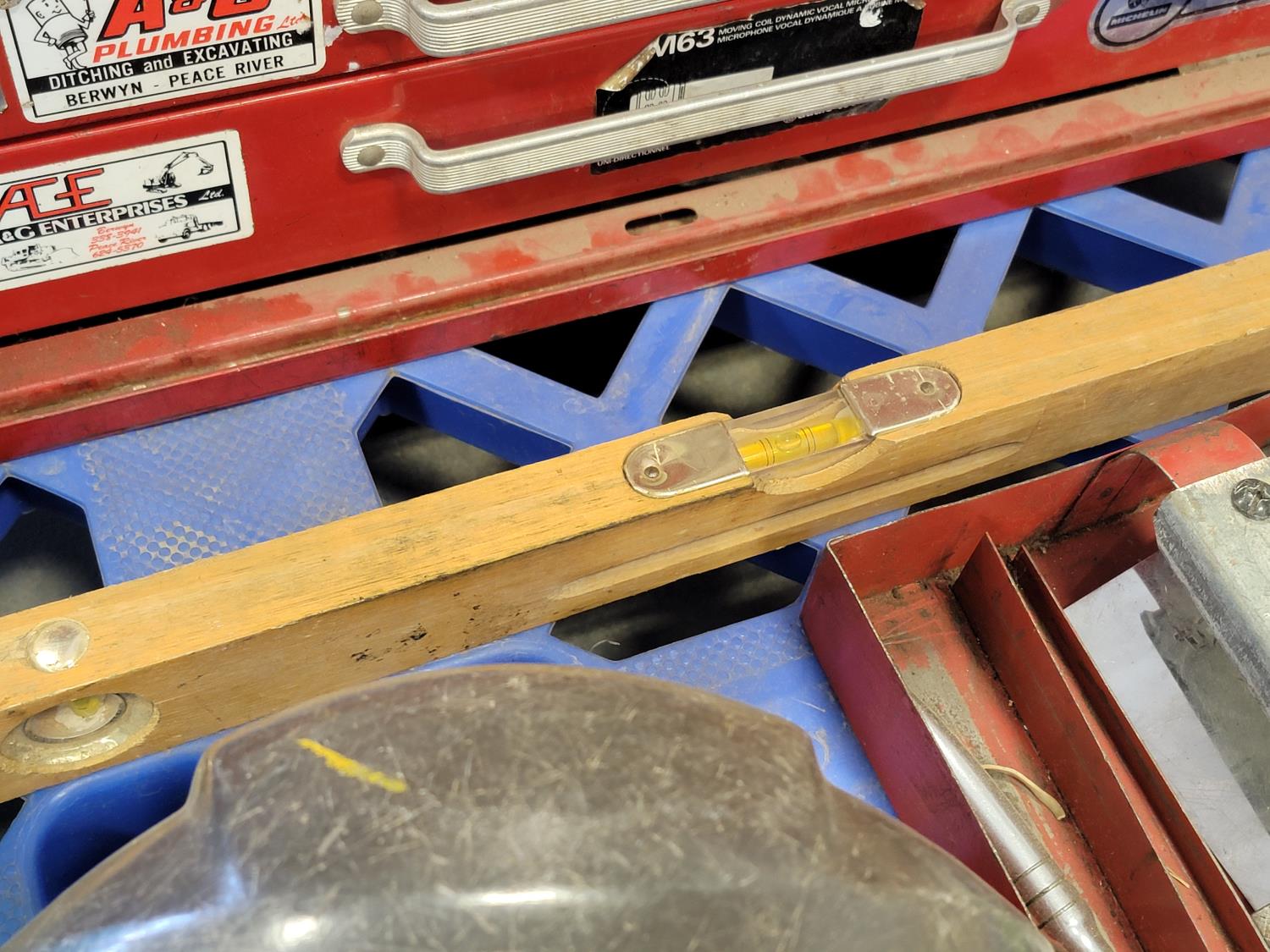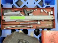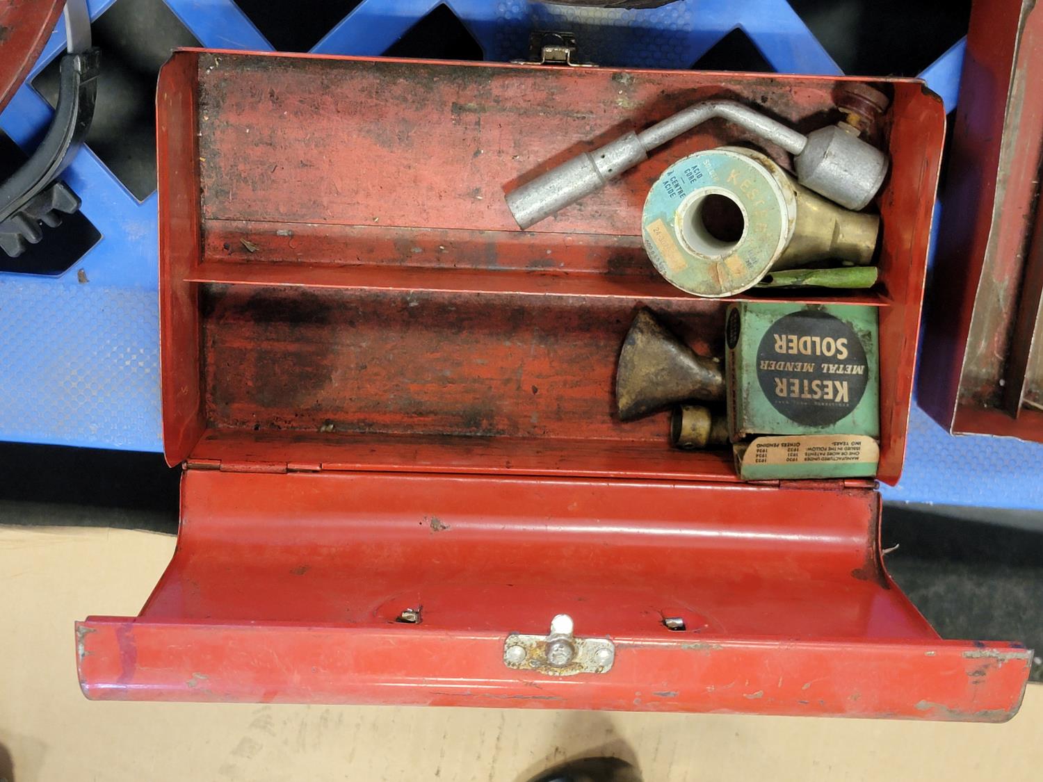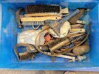tool box, welding masks, wire brushes, measuring tapes, ratchets