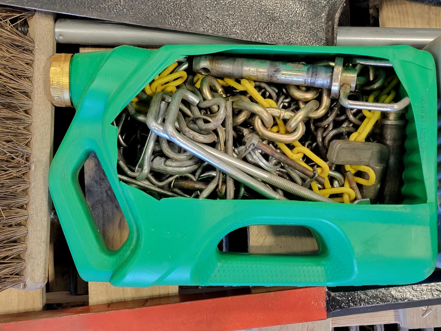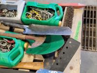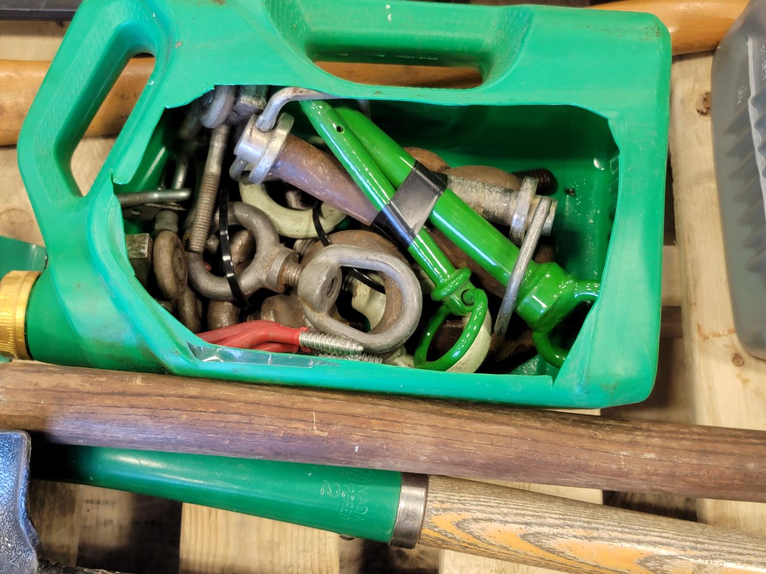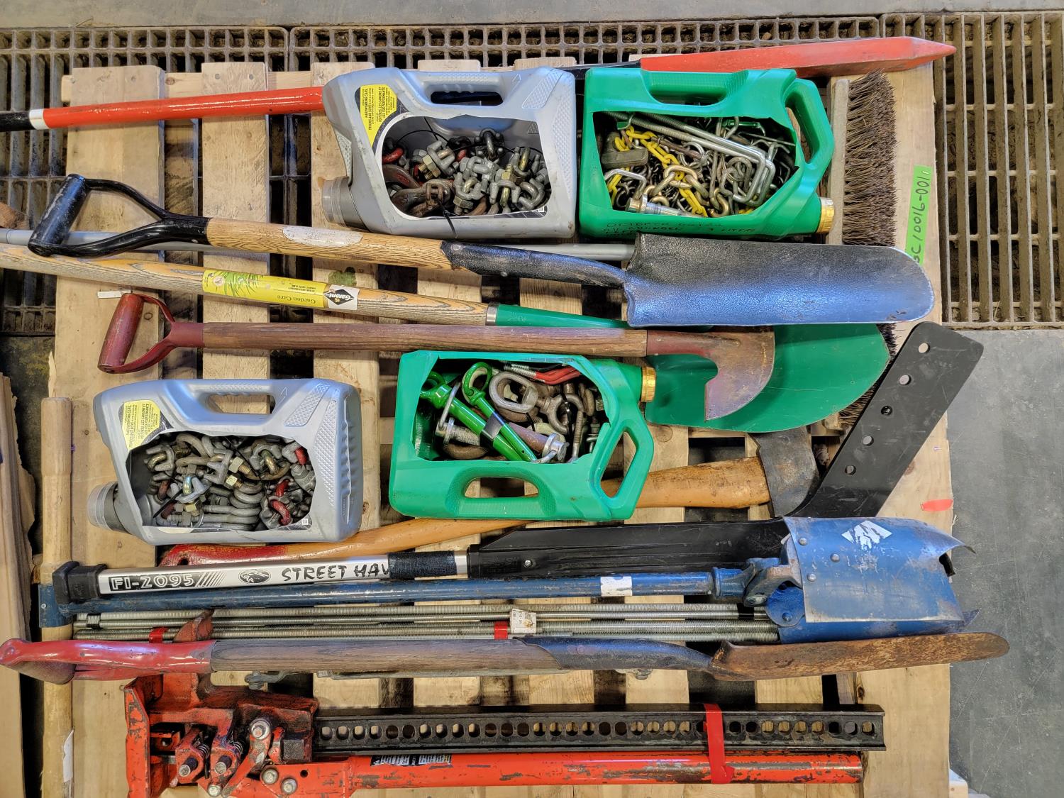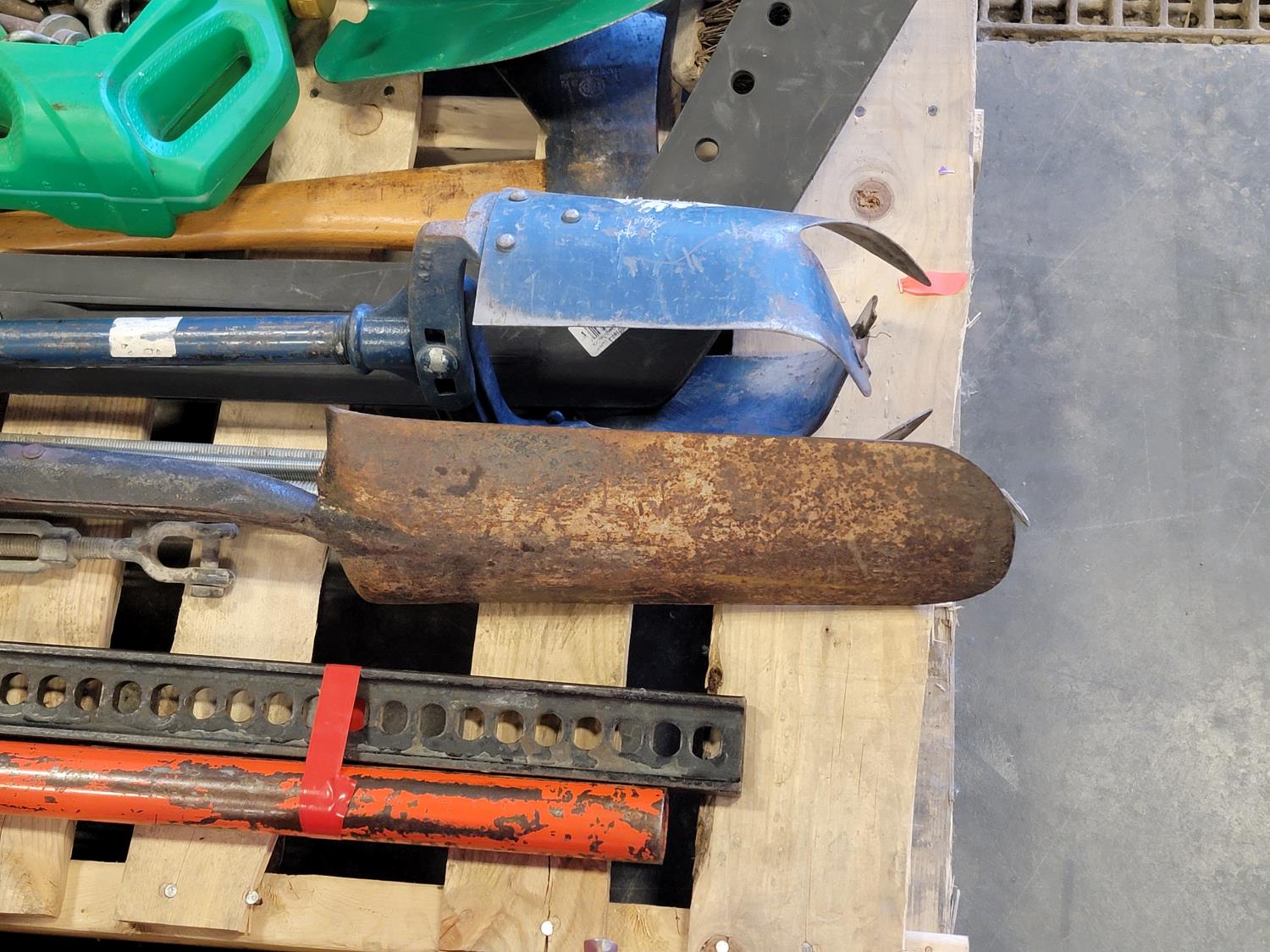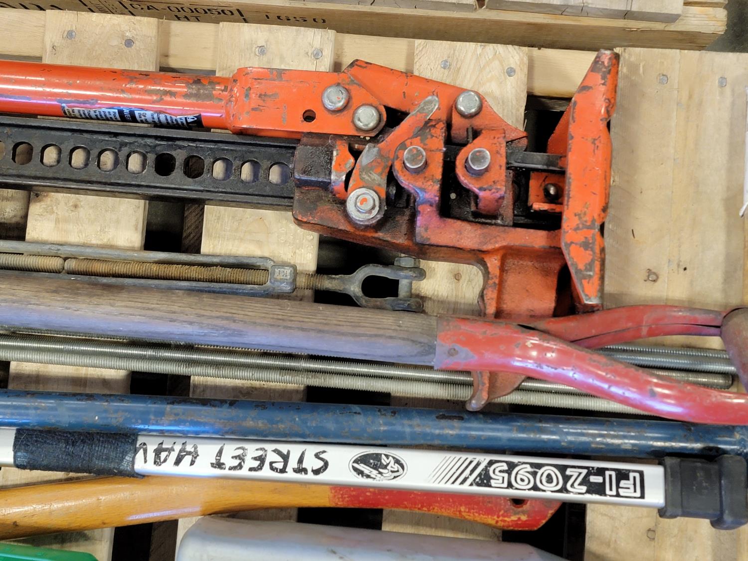 jack-all, manual hole auger, axe, prybar, hockey stick, broom, hitch pin, eye bolts