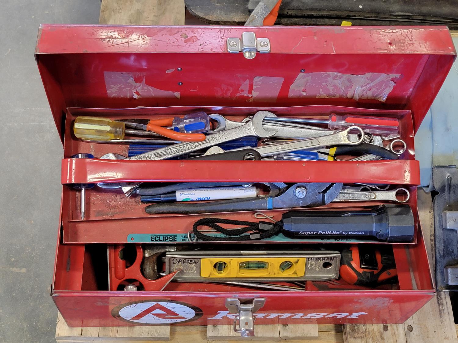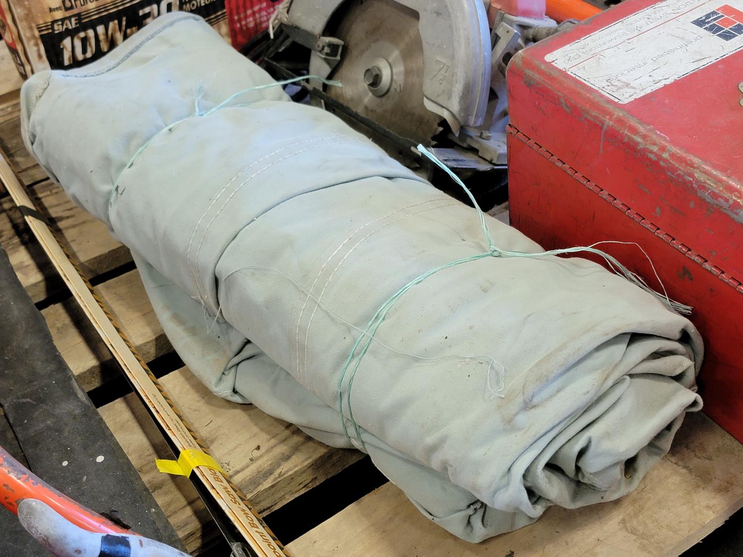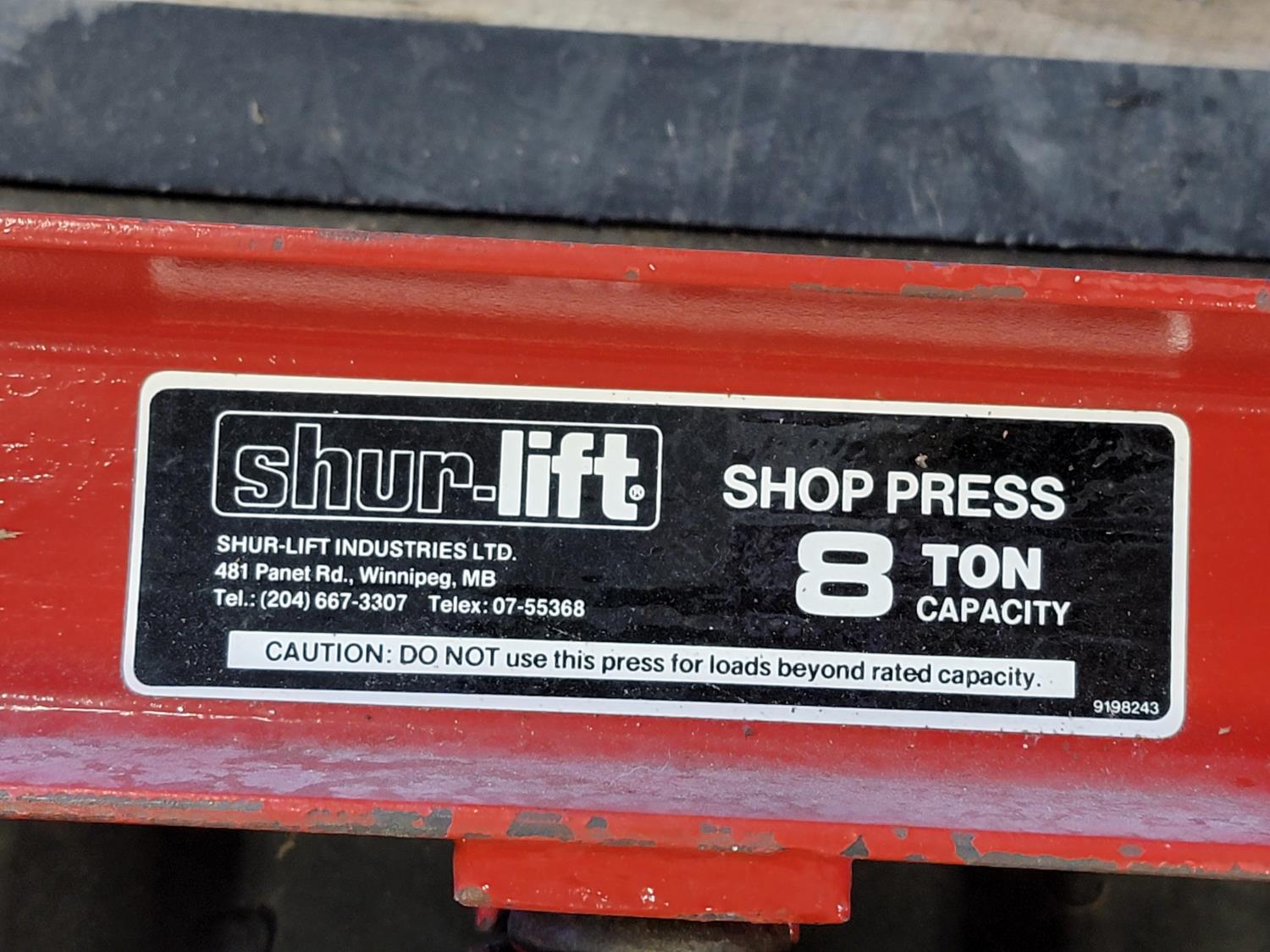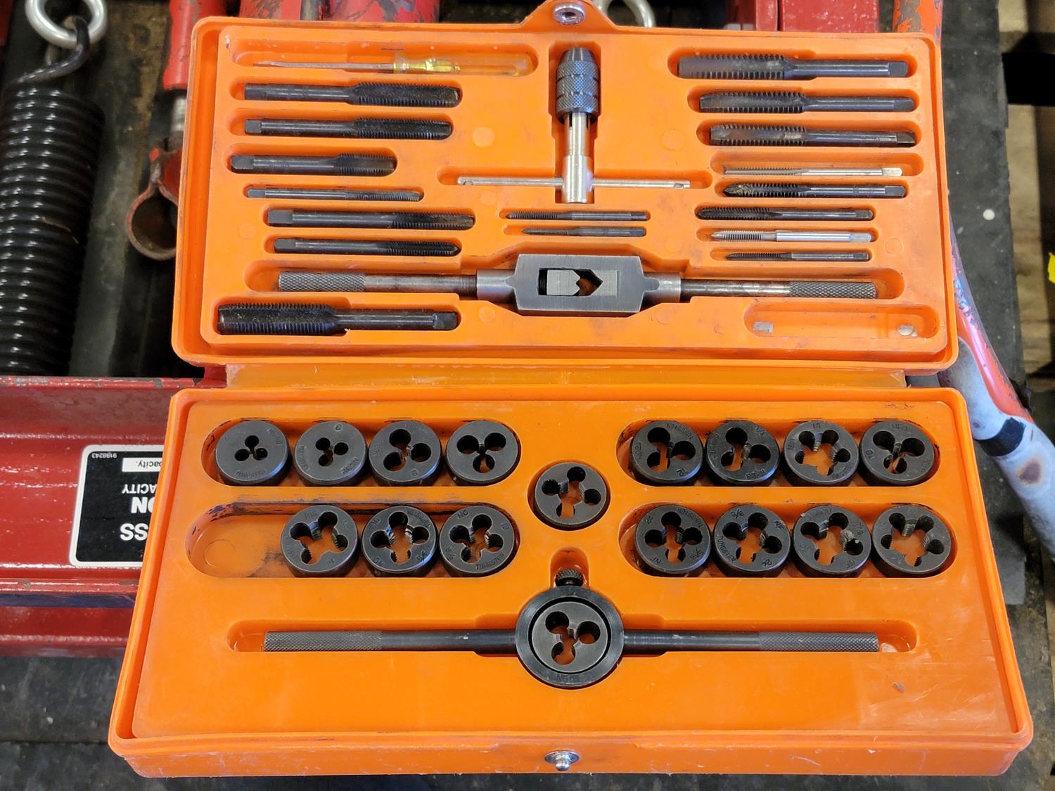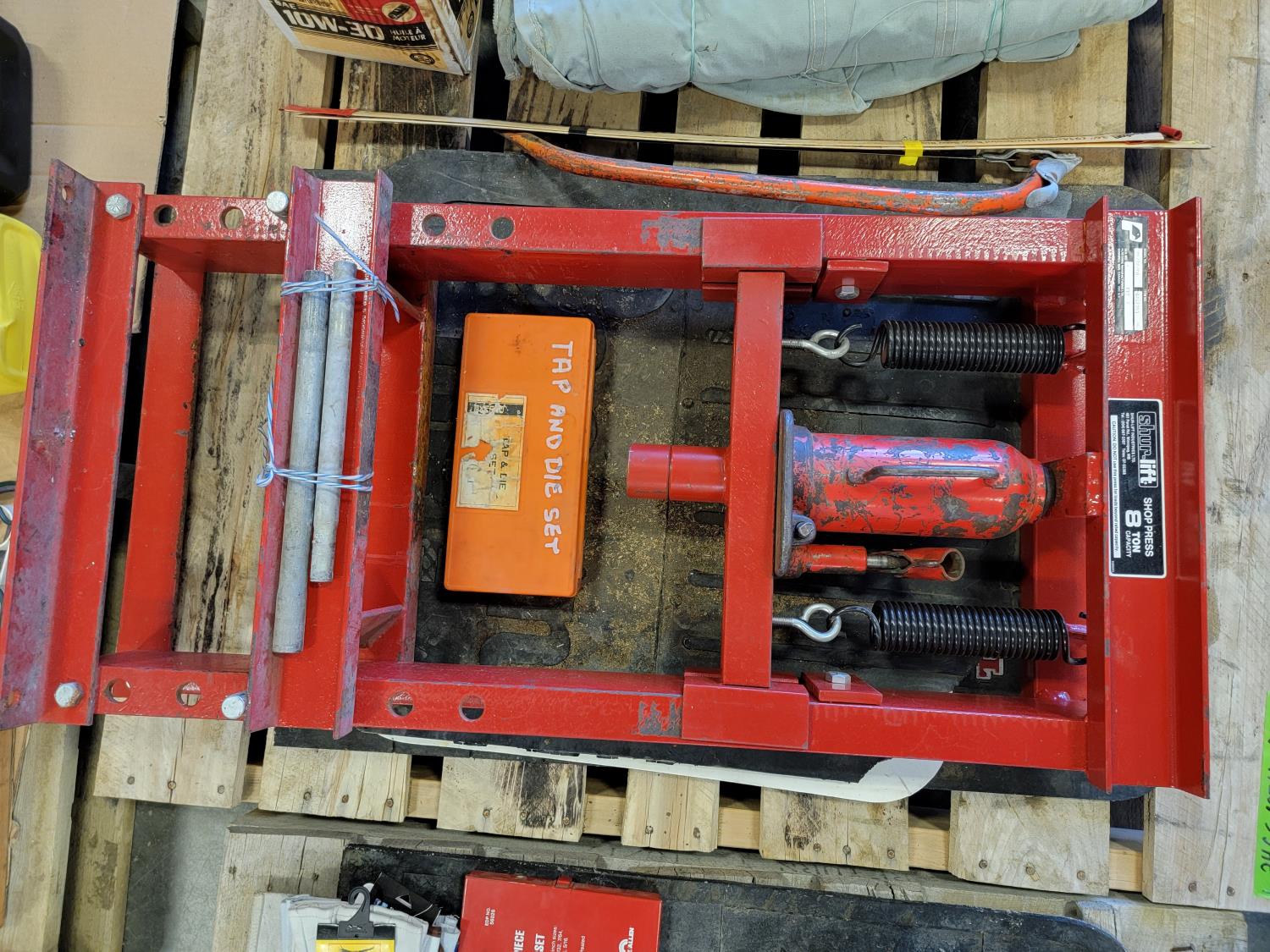 Shur-lift shop press s/n: 172, tap and die set, hand saw with replacement blades, canvas sheet, tool box with contents, milwakee circular saw s/n: 632-32261, electrical boxes