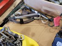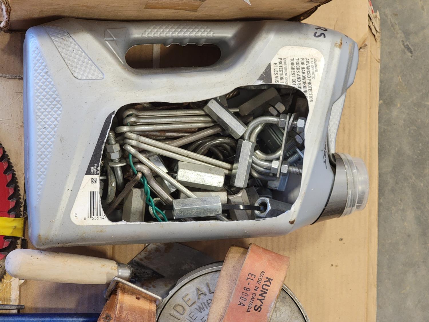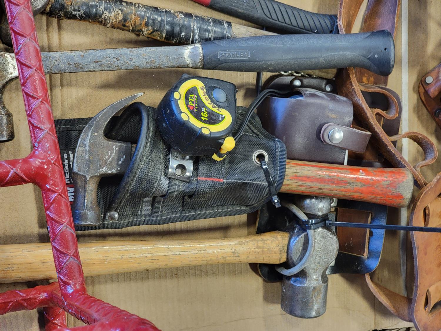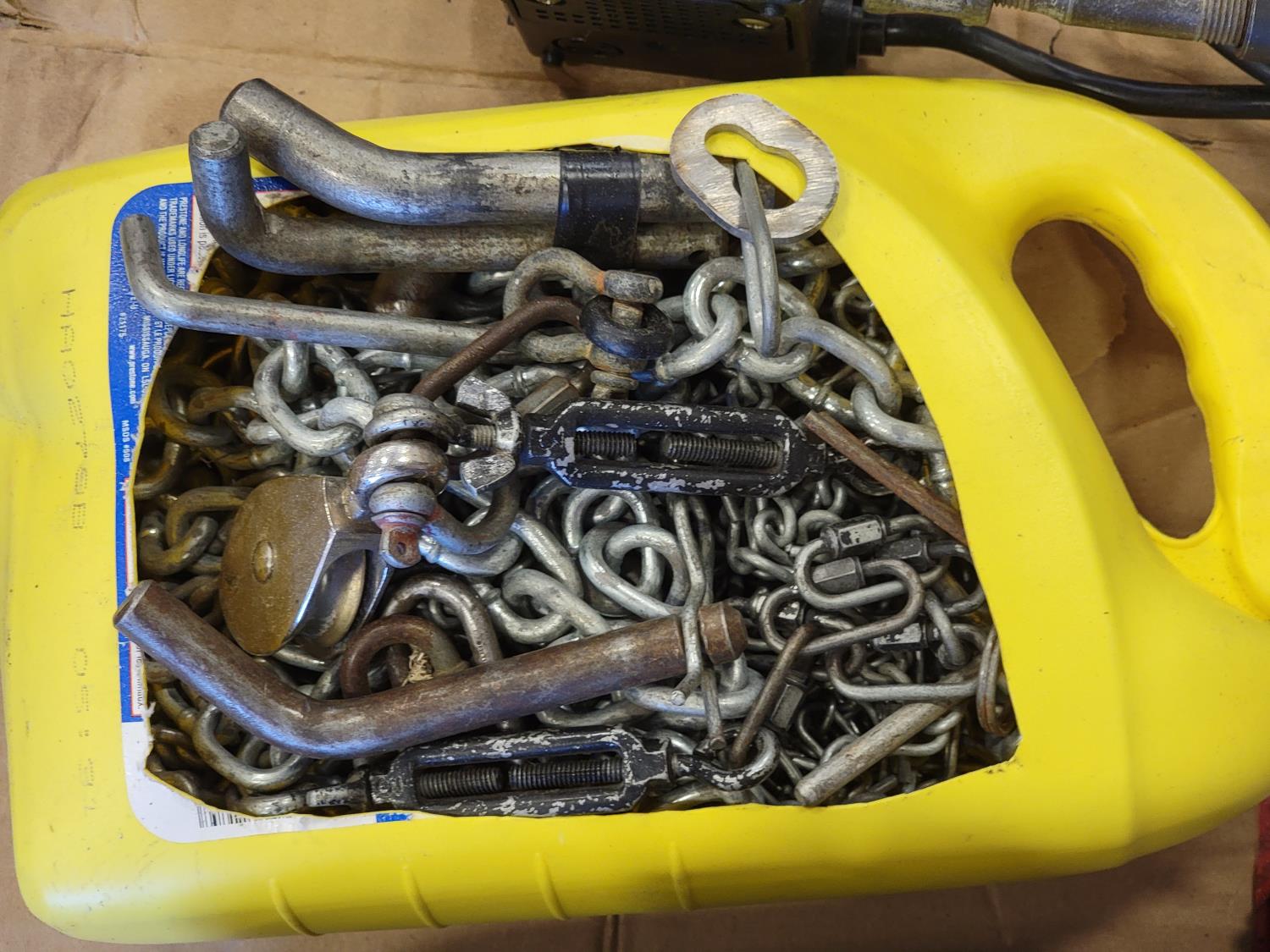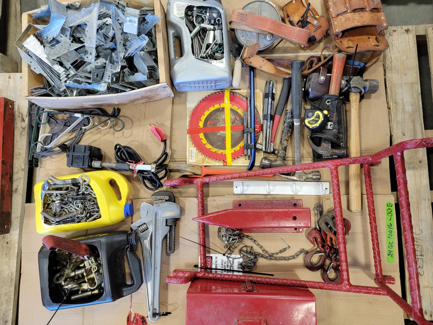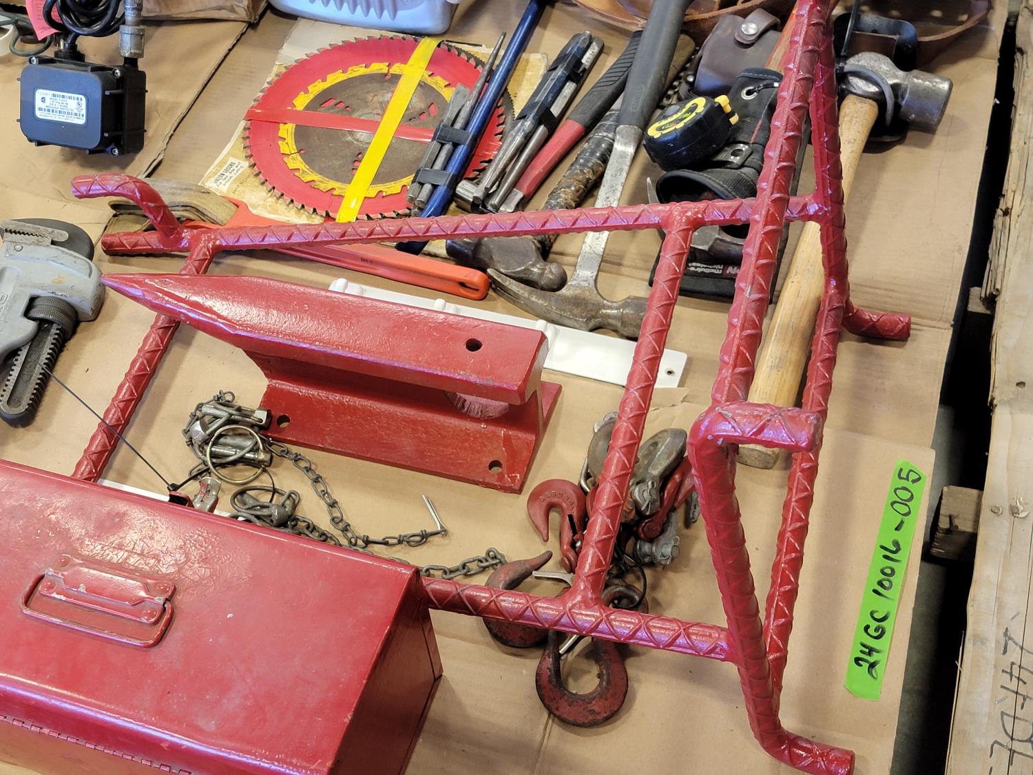 metal brackets, pipe wrench, adjustable wrench, pins, u-bolts, tool belts, hammers, tape measure, vise parts, toolbox with contents, chains, pulley, cobra rope grab, little giant pump, plant hangers, cutting blades, prybars