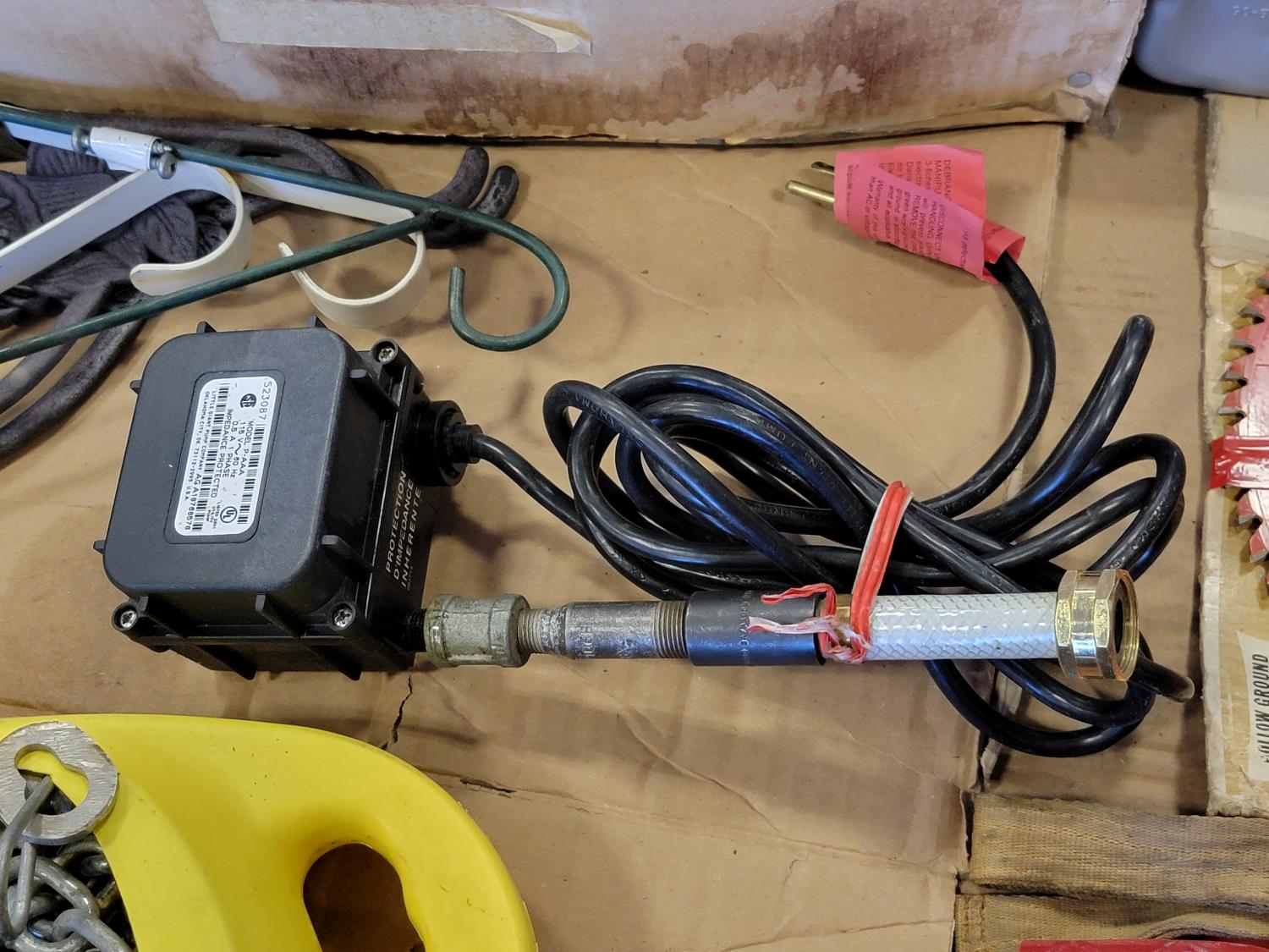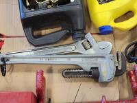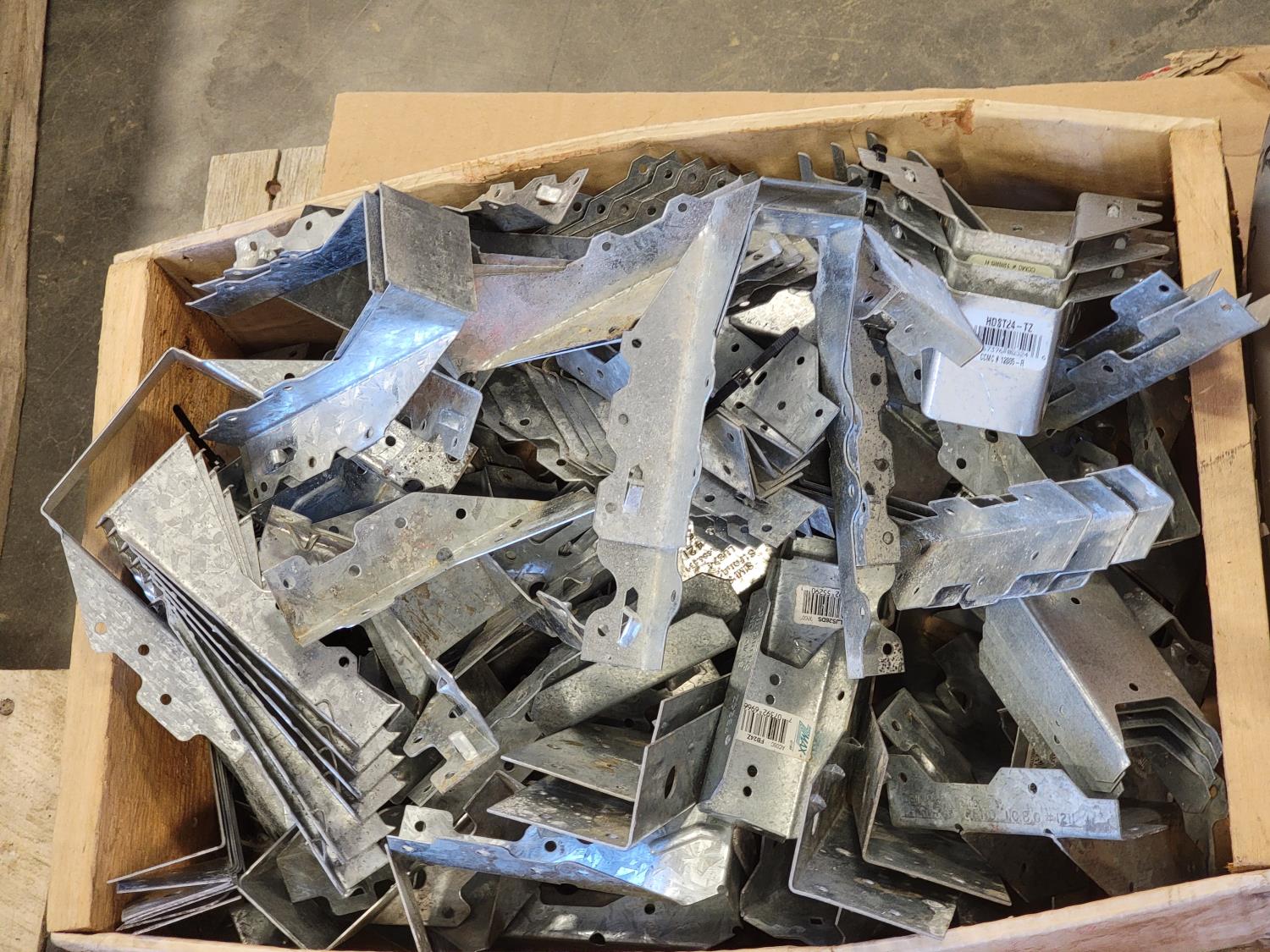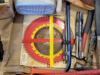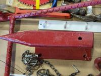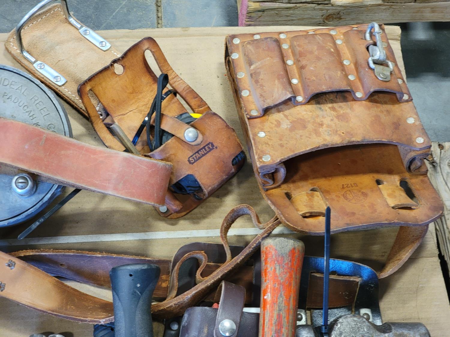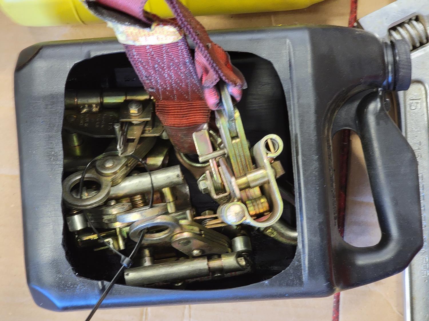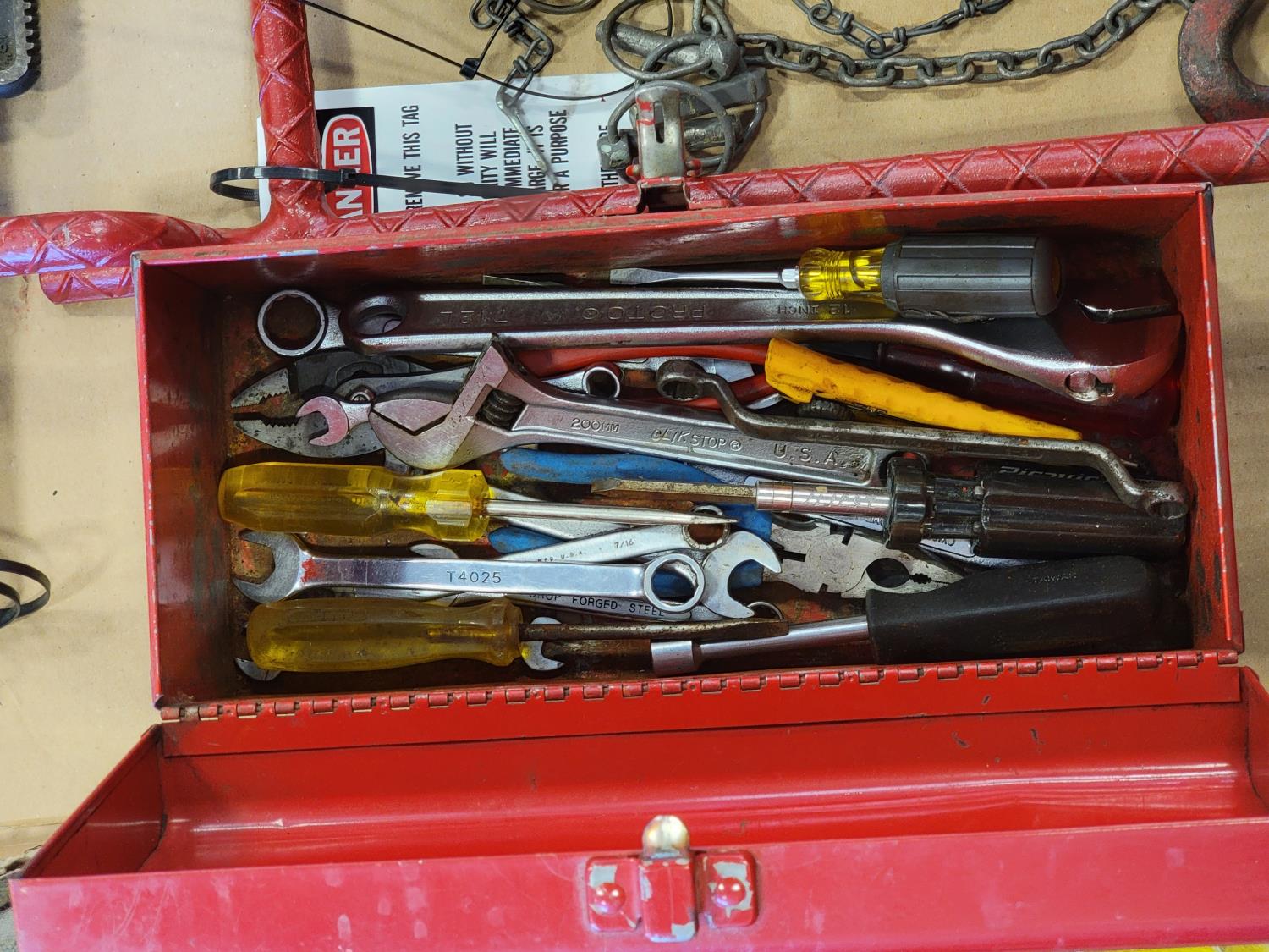 metal brackets, pipe wrench, adjustable wrench, pins, u-bolts, tool belts, hammers, tape measure, vise parts, toolbox with contents, chains, pulley, cobra rope grab, little giant pump, plant hangers, cutting blades, prybars
