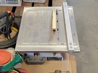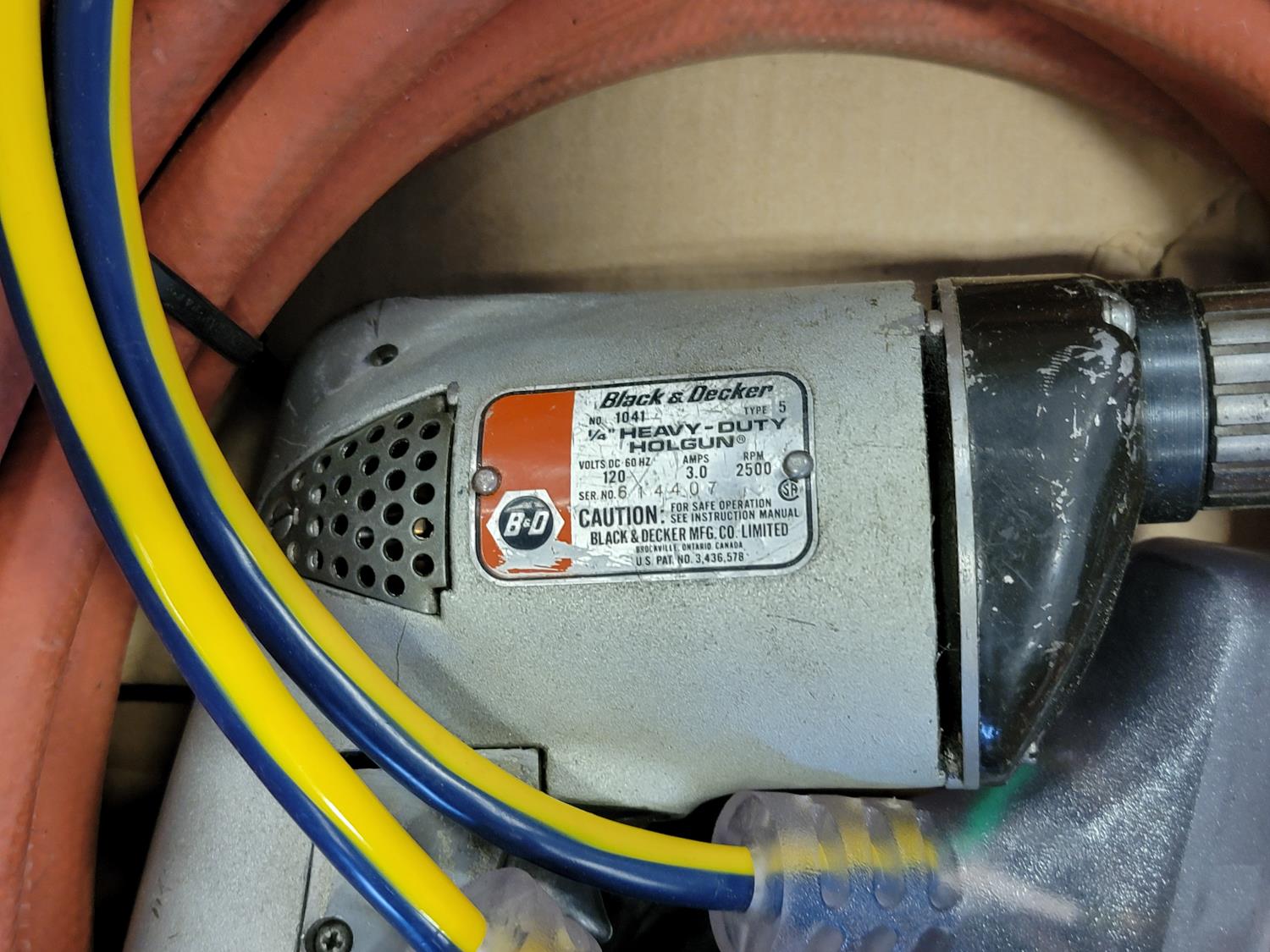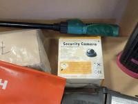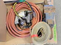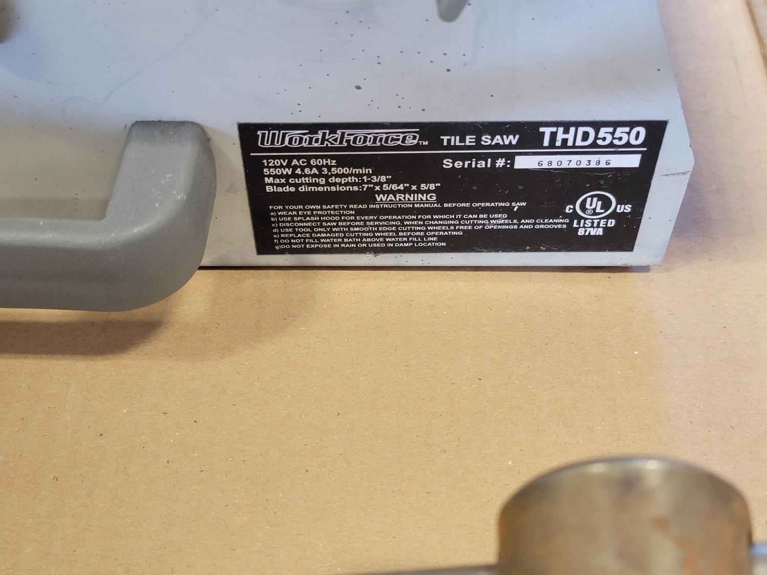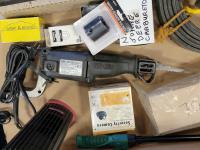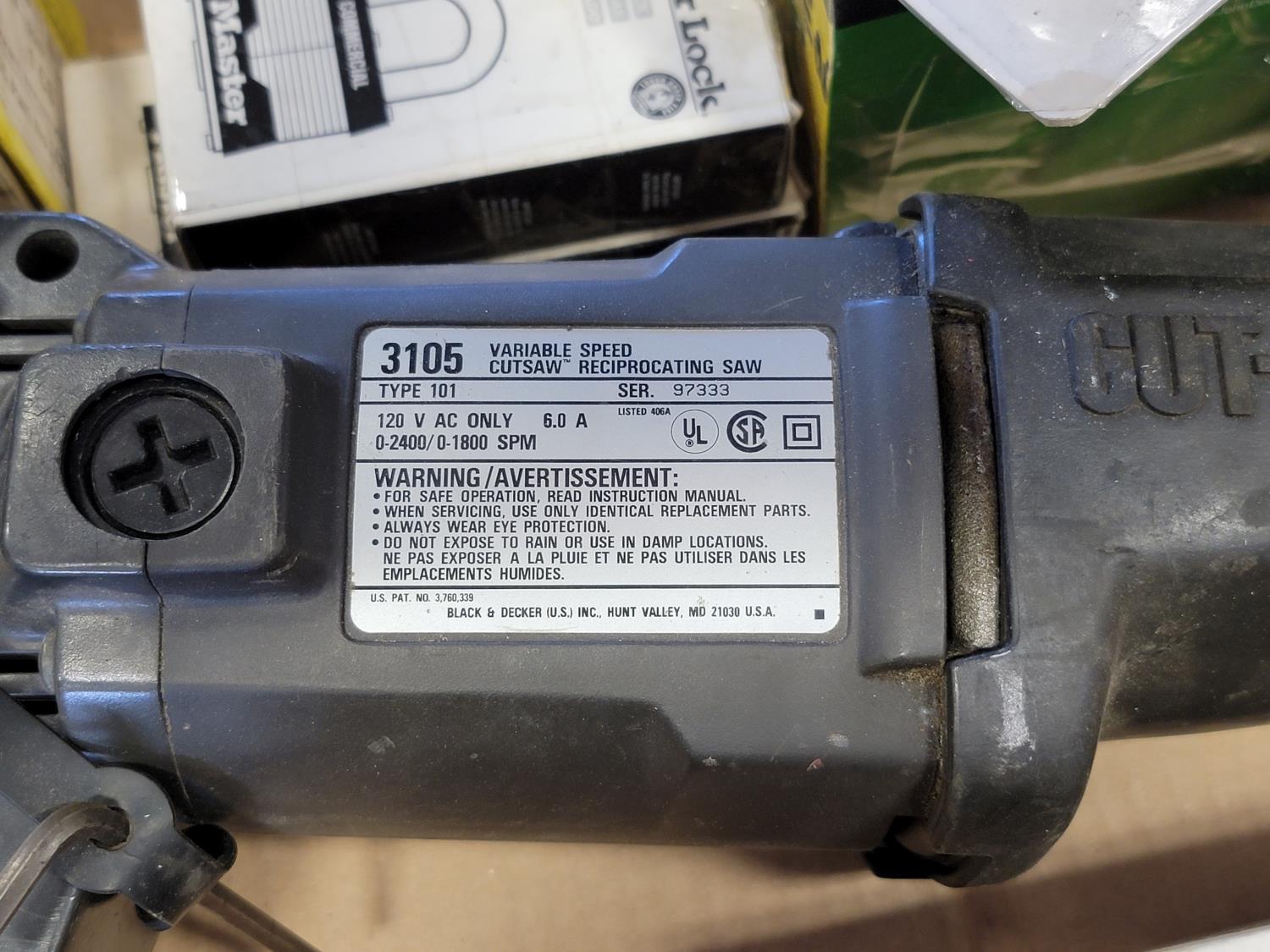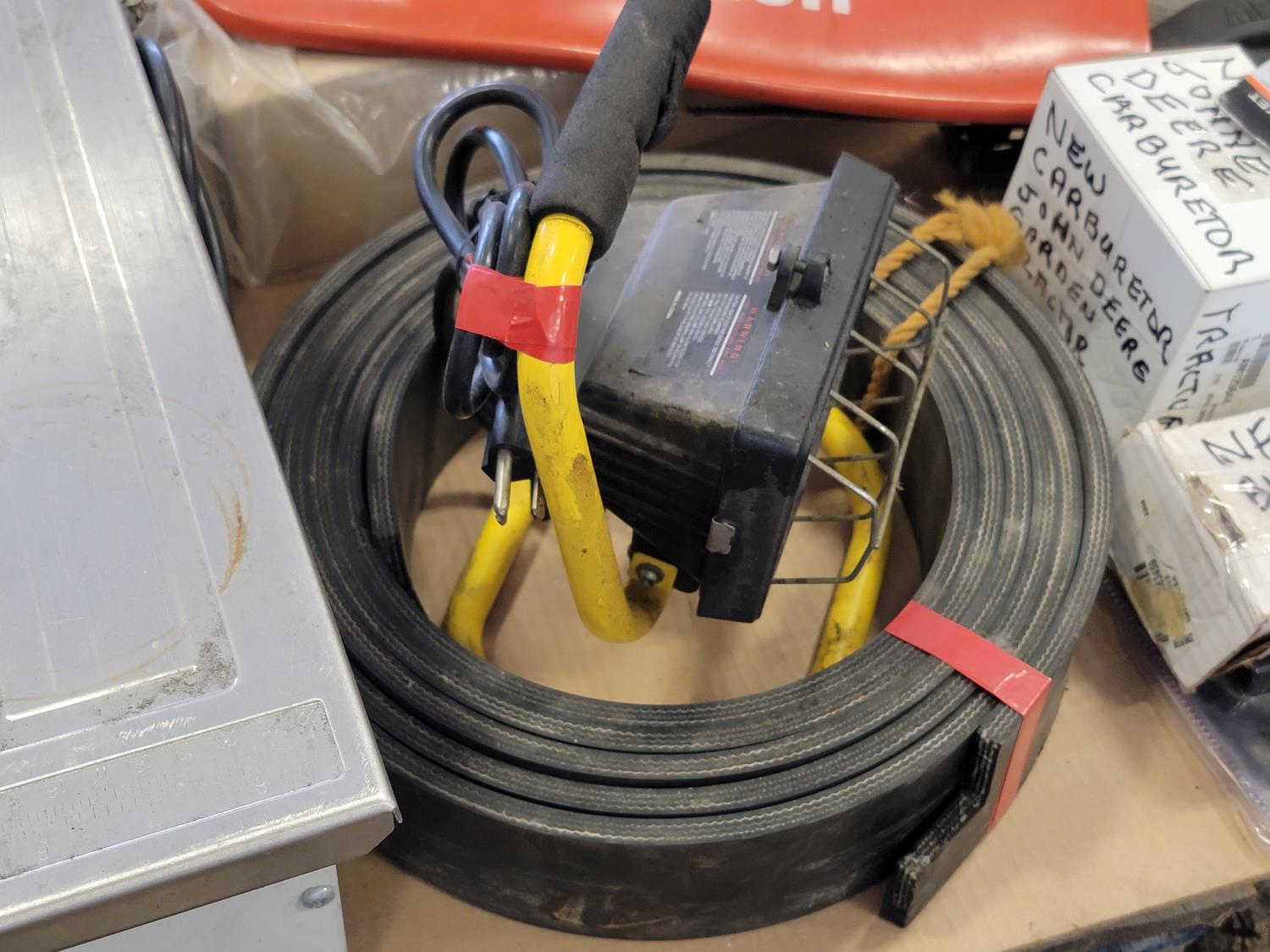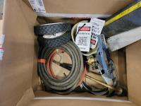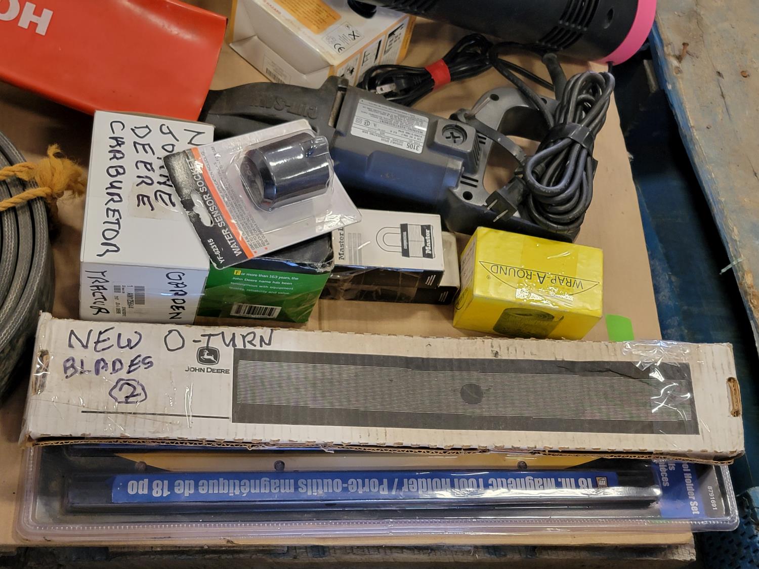 dolly wheels, air hose, vise, black & decker 1/4 inch drive drill s/n: 614407, workforce tile saw s/n: 68070386, shop light, rubber strapping, 0-turn blades, john deere carburetor, locks, area fan, hose nozzle, security camera, reciprocating saw s/n: 97333, welding electrodes