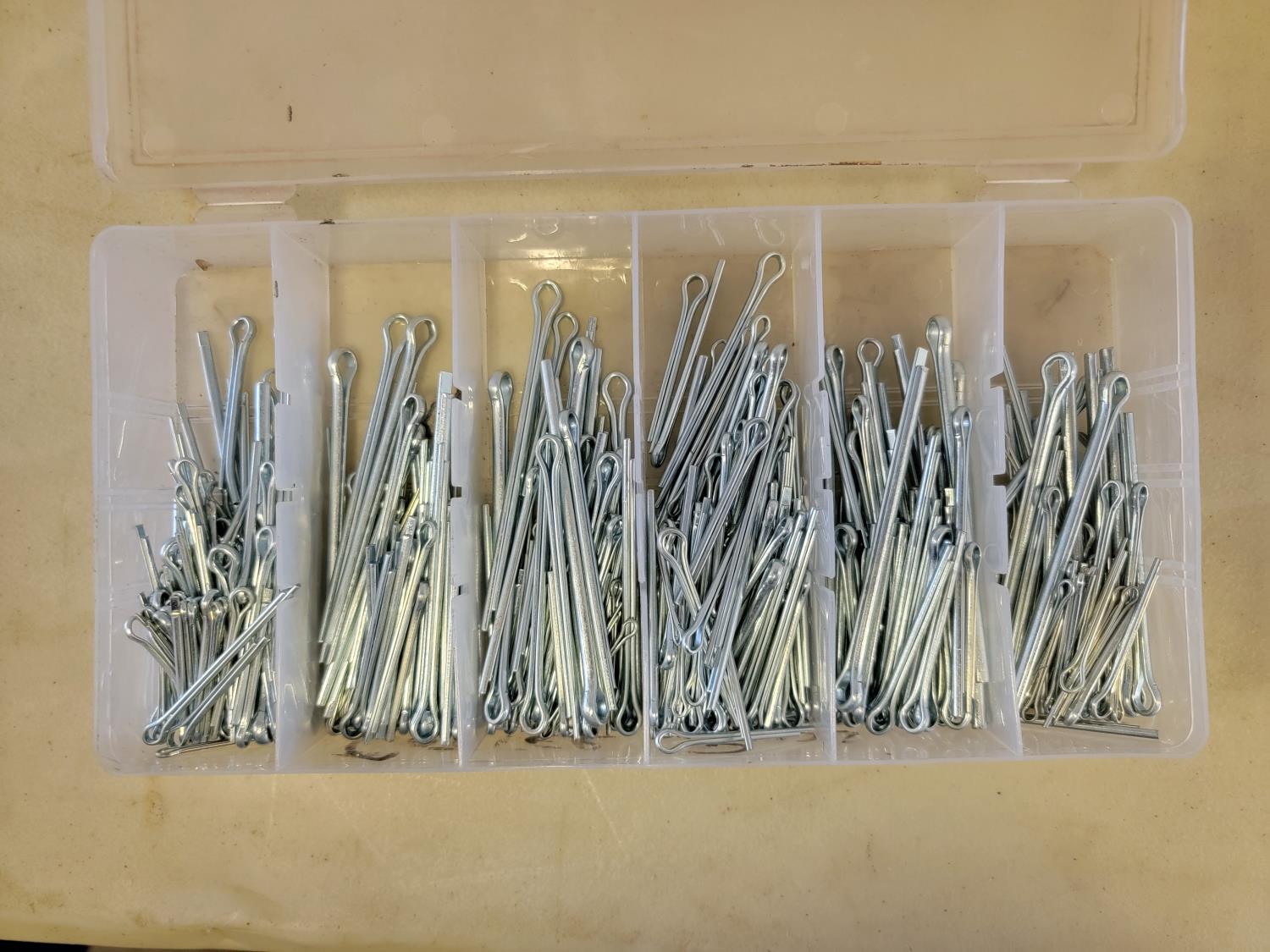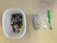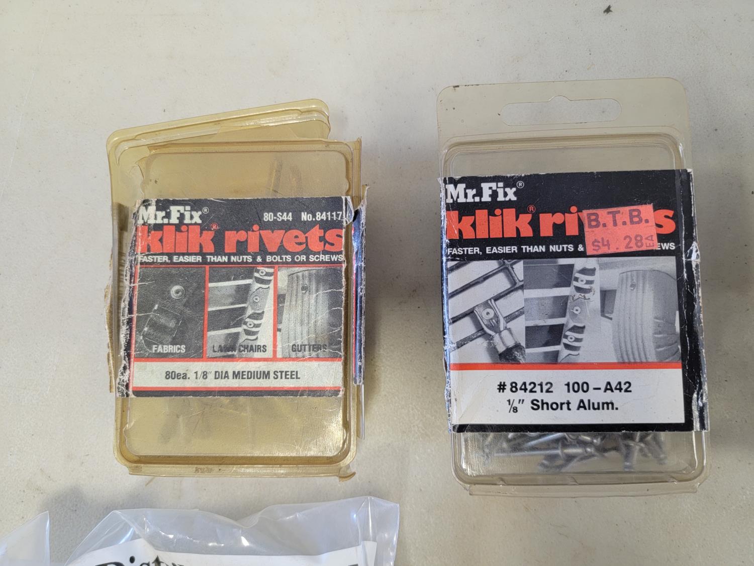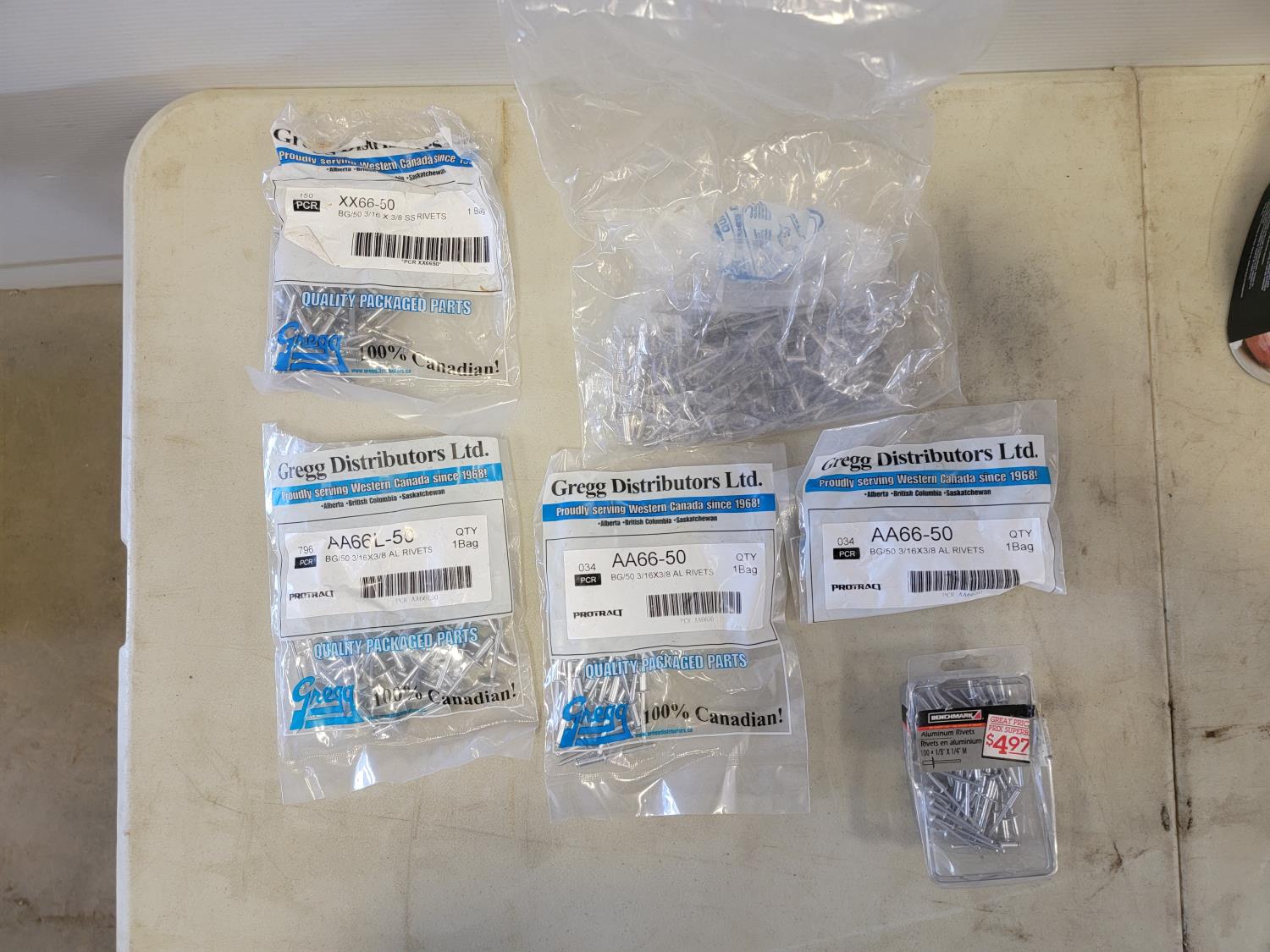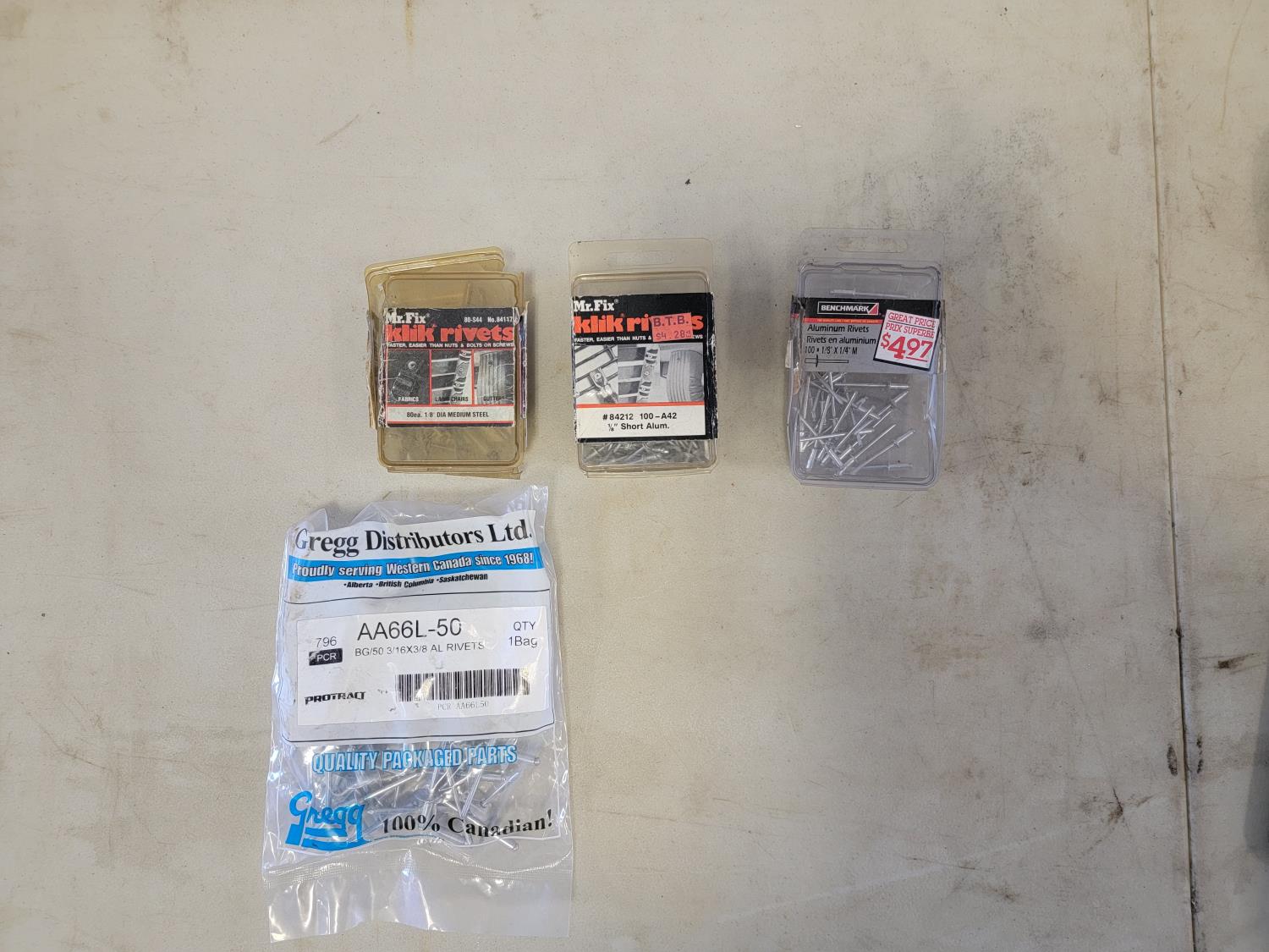 Rivets, cotter pins, locks, split lock washers, Lemmer L-400 paint sprayer, roll of wire, sealant tape, carriage bolts, cap screws, 8 piece wheel caps for trailer, Shurflo water pump, Johnson water pump