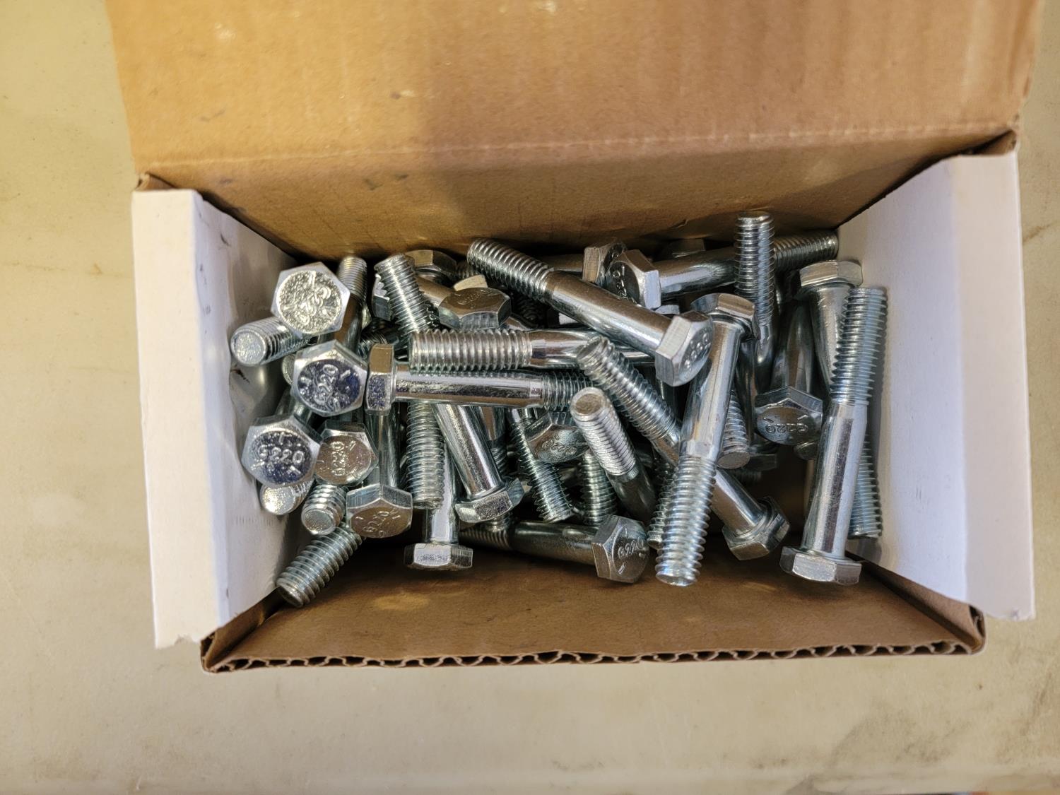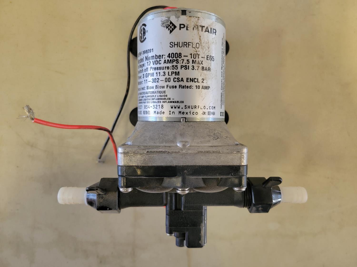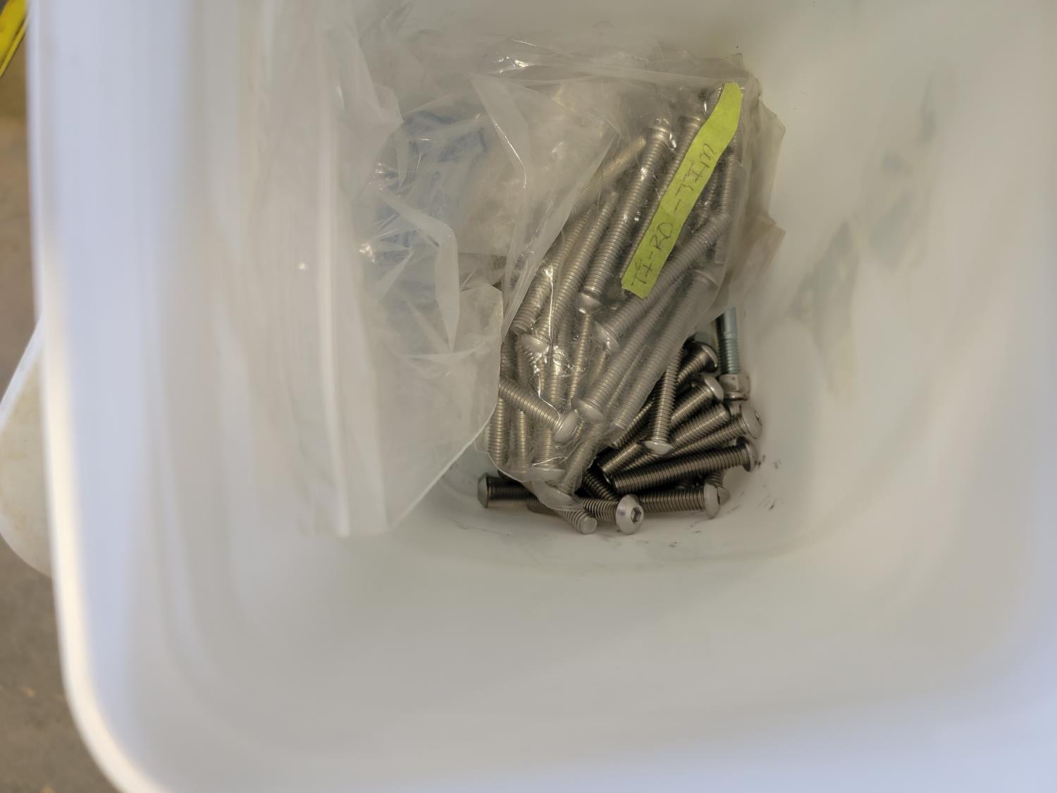 Rivets, cotter pins, locks, split lock washers, Lemmer L-400 paint sprayer, roll of wire, sealant tape, carriage bolts, cap screws, 8 piece wheel caps for trailer, Shurflo water pump, Johnson water pump