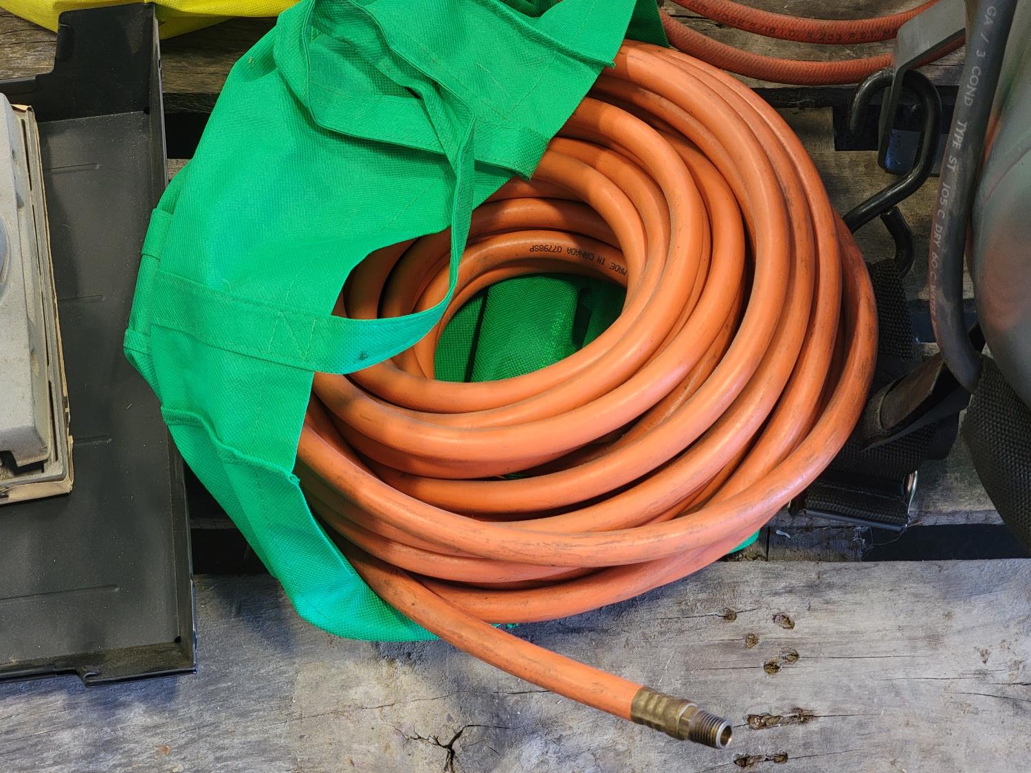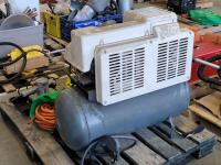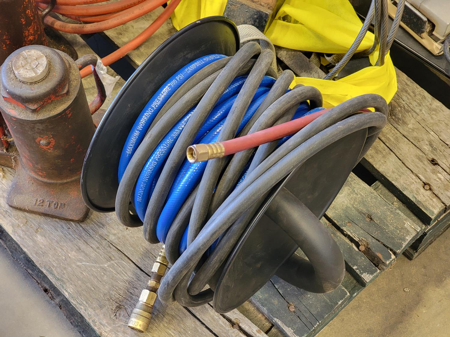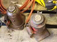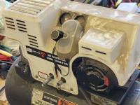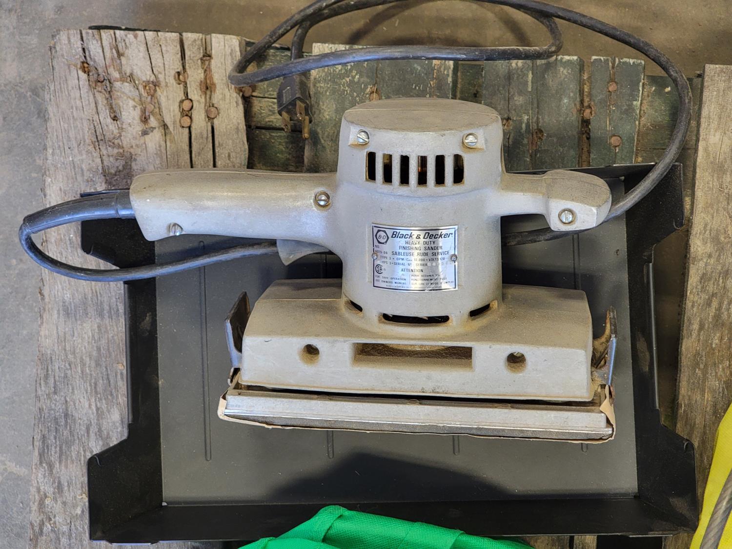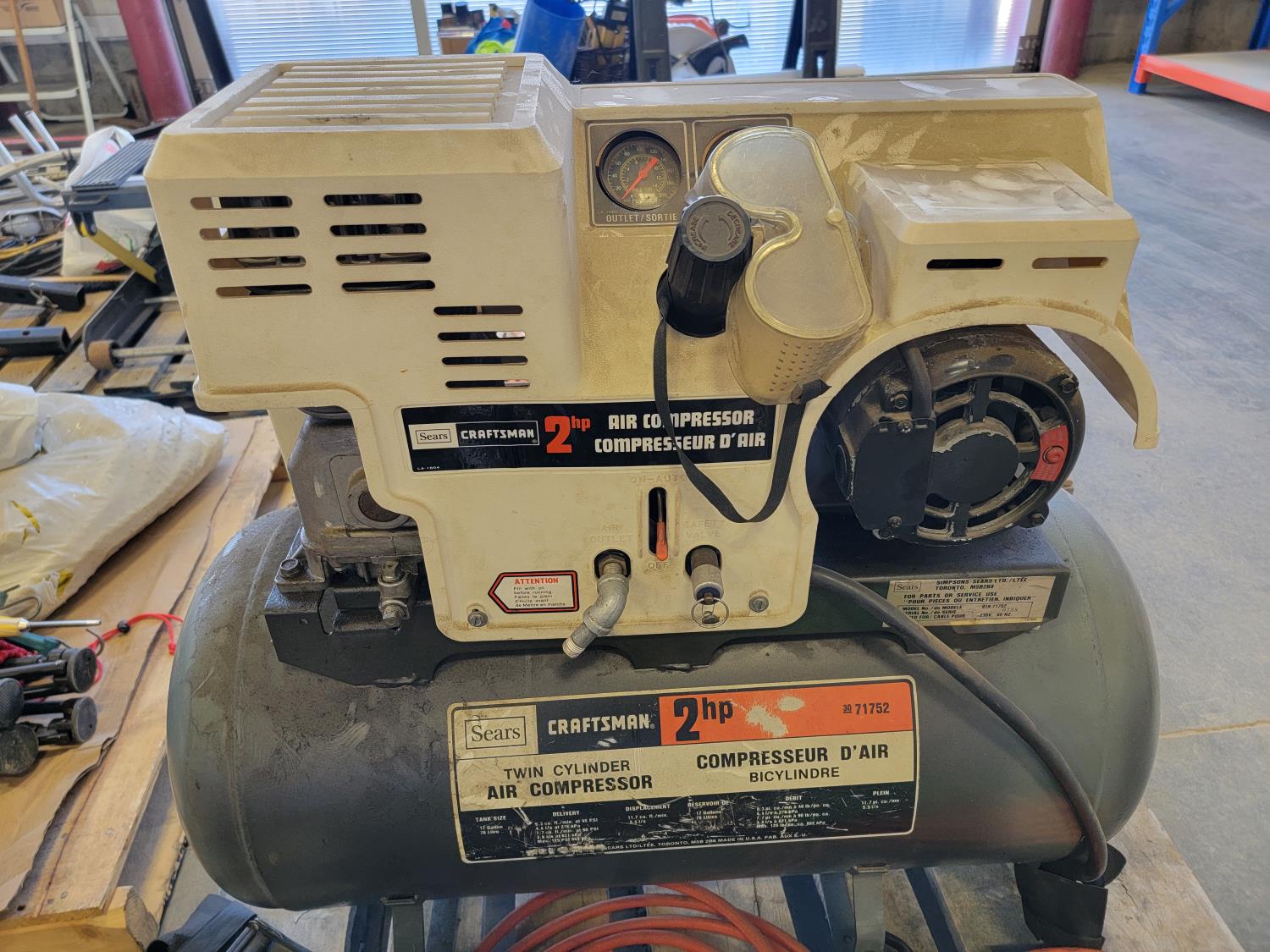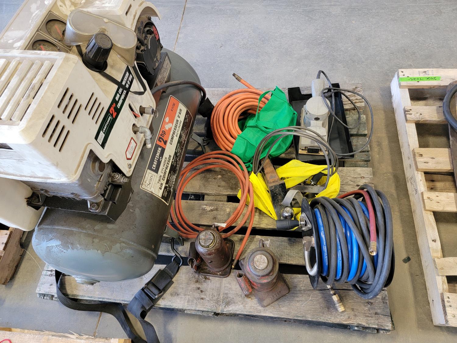 Craftsman 2 HP twin cylinder air compressor: s/n: 0758, bottle jacks, spool of air hose, 1-7/8 inch ball hitch, Black & Decker finishing sander