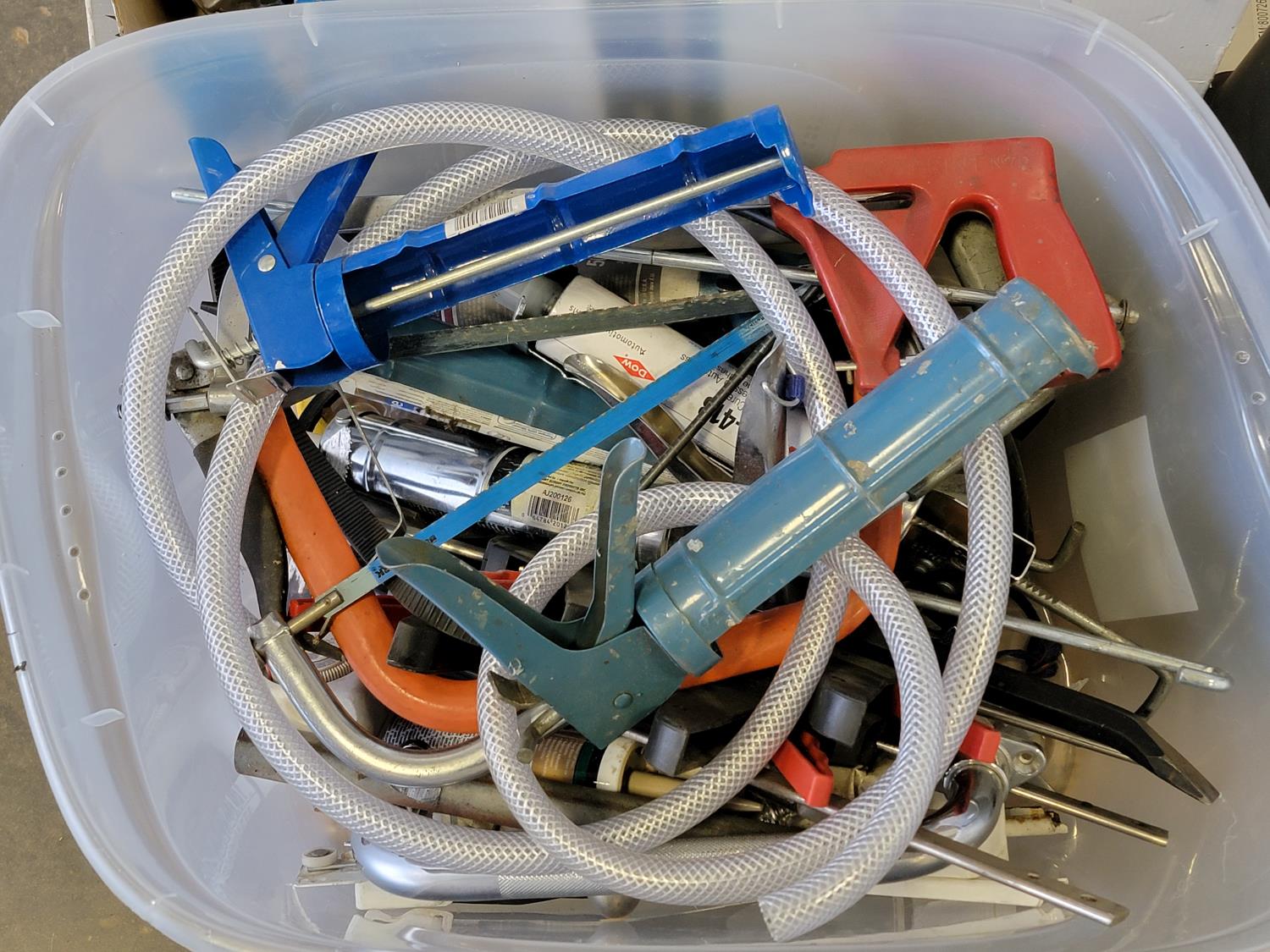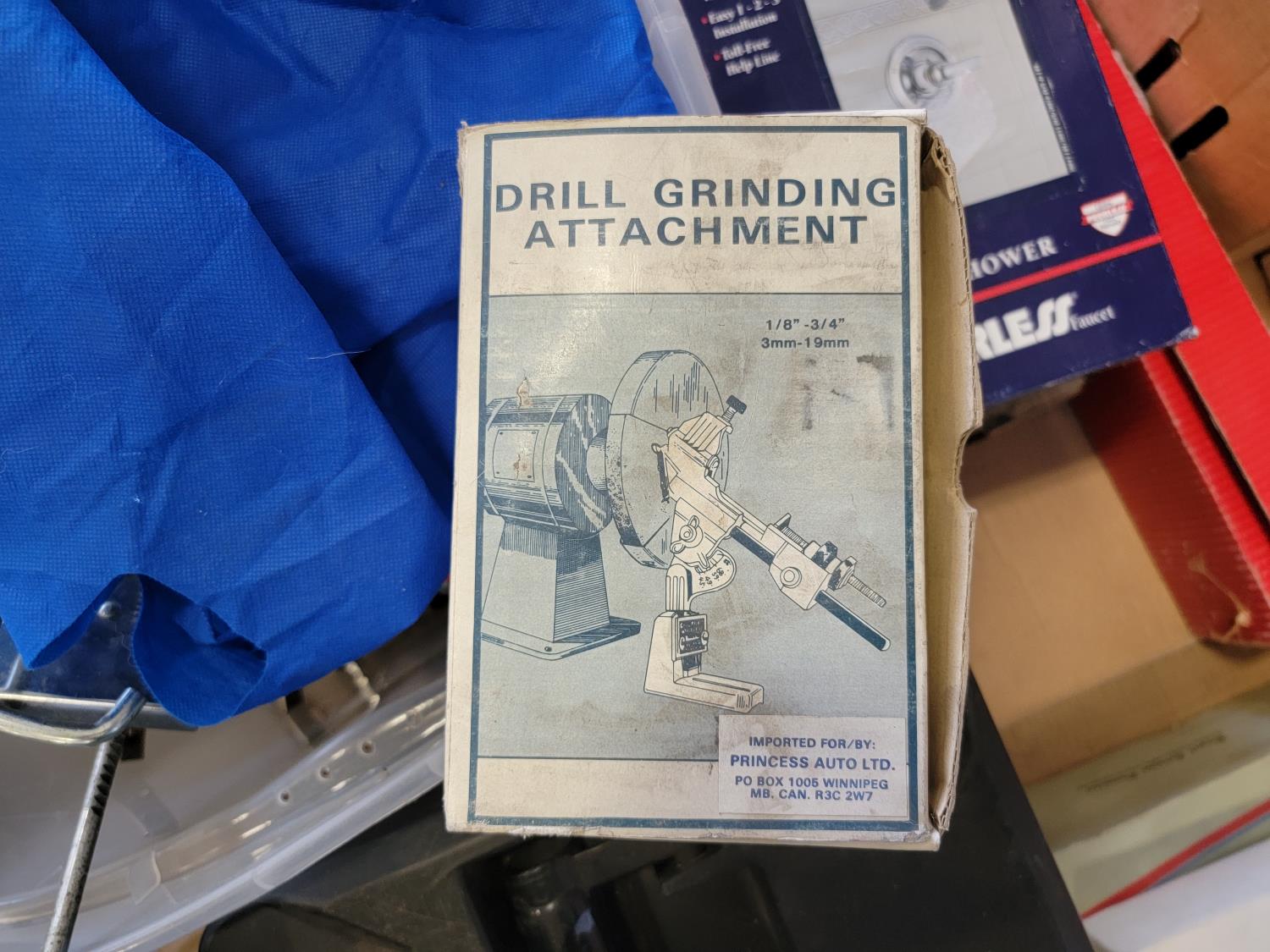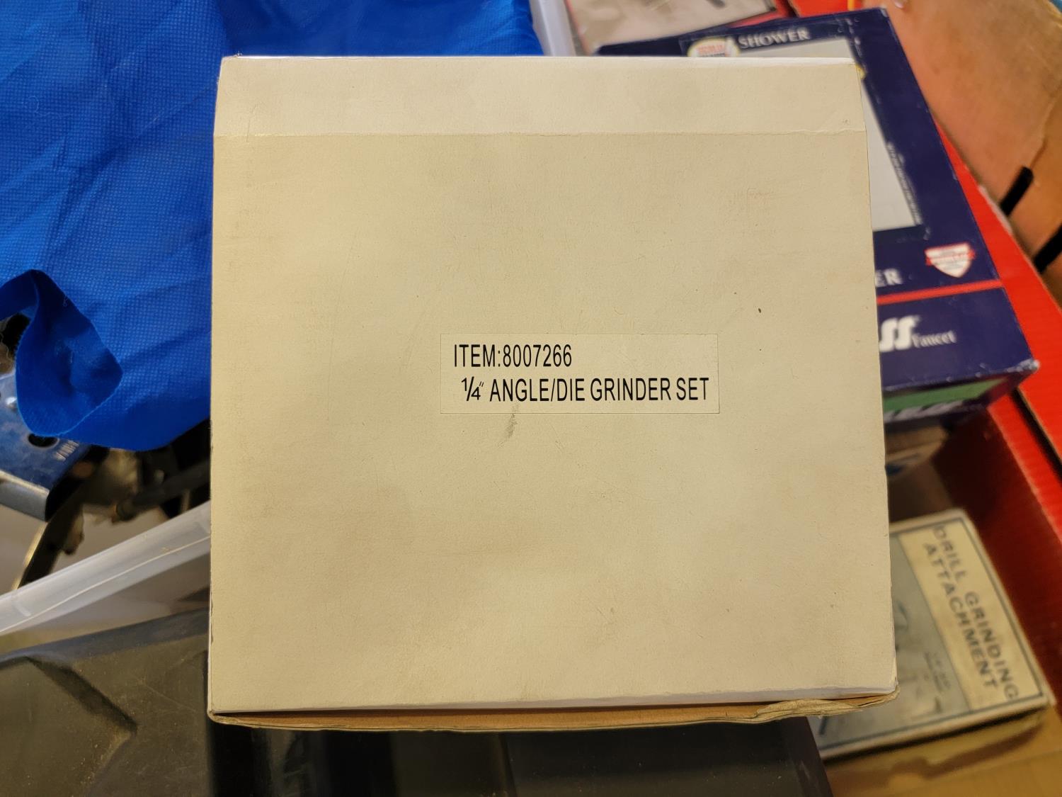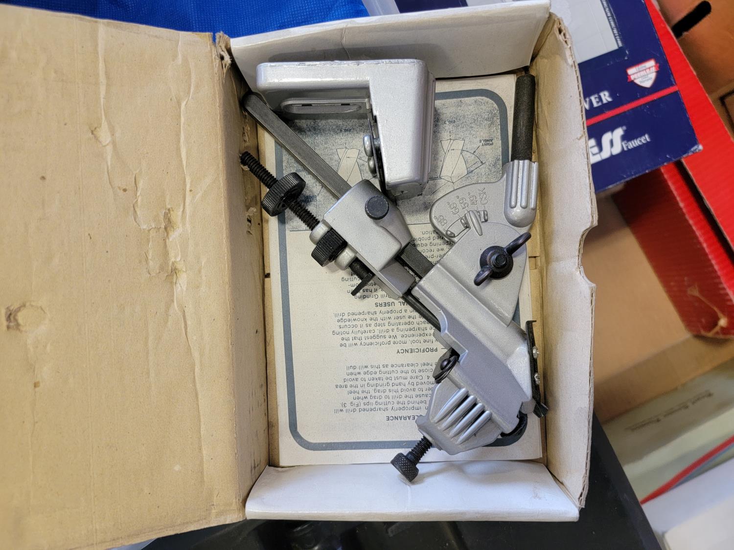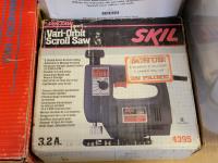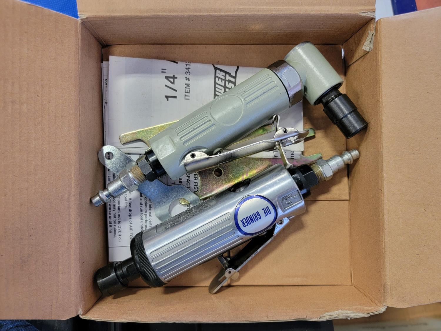 Dual sink drain, caulking guns, pry bar, hand saw, jitterbug sander, hot air paint remover, 1/2 inch reversible drill, vari-orbit scroll saw, three-way spray gun, electrical cords, walkie-talkies, Wen router, shower faucet, 3/4 inch impact wrench, 1/4 inch angle/die grinder set, drill grinding attachment, chainsaw case