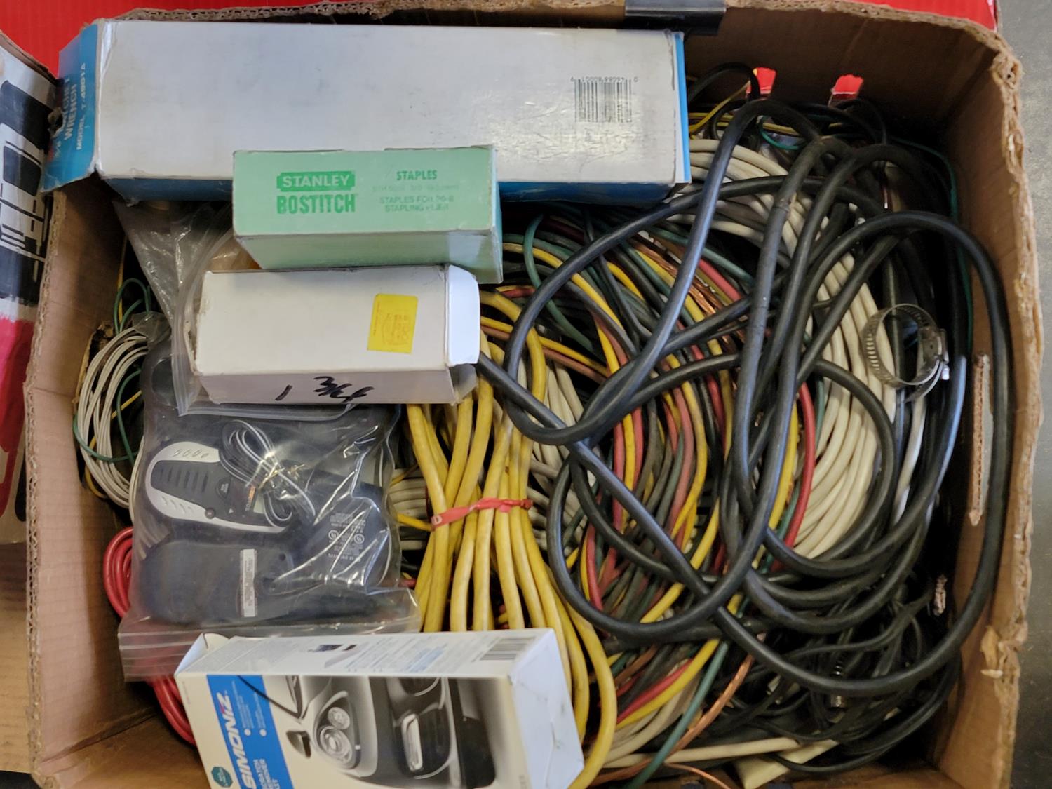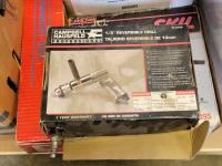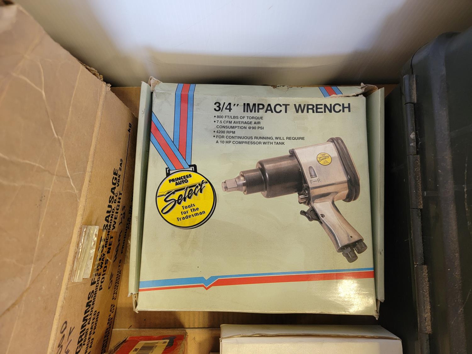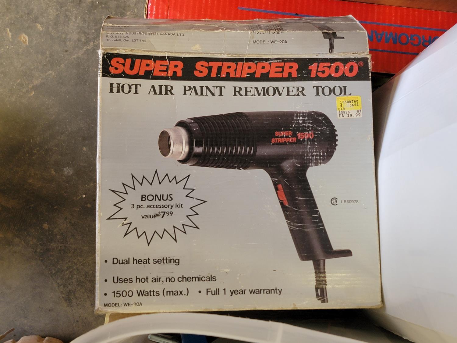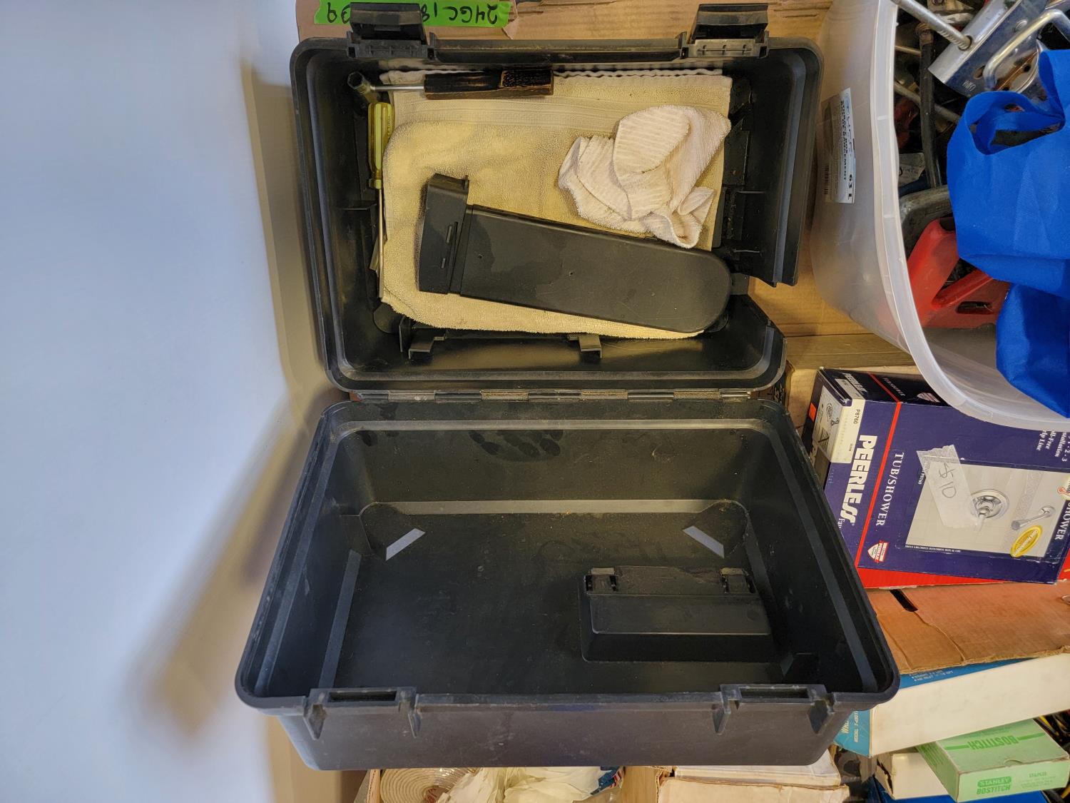 Dual sink drain, caulking guns, pry bar, hand saw, jitterbug sander, hot air paint remover, 1/2 inch reversible drill, vari-orbit scroll saw, three-way spray gun, electrical cords, walkie-talkies, Wen router, shower faucet, 3/4 inch impact wrench, 1/4 inch angle/die grinder set, drill grinding attachment, chainsaw case