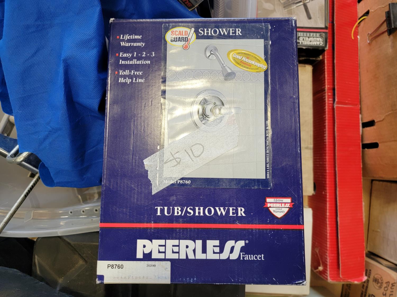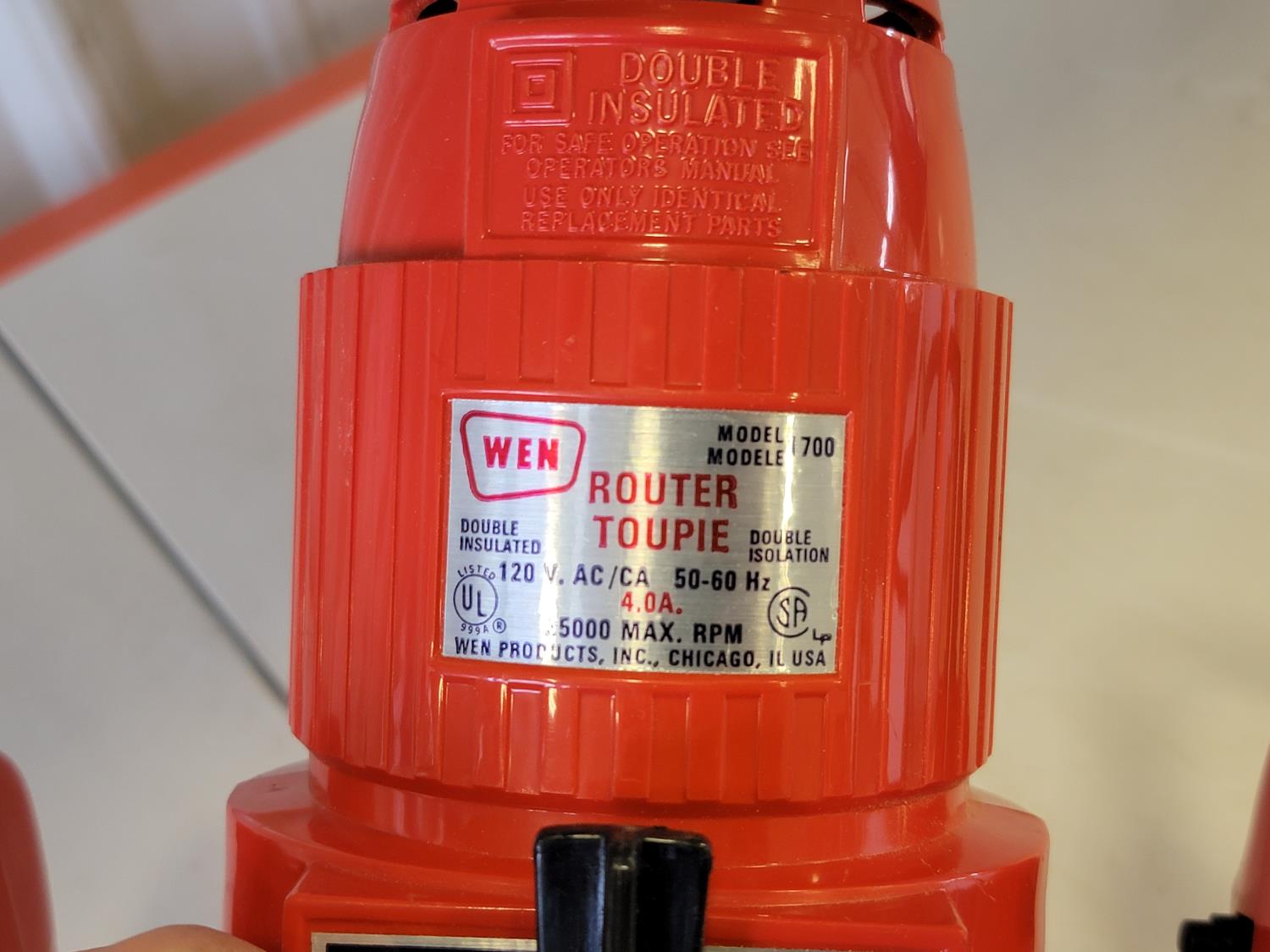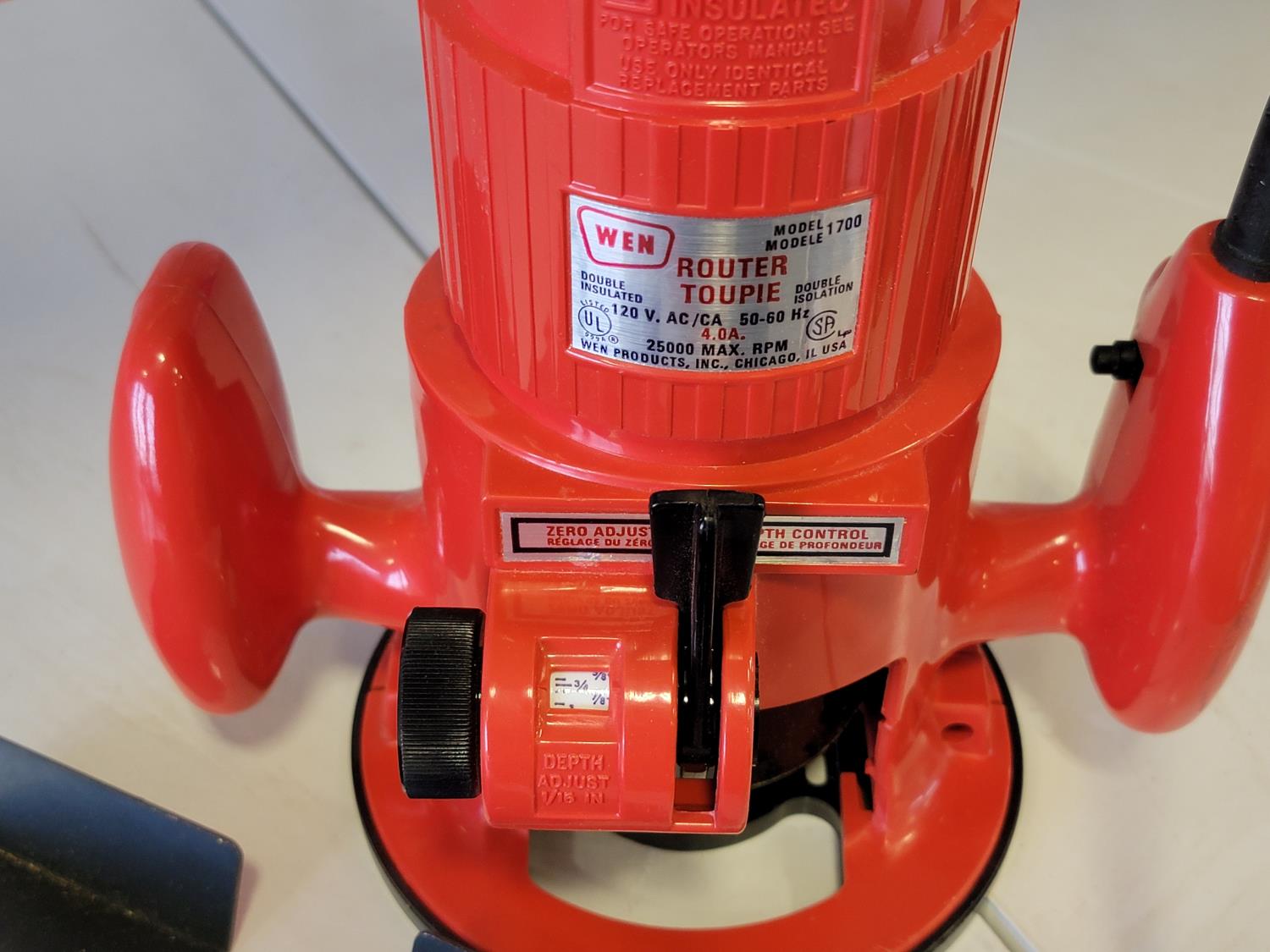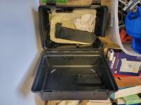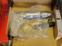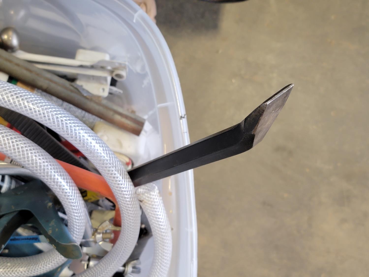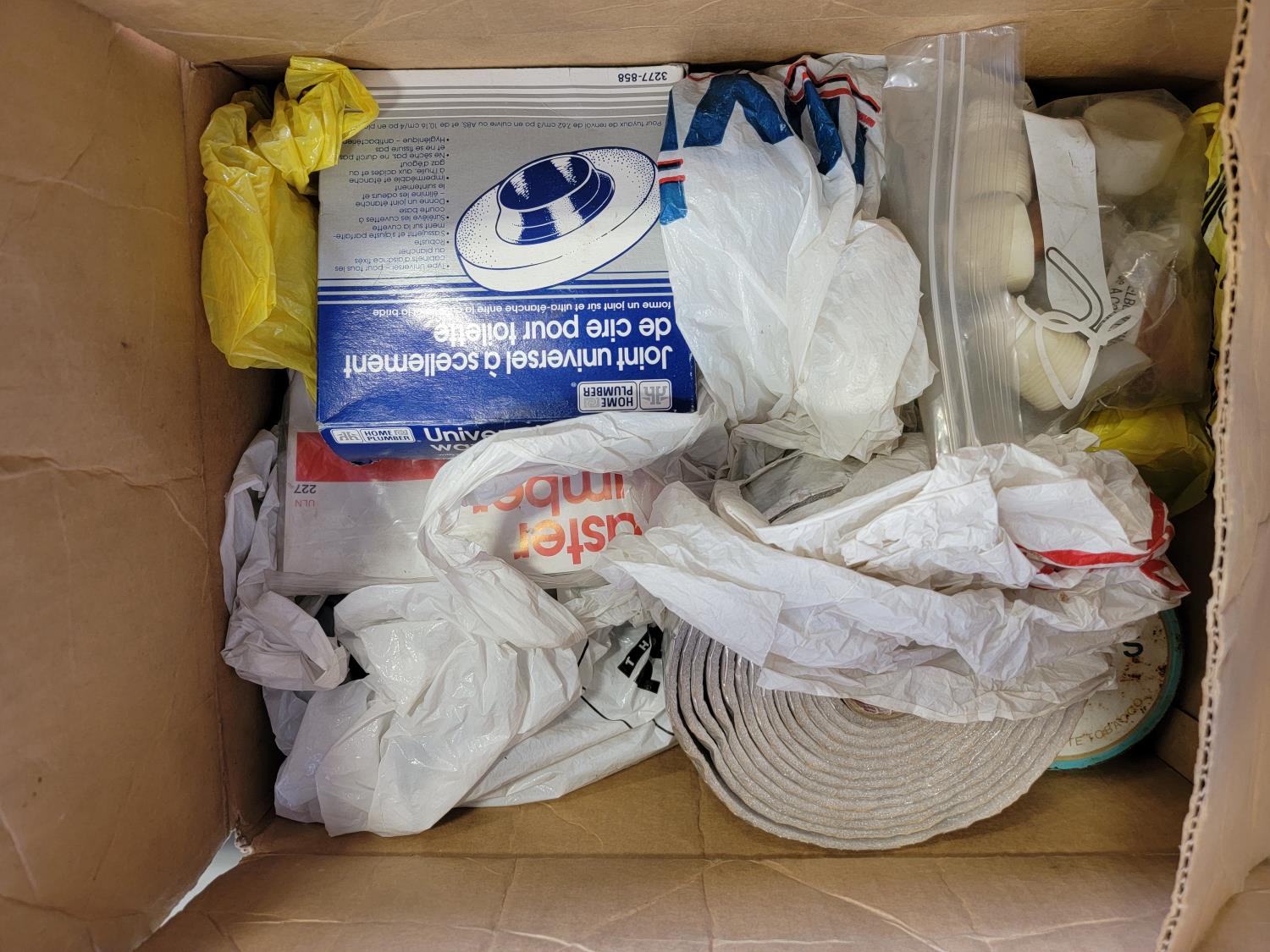 Dual sink drain, caulking guns, pry bar, hand saw, jitterbug sander, hot air paint remover, 1/2 inch reversible drill, vari-orbit scroll saw, three-way spray gun, electrical cords, walkie-talkies, Wen router, shower faucet, 3/4 inch impact wrench, 1/4 inch angle/die grinder set, drill grinding attachment, chainsaw case