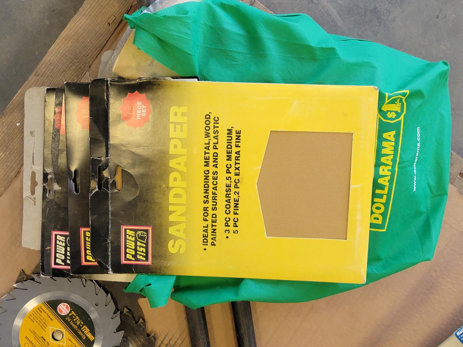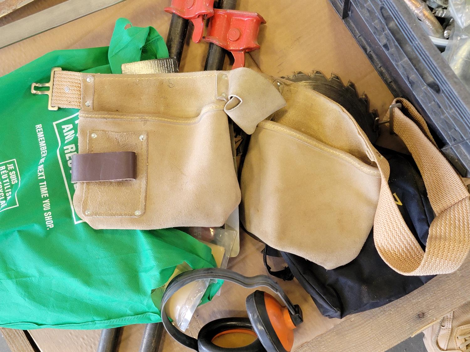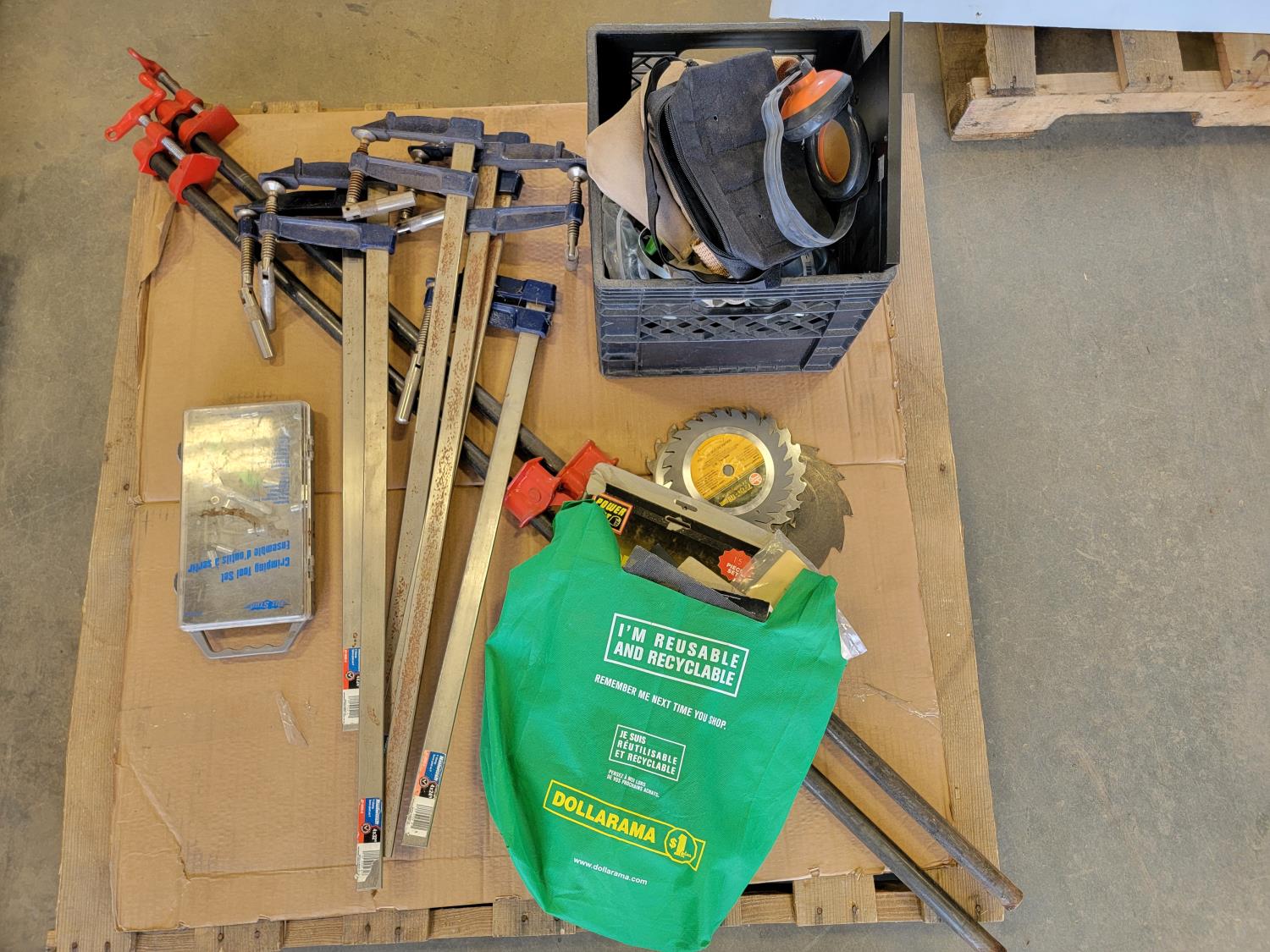 Pony clamps, f-clamps, drill bits, 7 inch blade, 8 inch blade, sanding paper, ear protection, construction belt, funnels