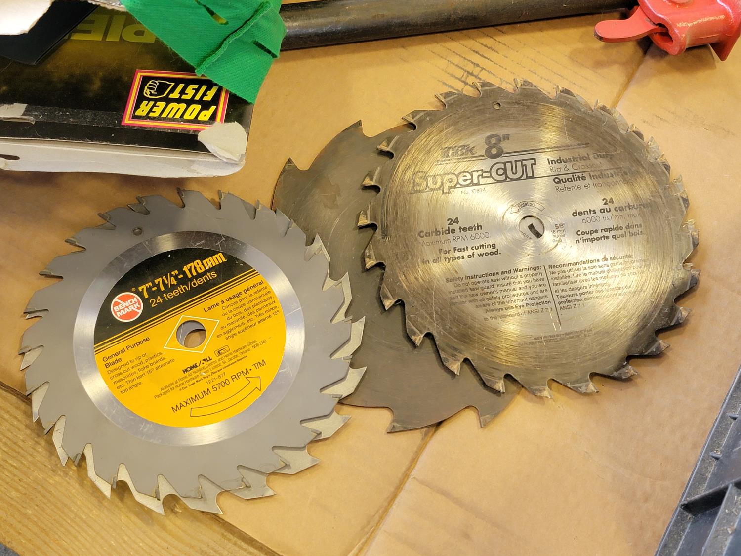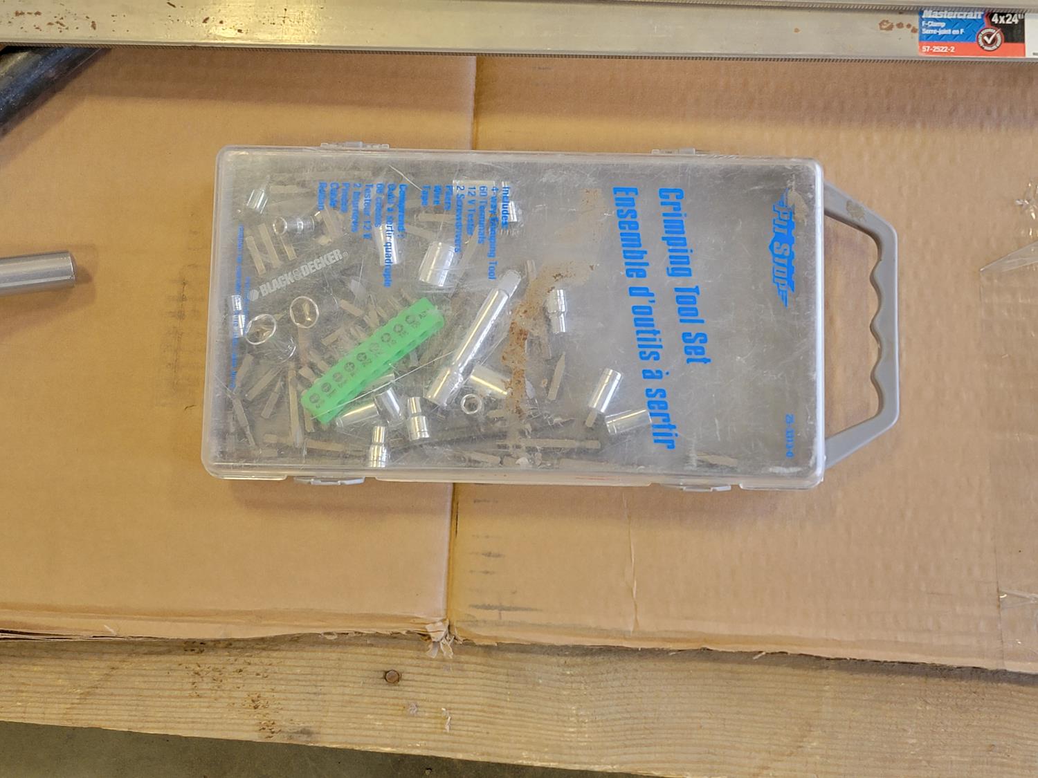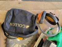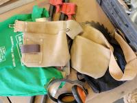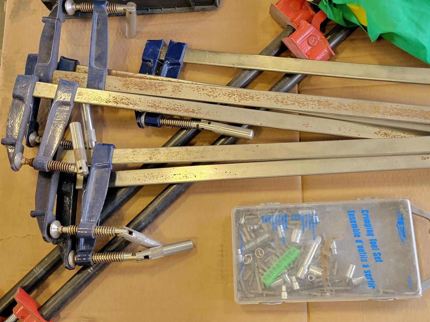 Pony clamps, f-clamps, drill bits, 7 inch blade, 8 inch blade, sanding paper, ear protection, construction belt, funnels