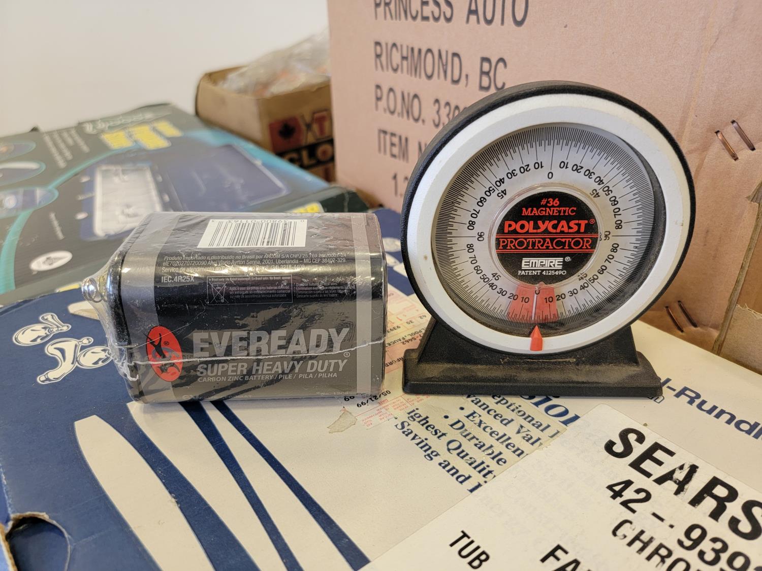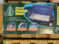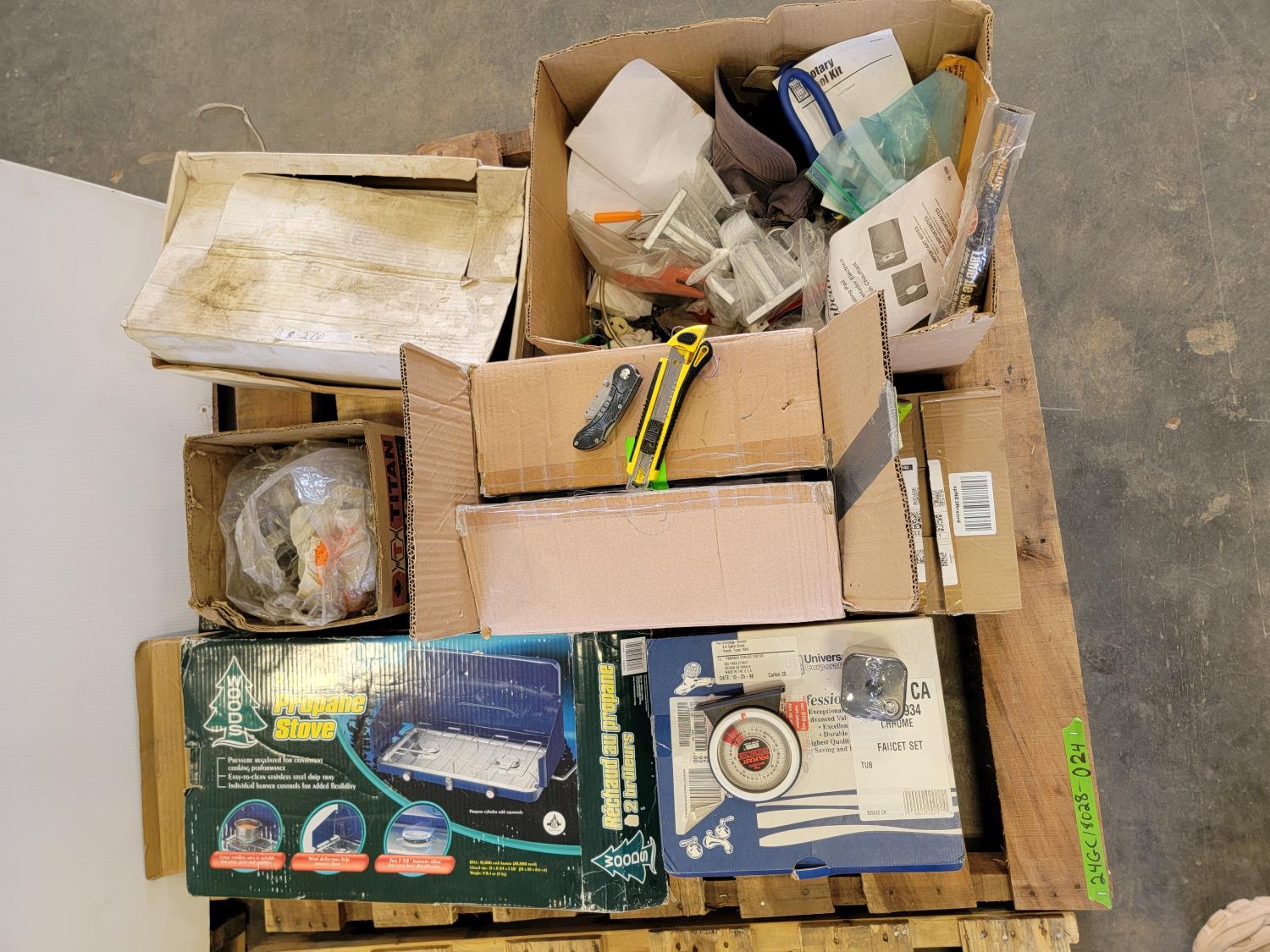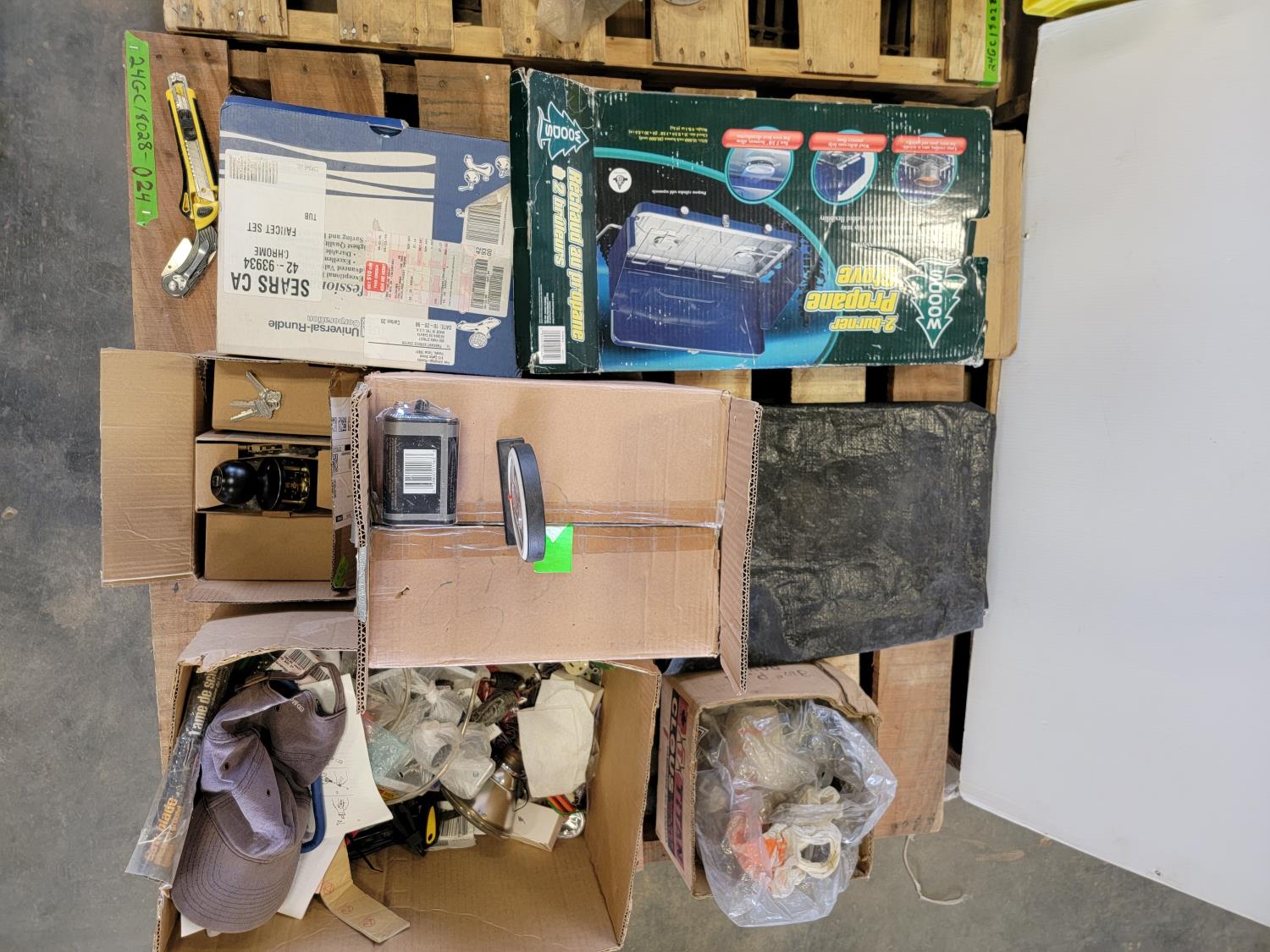 Utility knife, meat mixer, door knobs, protractor, carbon zinc battery, pipe clamps, tarp, two burner propane stove