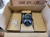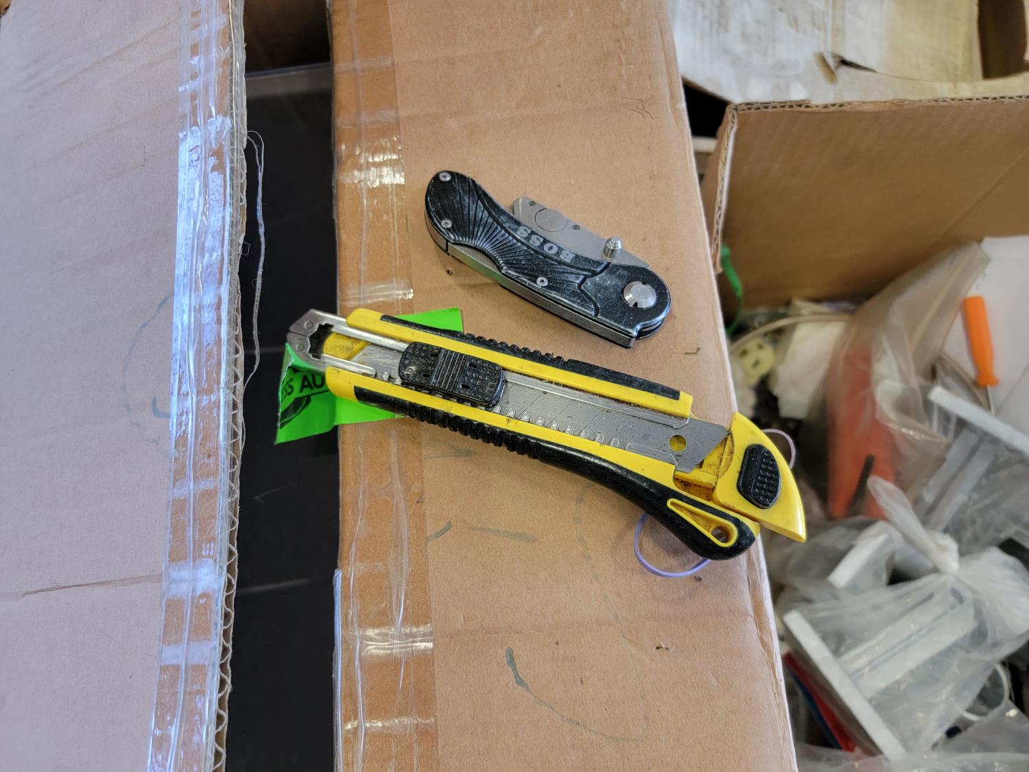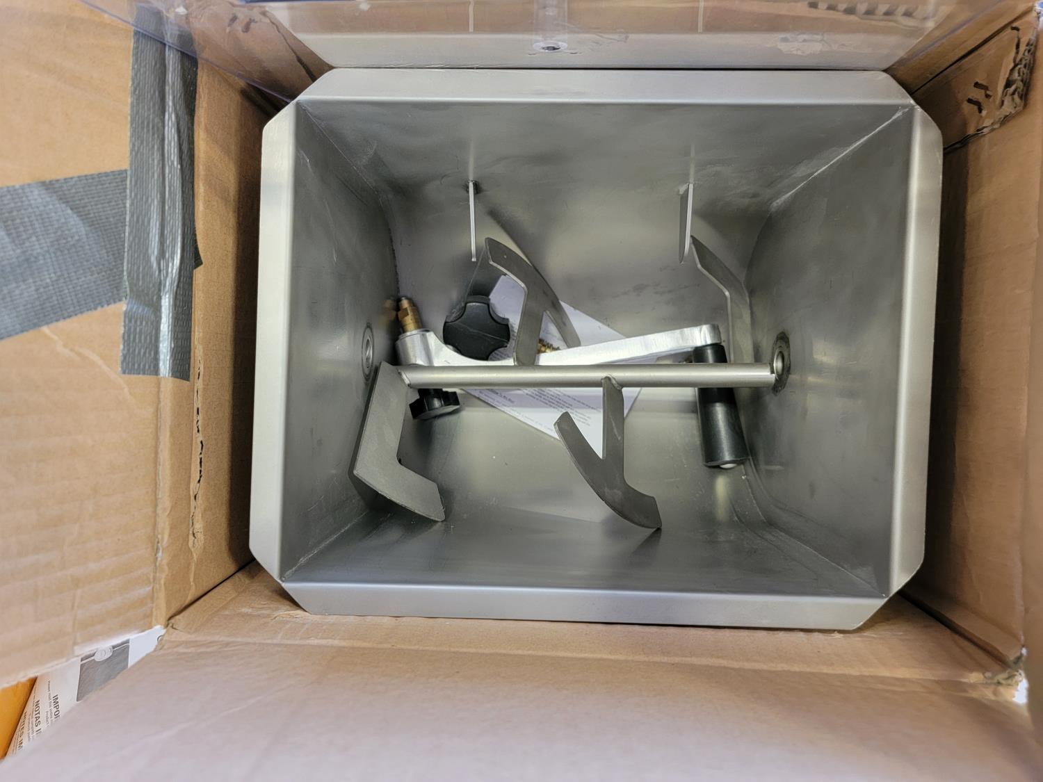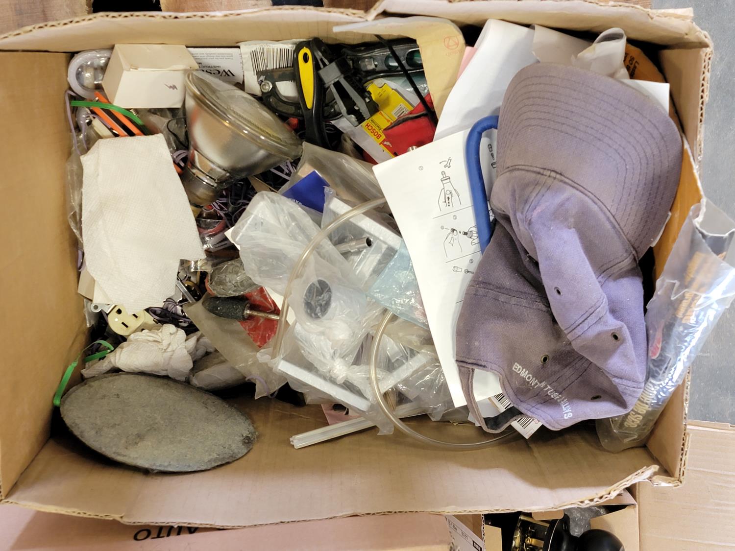Utility knife, meat mixer, door knobs, protractor, carbon zinc battery, pipe clamps, tarp, two burner propane stove