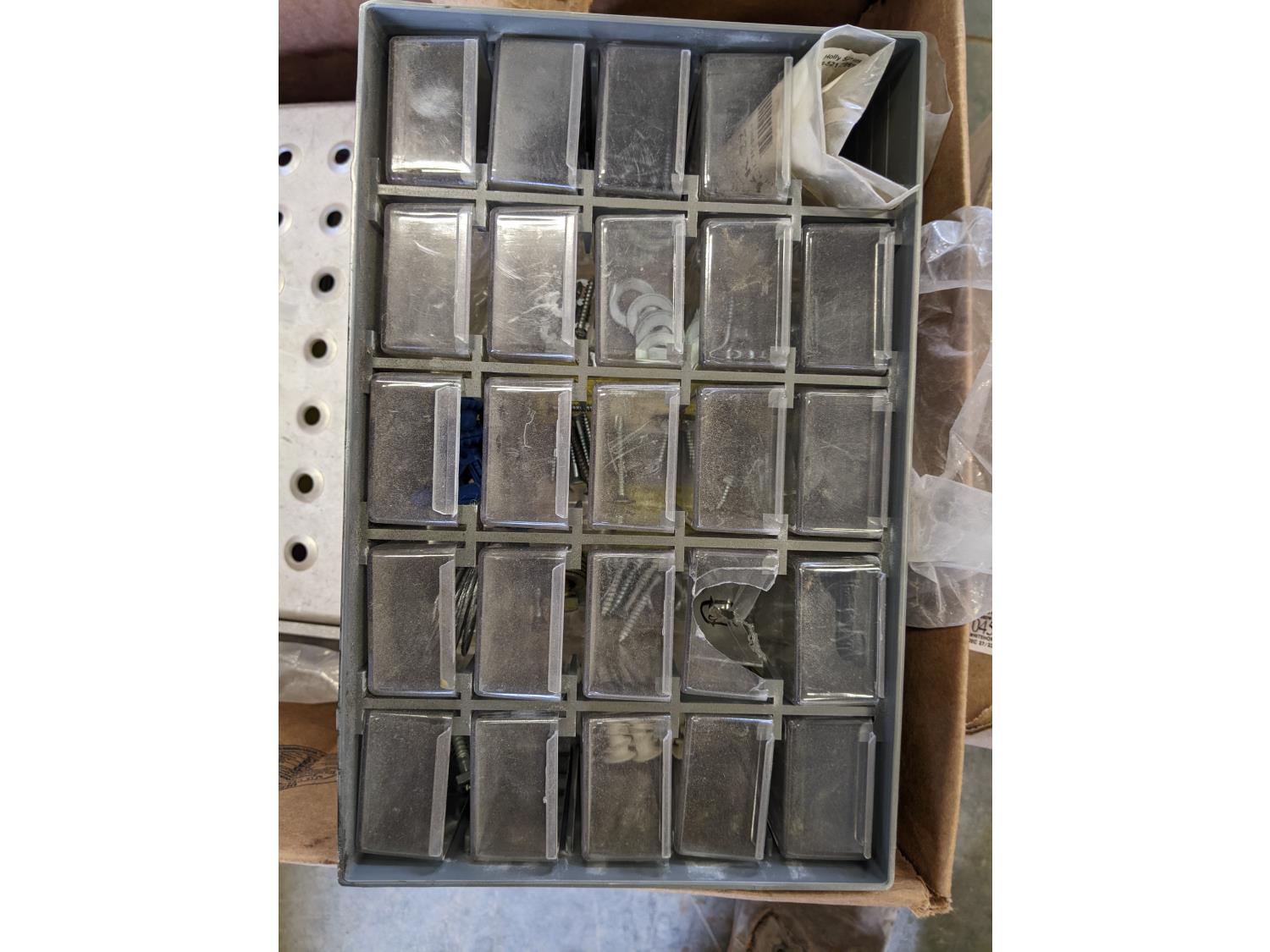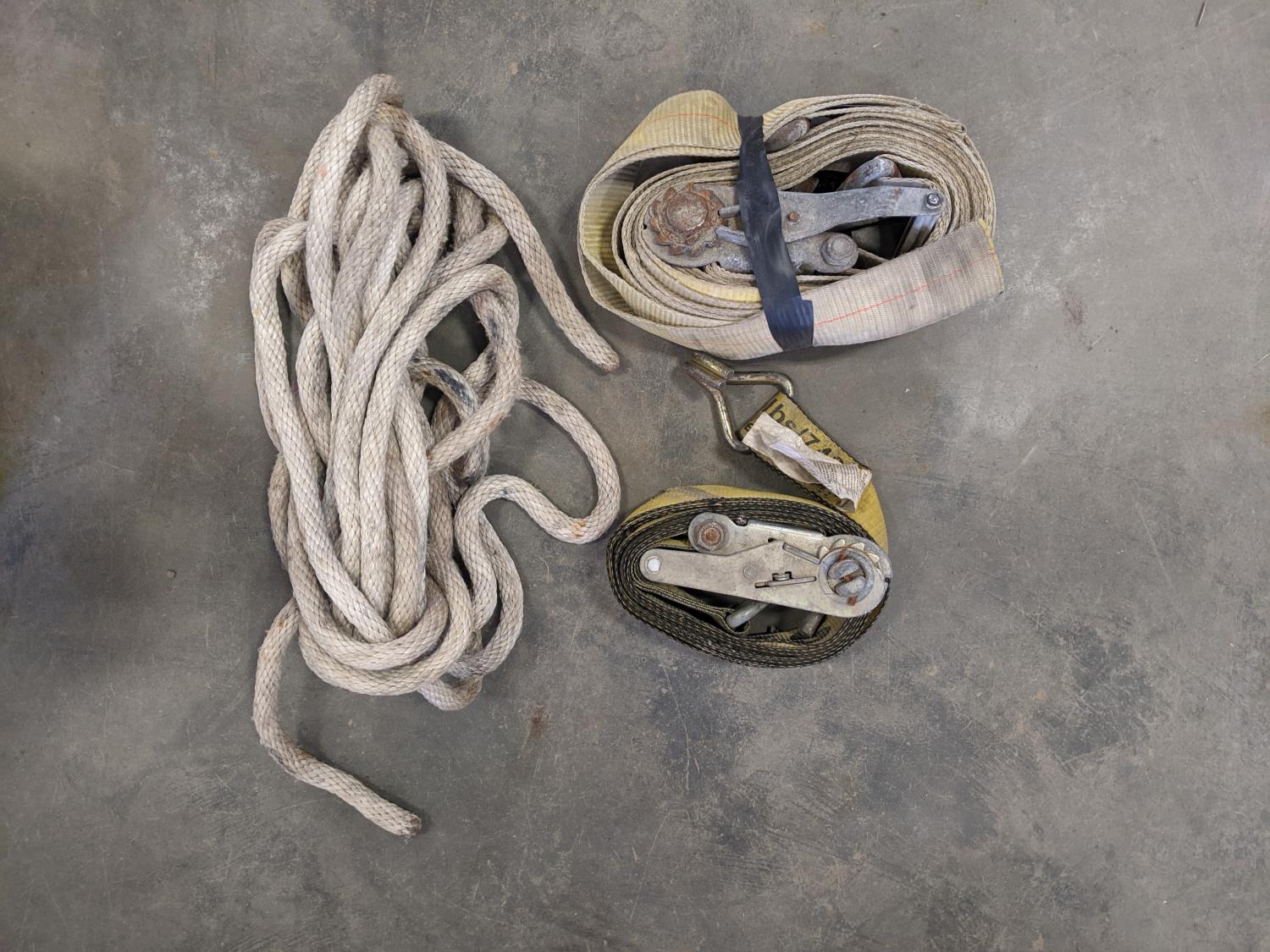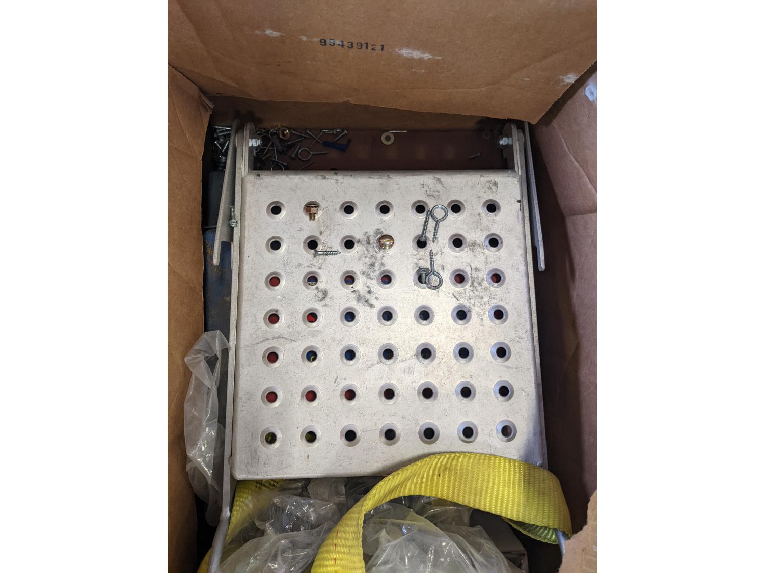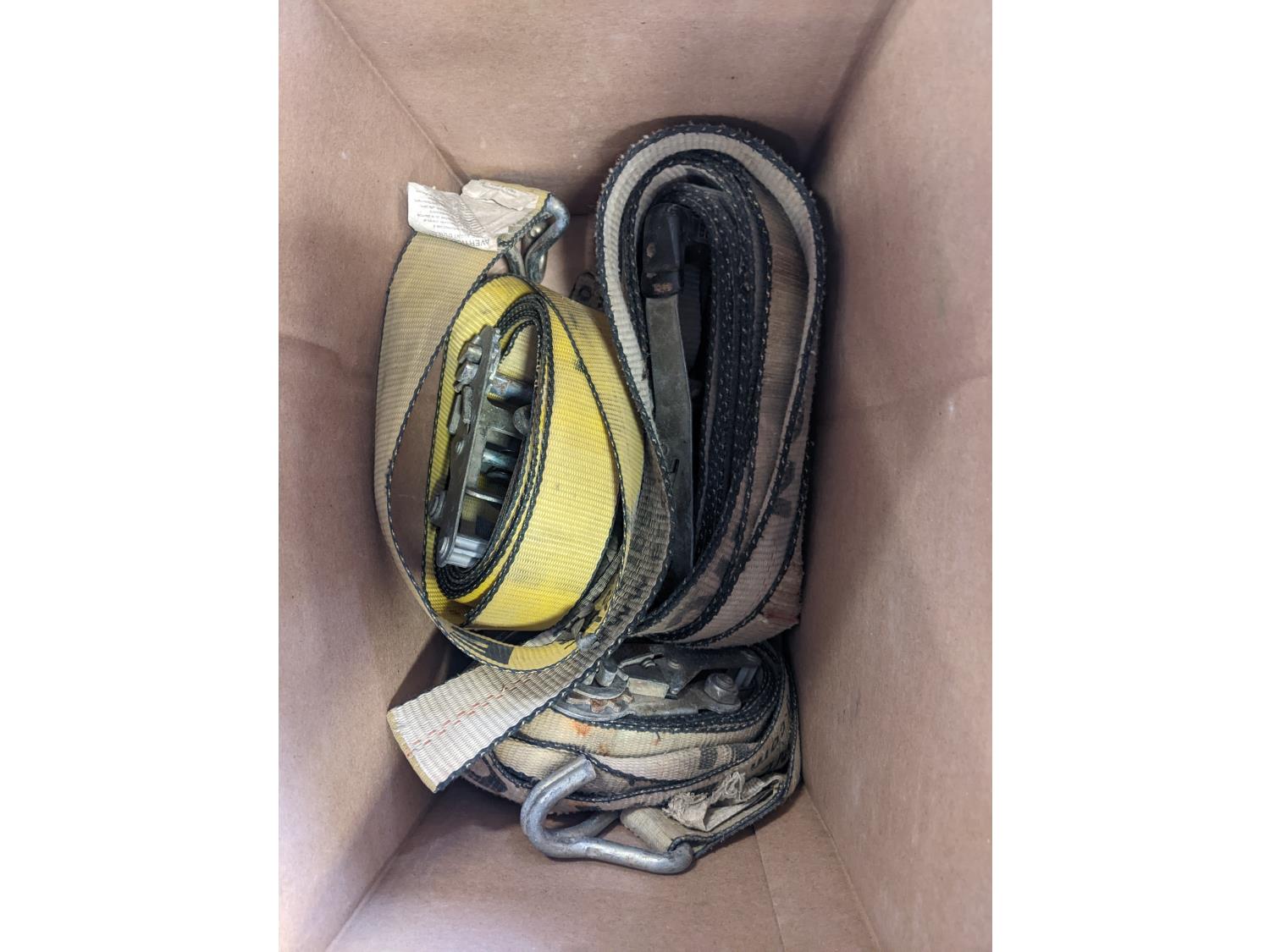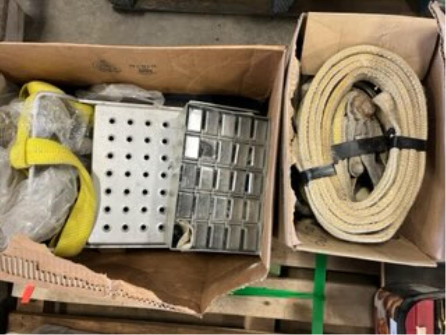 Lifting slings, tie down straps, rope, small platform, drawer organizer with screws and washers