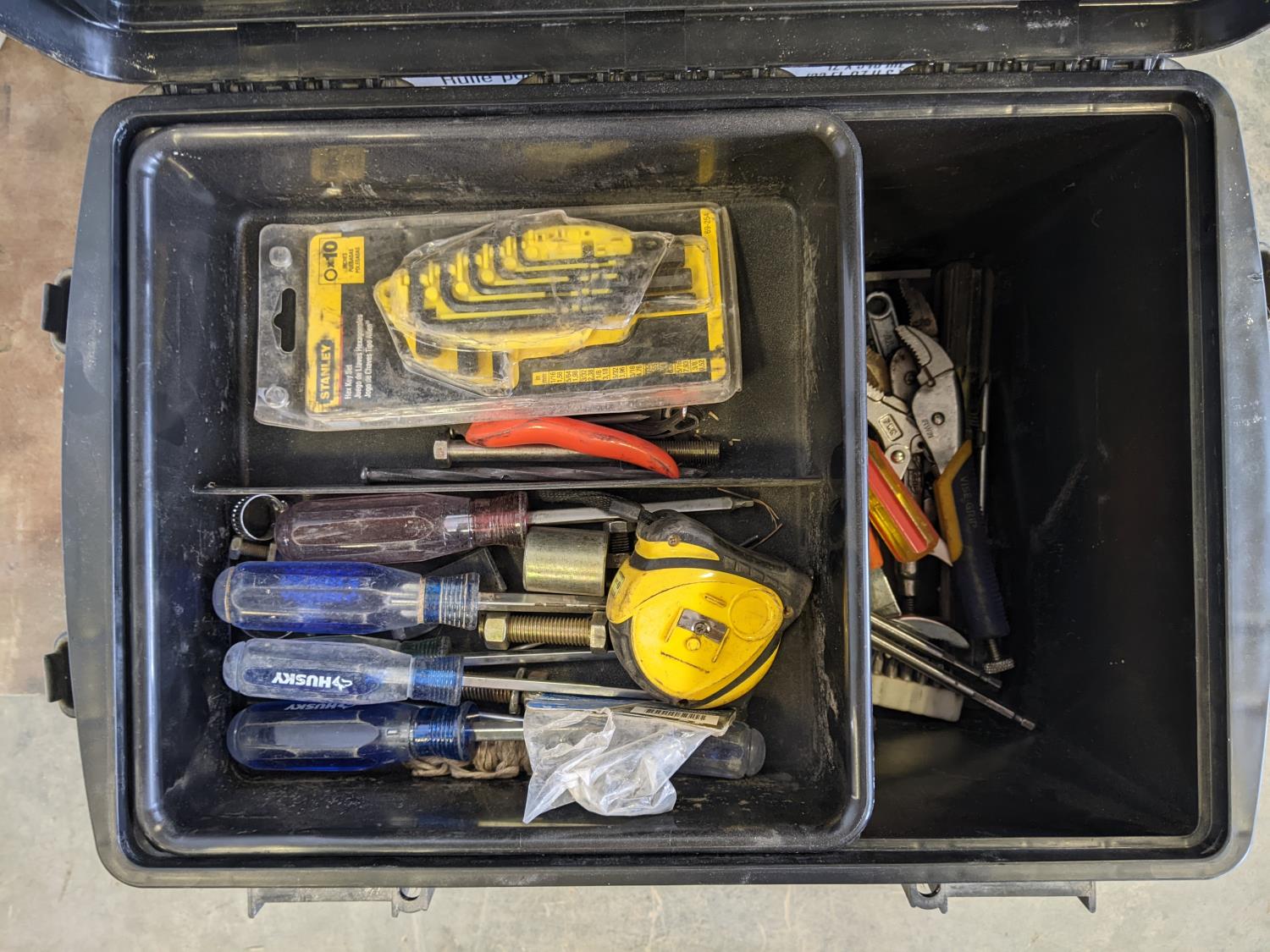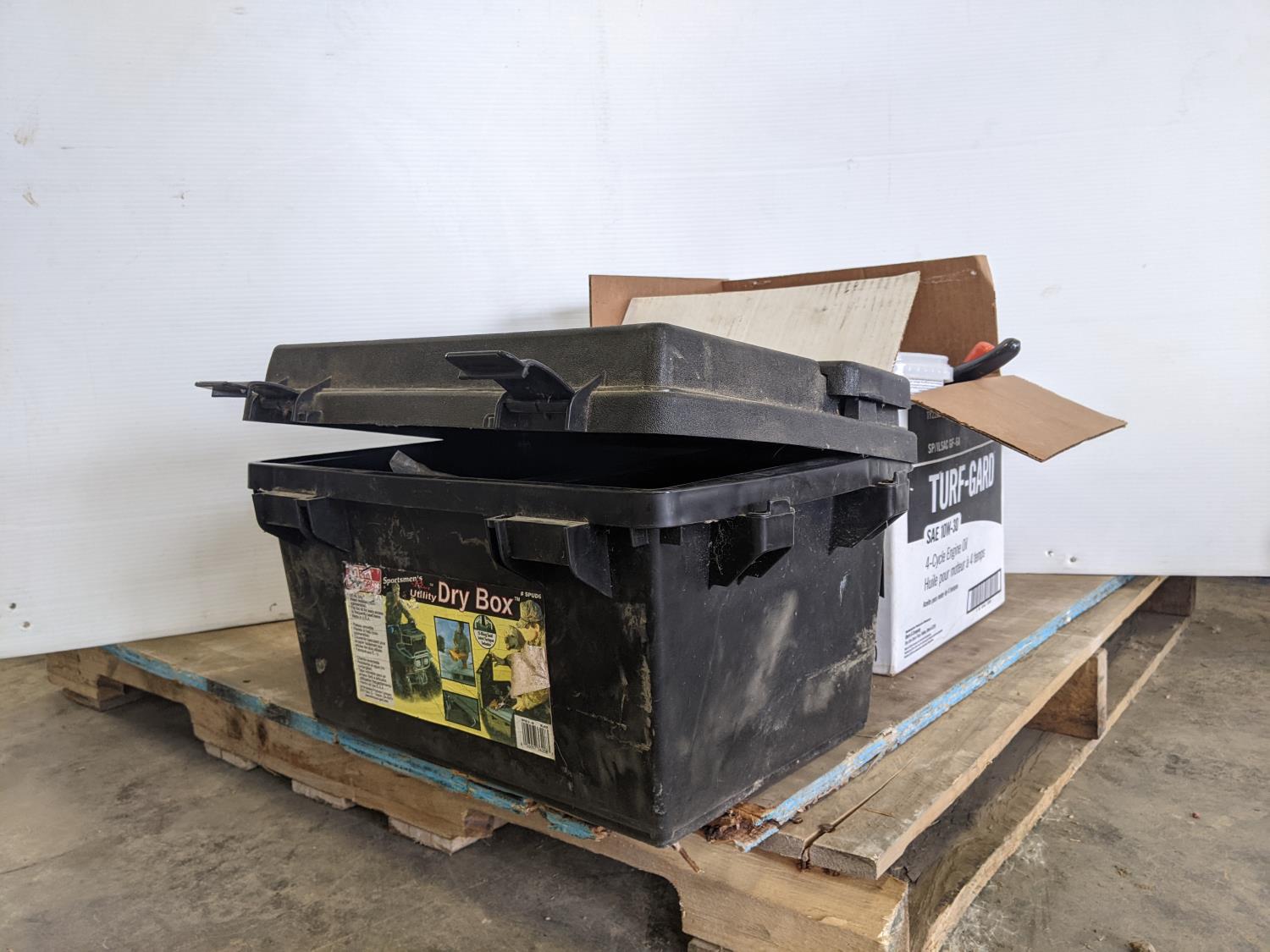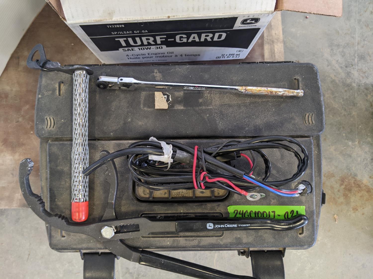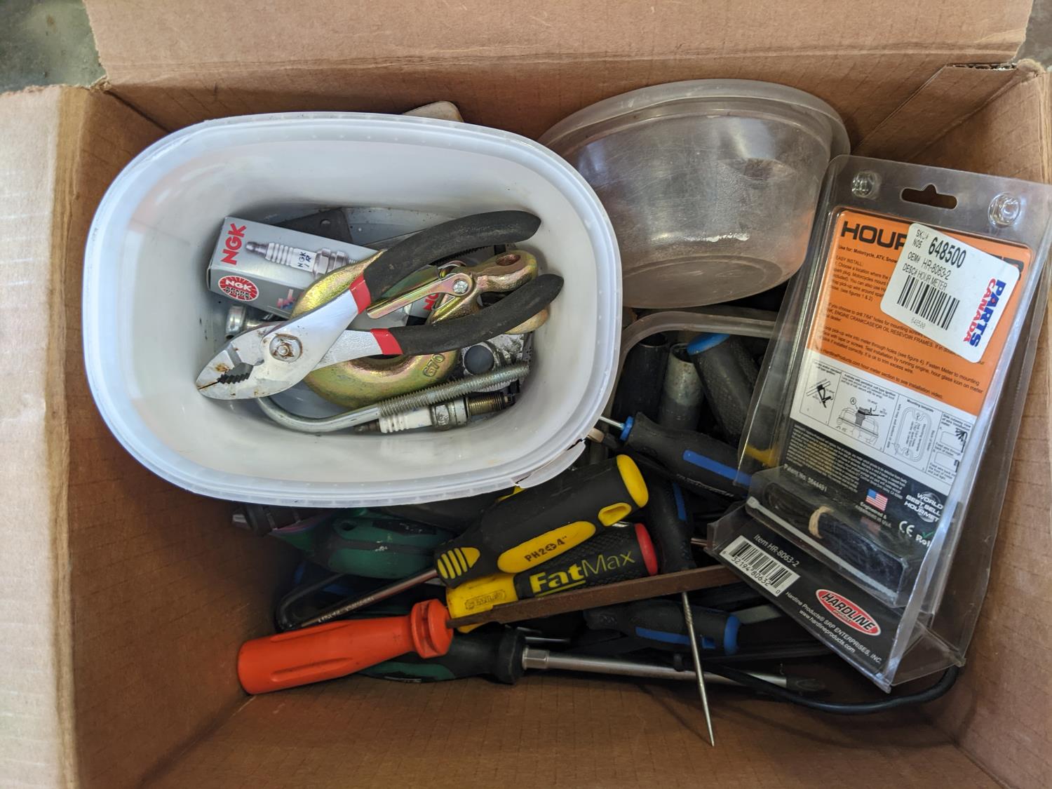 Utility dry box, box of assorted tools, wiring and relay, jerry can screw cap, piece hrs meter