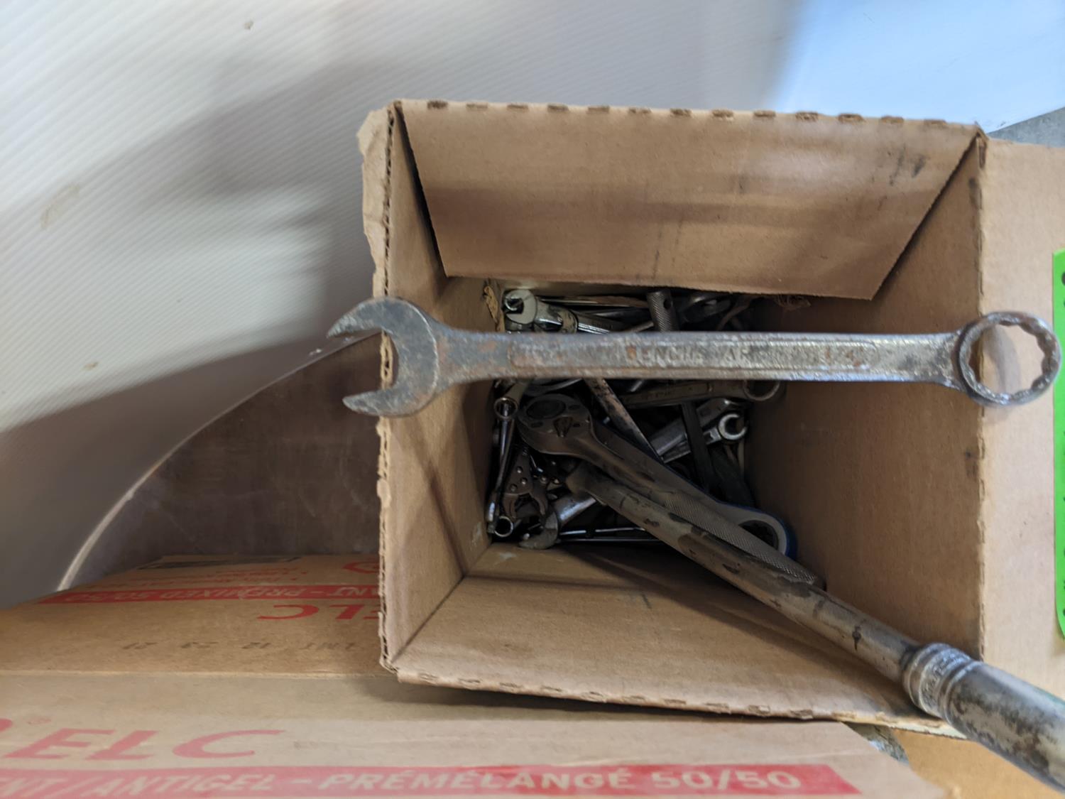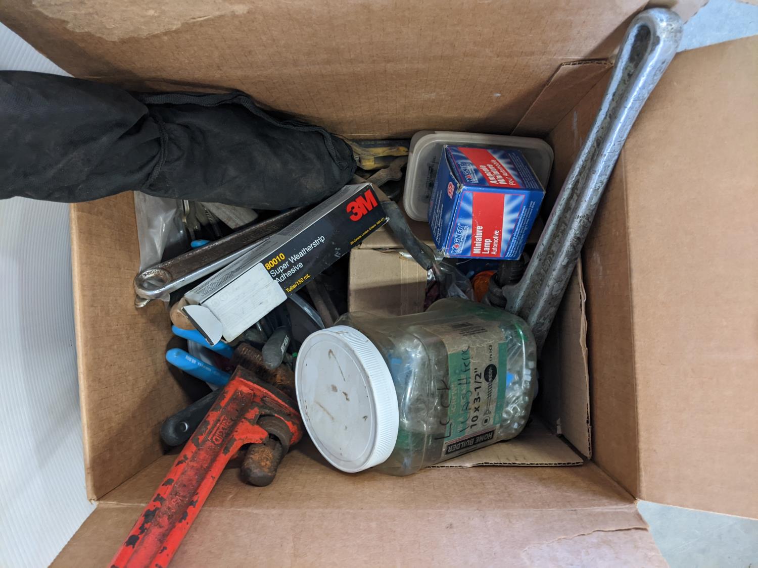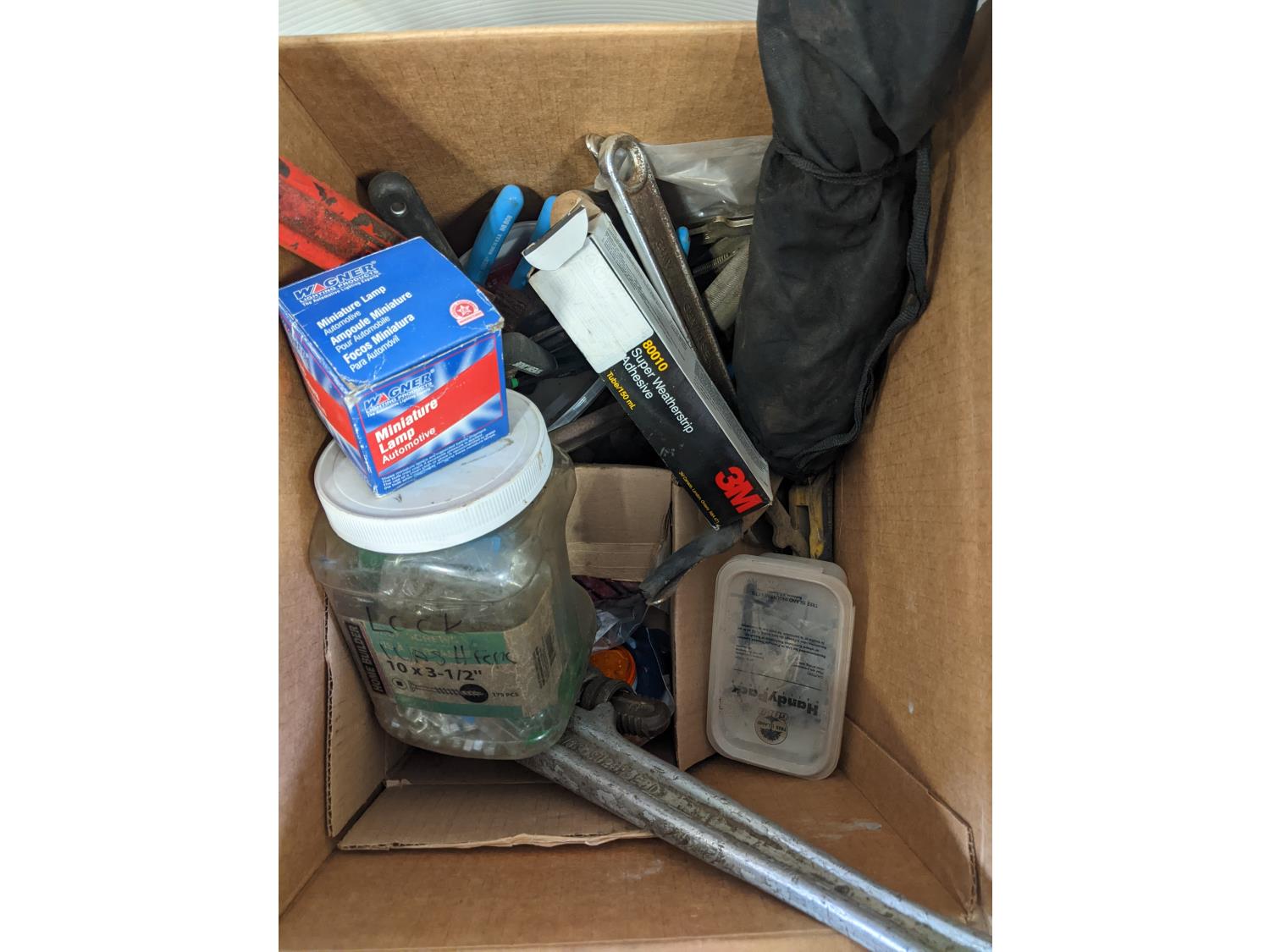 3 M adhesive, pipe wrench, assorted wrenches, automotive miniature lamp, lock washers and machine screws
