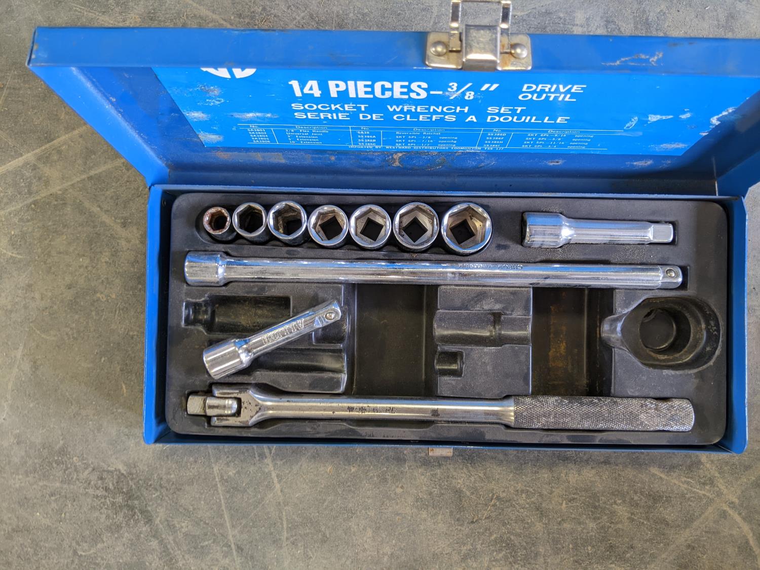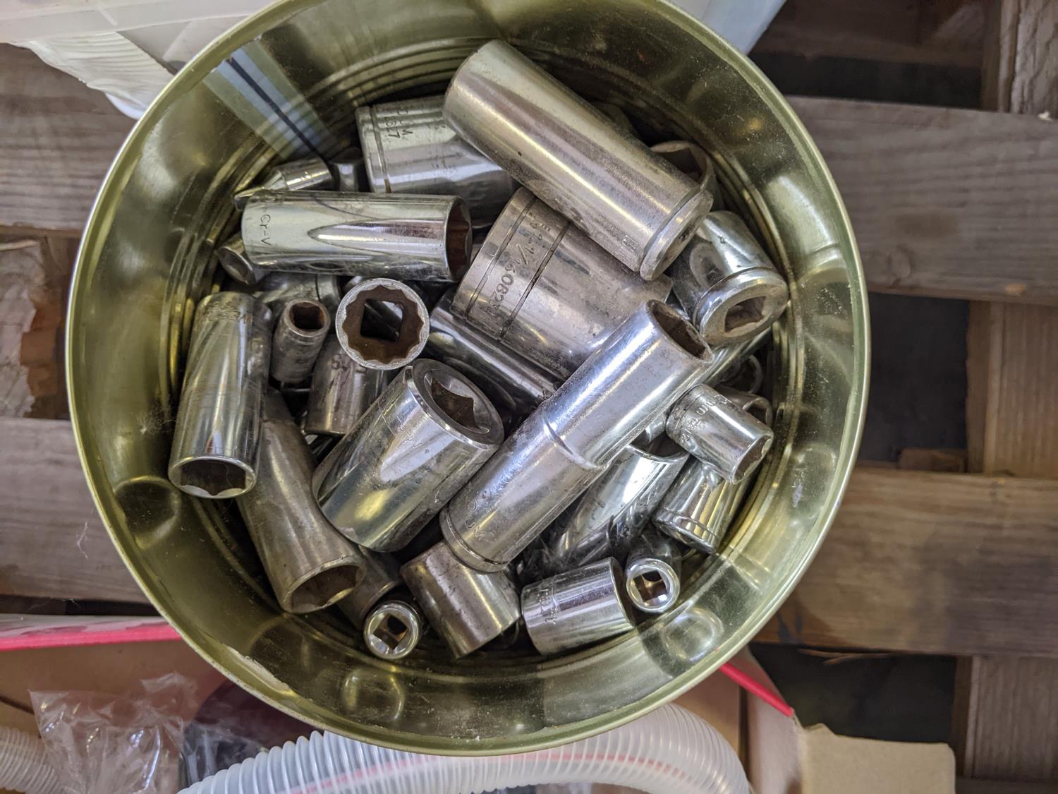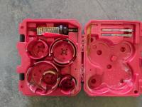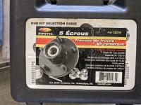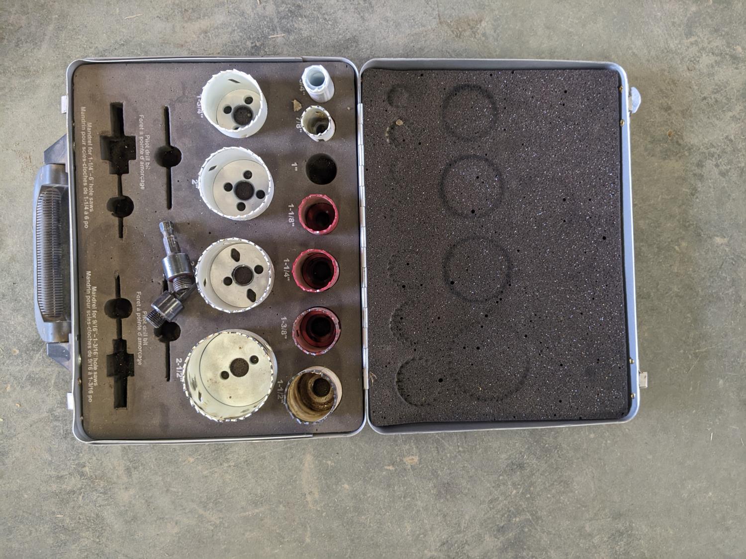 Sockets wrench set, dust hose, oil filter, wrench, battery powered fuel pump, socket wrench set, exhaust clamp, hole bits, hub kit guide, grease gun, hole saw kit, battery charger