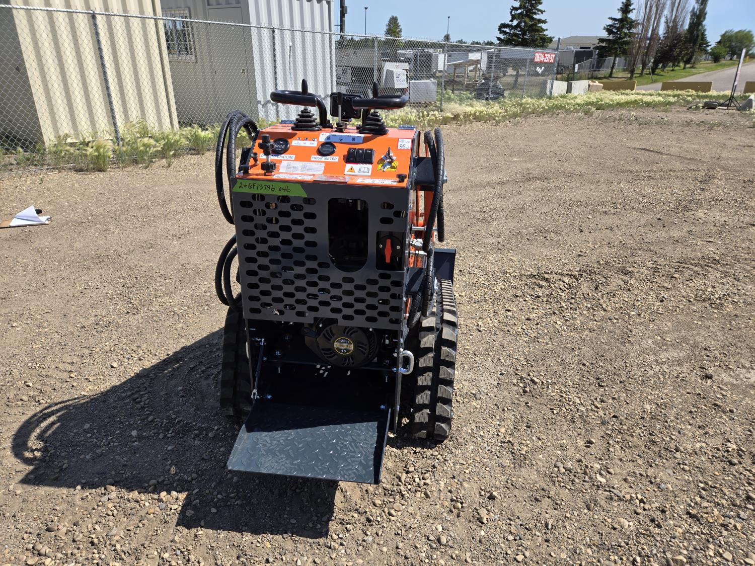 Open station, 420cc gas engine, 38 inch smooth bucket, manual coupler, 1 auxiliary hydraulics, 6 inch rubber tracks