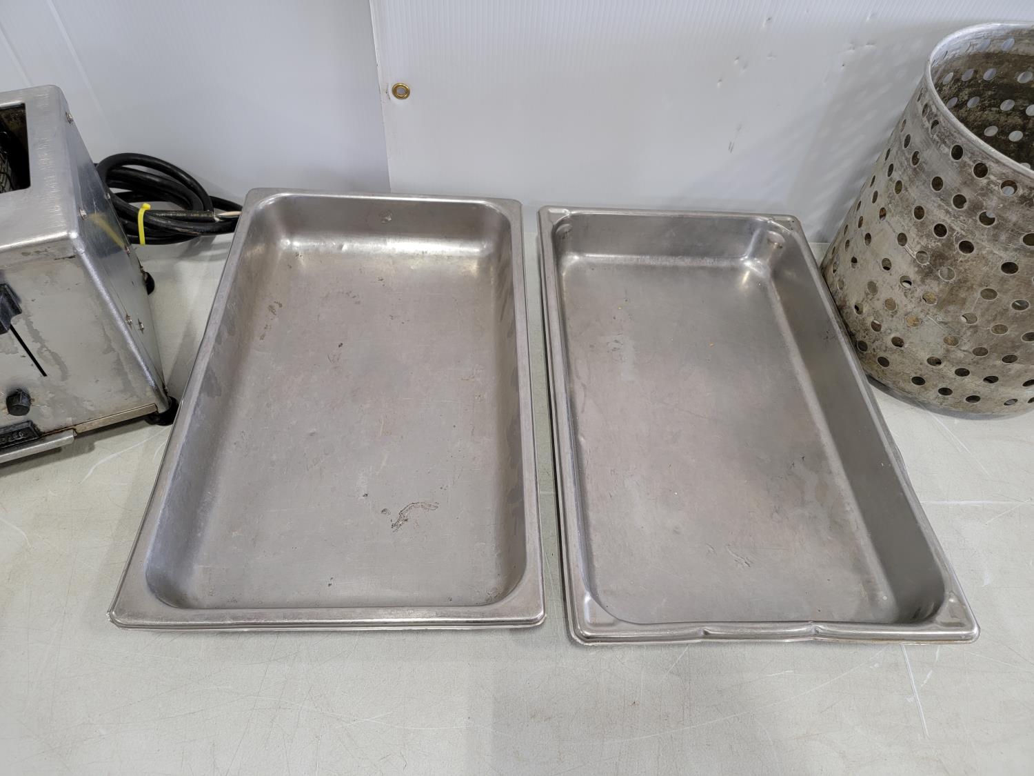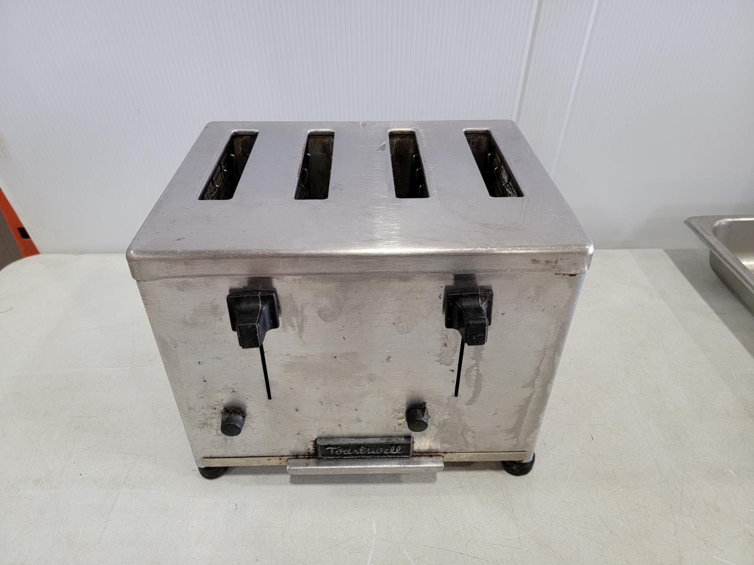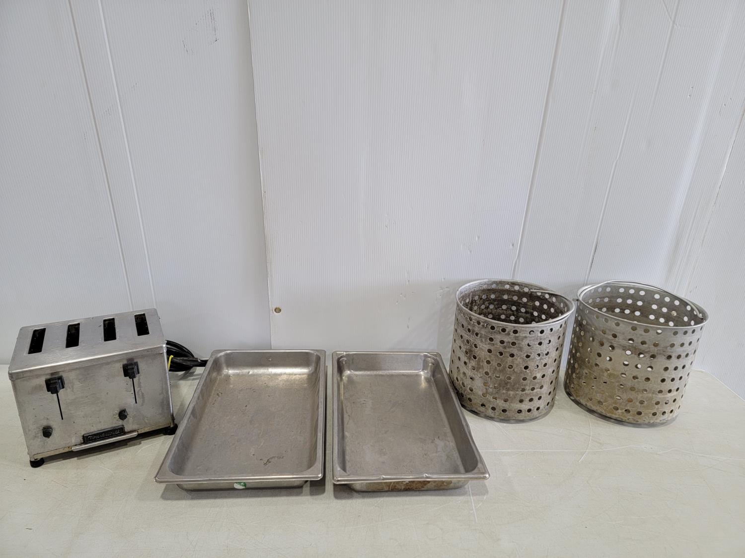 1384 Toastswell 208 V 4 Slot Commercial Toaster, (2) Deep Fryer Baskets and (2) Stainless Steel Serving Trays