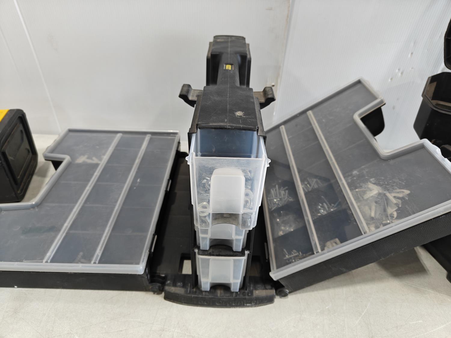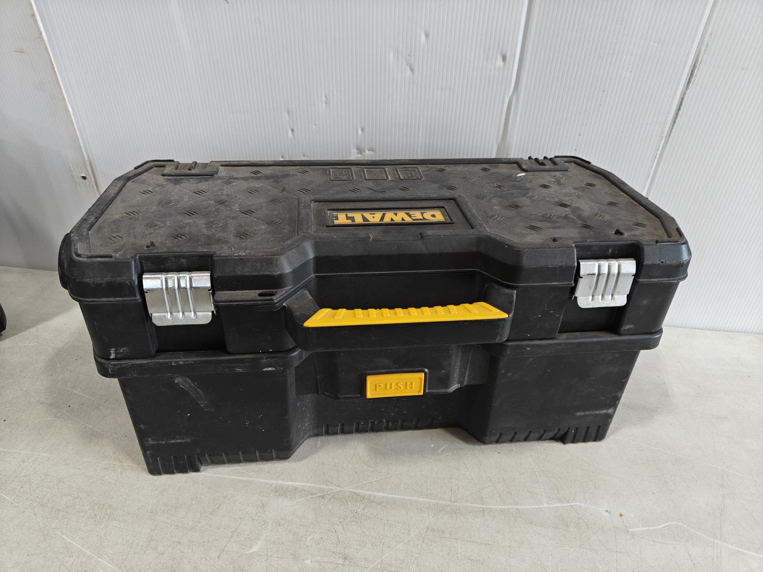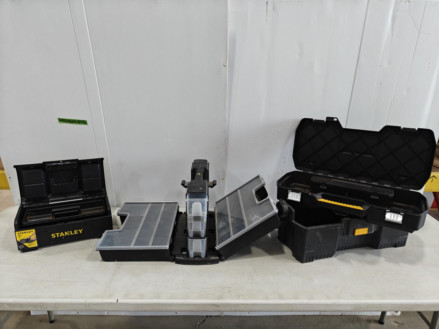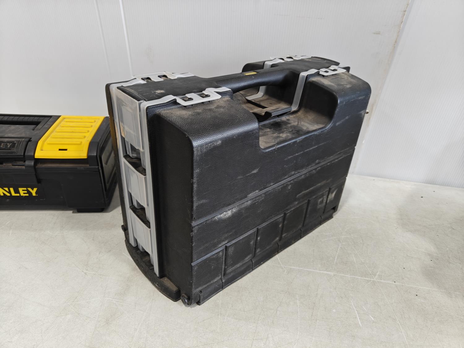 small empty Stanley toolbox, Stanly hardware storage box with contents, large empty DeWalt toolbox