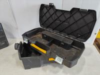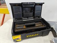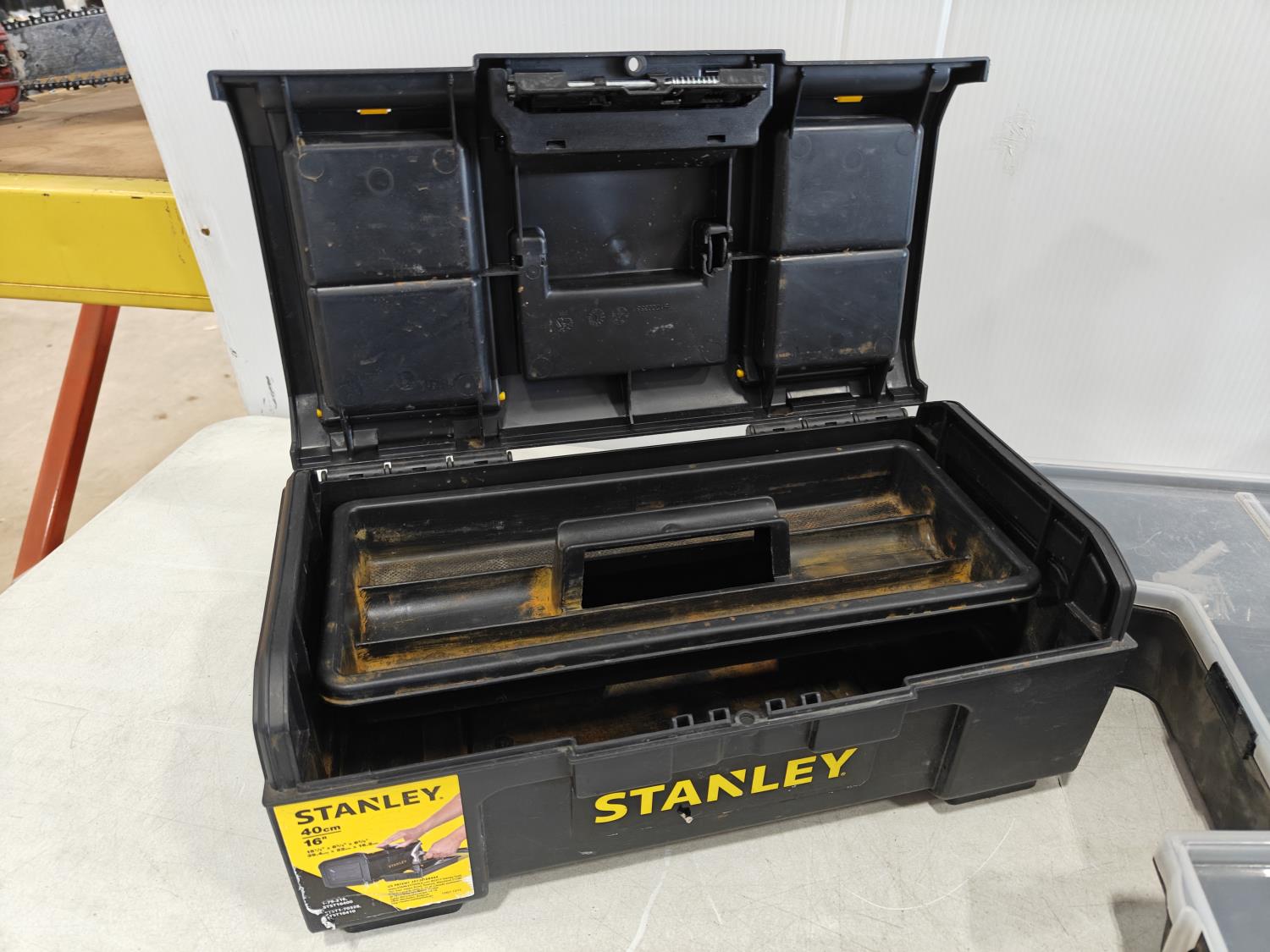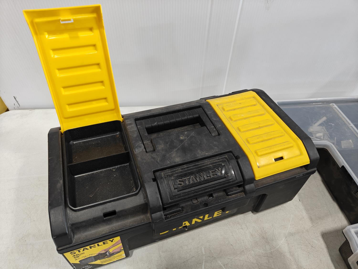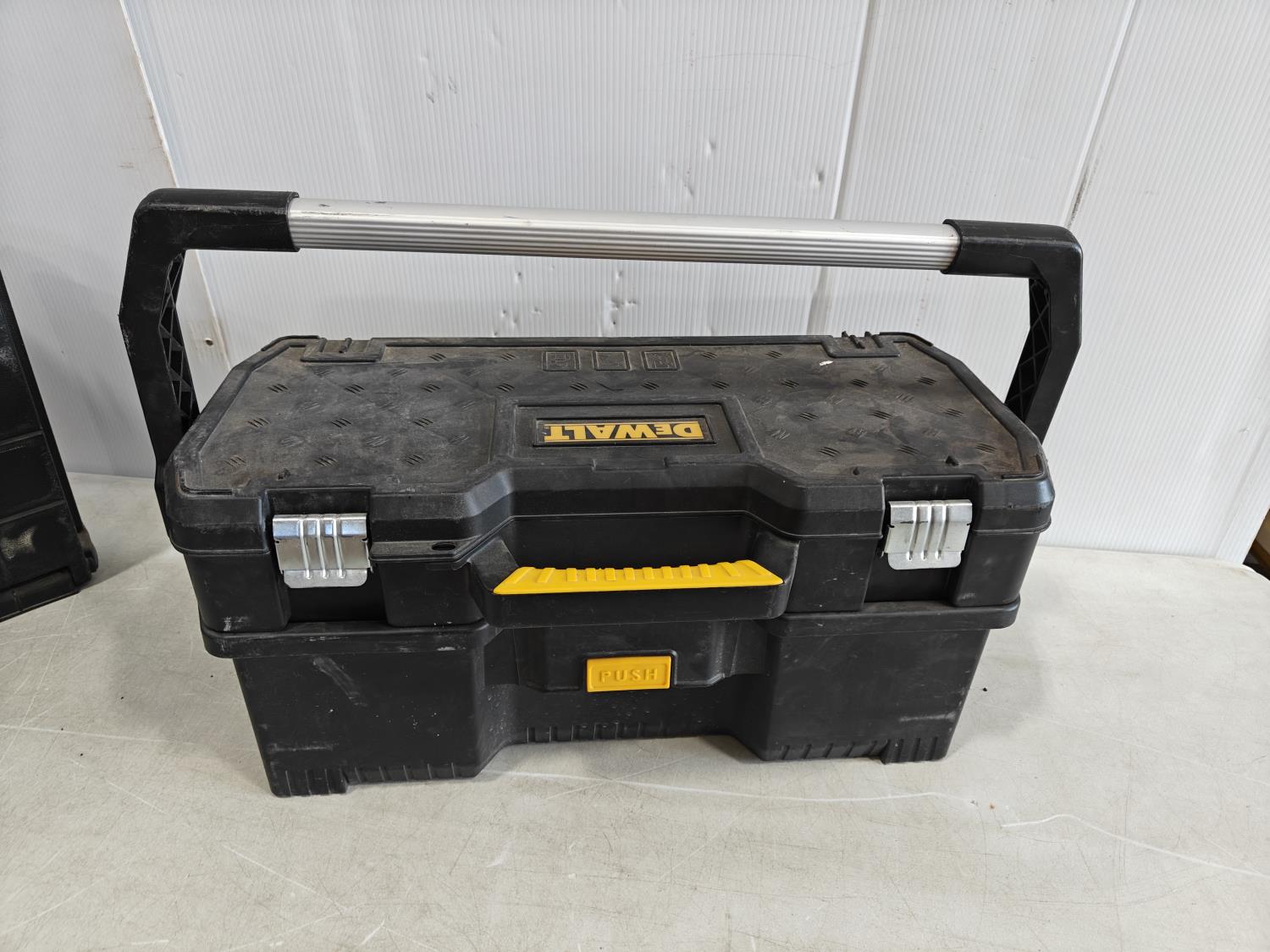 small empty Stanley toolbox, Stanly hardware storage box with contents, large empty DeWalt toolbox
