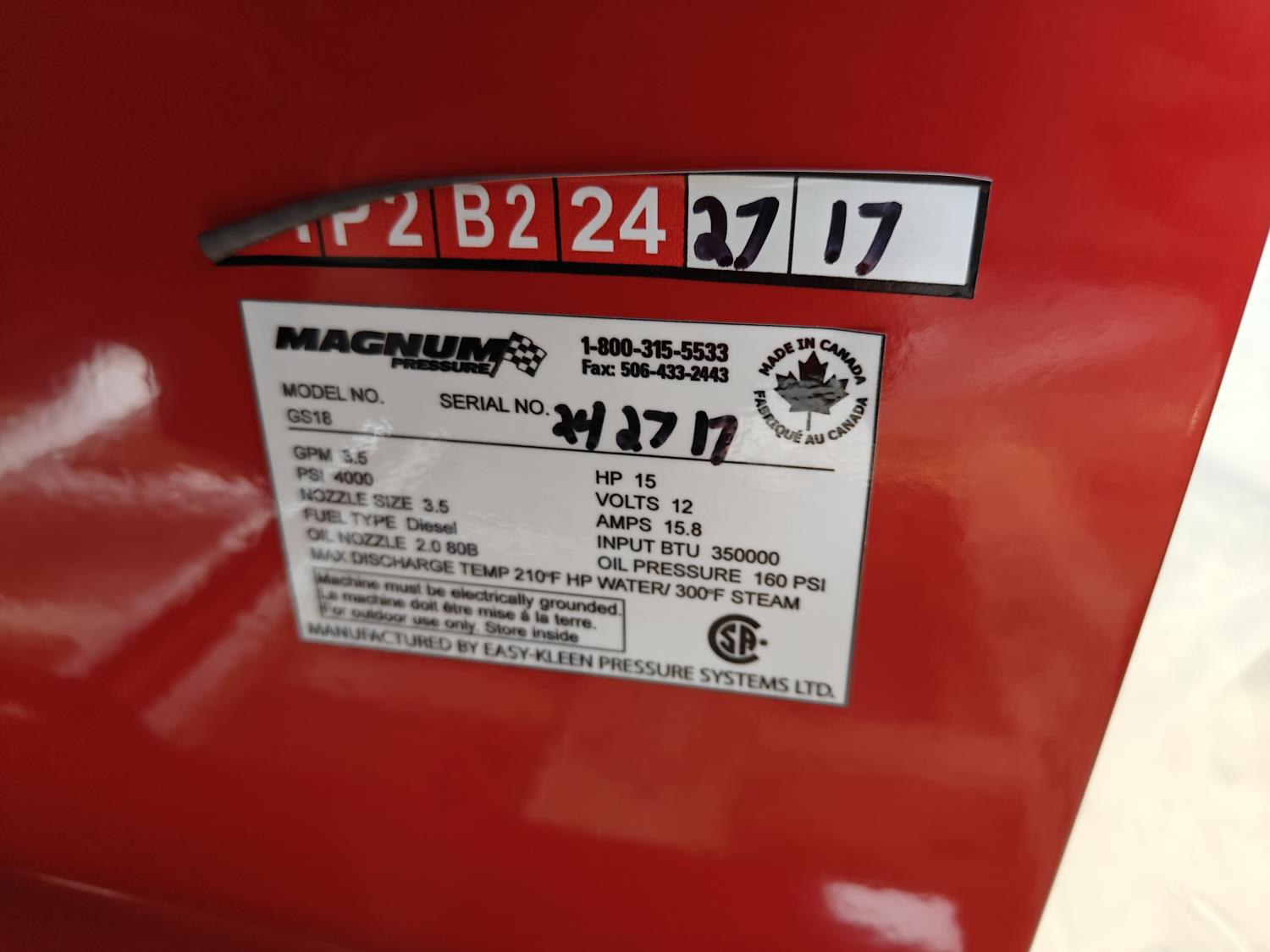 3.5 GPM at 4000 PSI, 15 HP, gasoline engine, electric start, 12 volt burner, oil/diesel fired burned/thermostat, schedule 80 coil with stainless steel housing, fully welded, powder coated frame, 10 gallon poly fuel tank