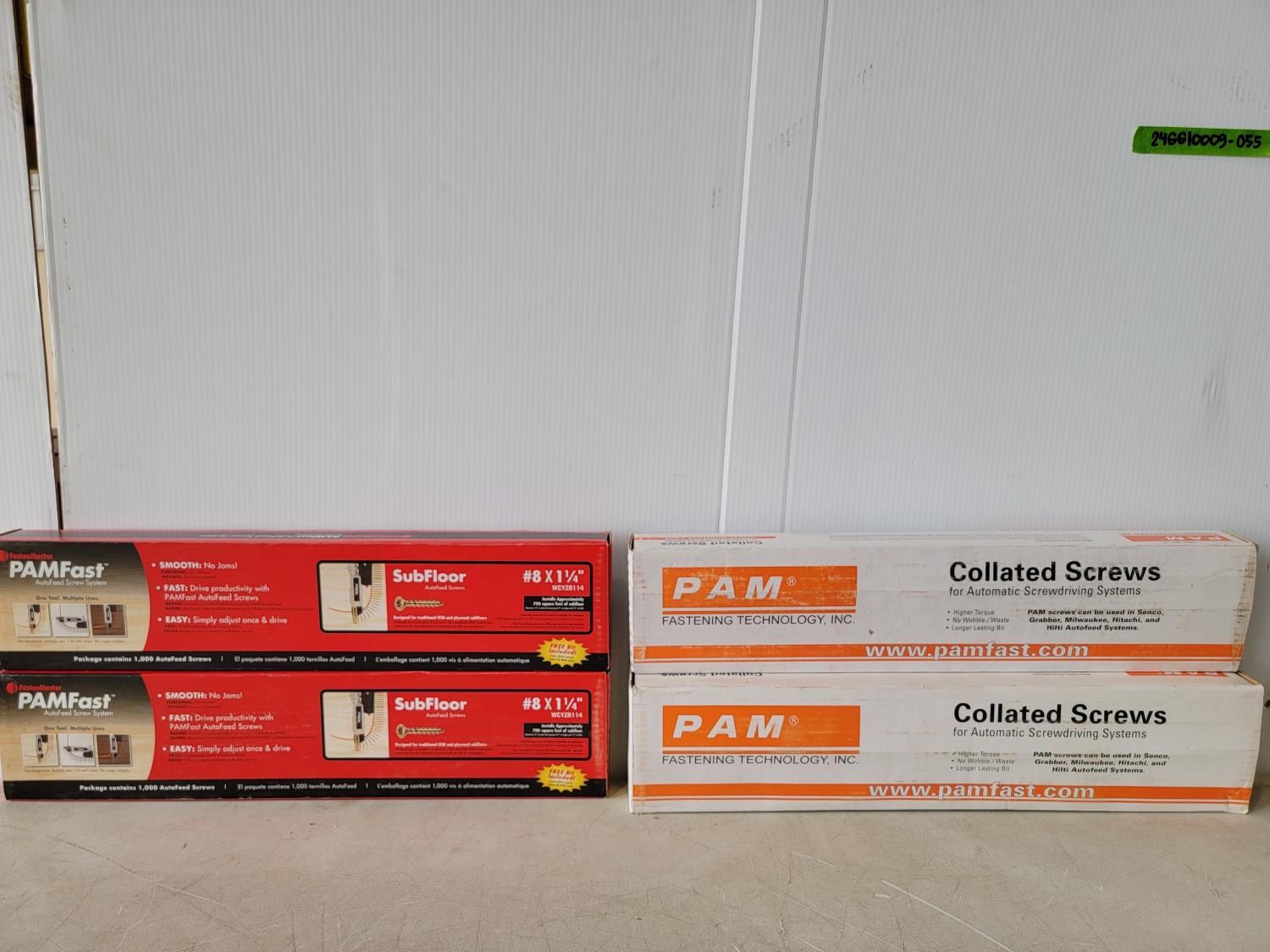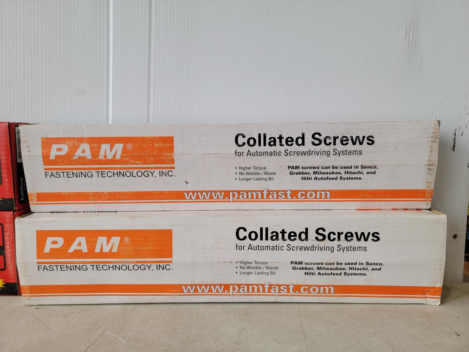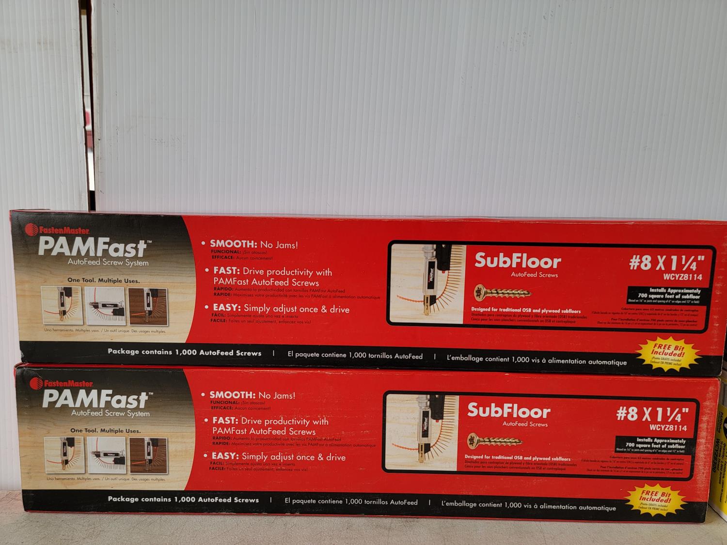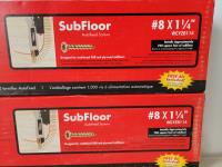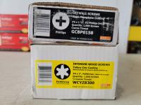 Drywall screws black phosphate coating #6x1-5/8, #2 phillips drive, coarse thread Interior wood screws, Yellow zinc coating #8 x 3 inch, PAMdrive, 2/3 coarse thread, Subfloor autofeed screws #8 x 1-1/4 inch