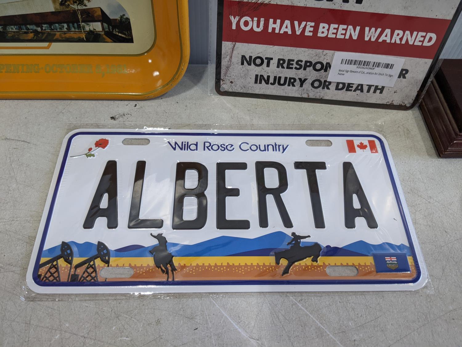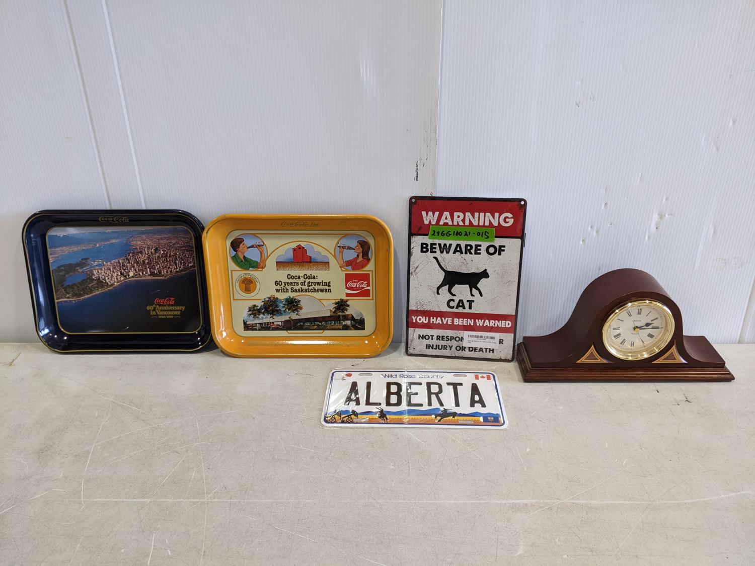 1552 Coca-Cola Signs, Beware of Cat Sign, Alberta Novelty Plate, Mantel Clock