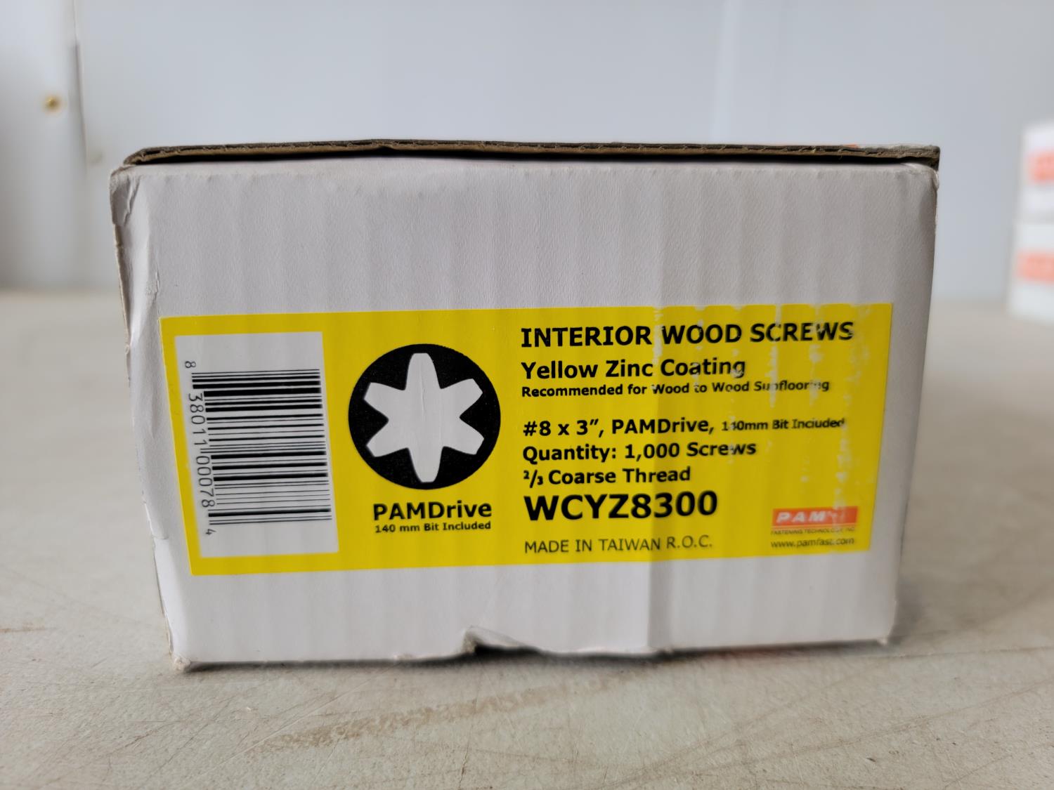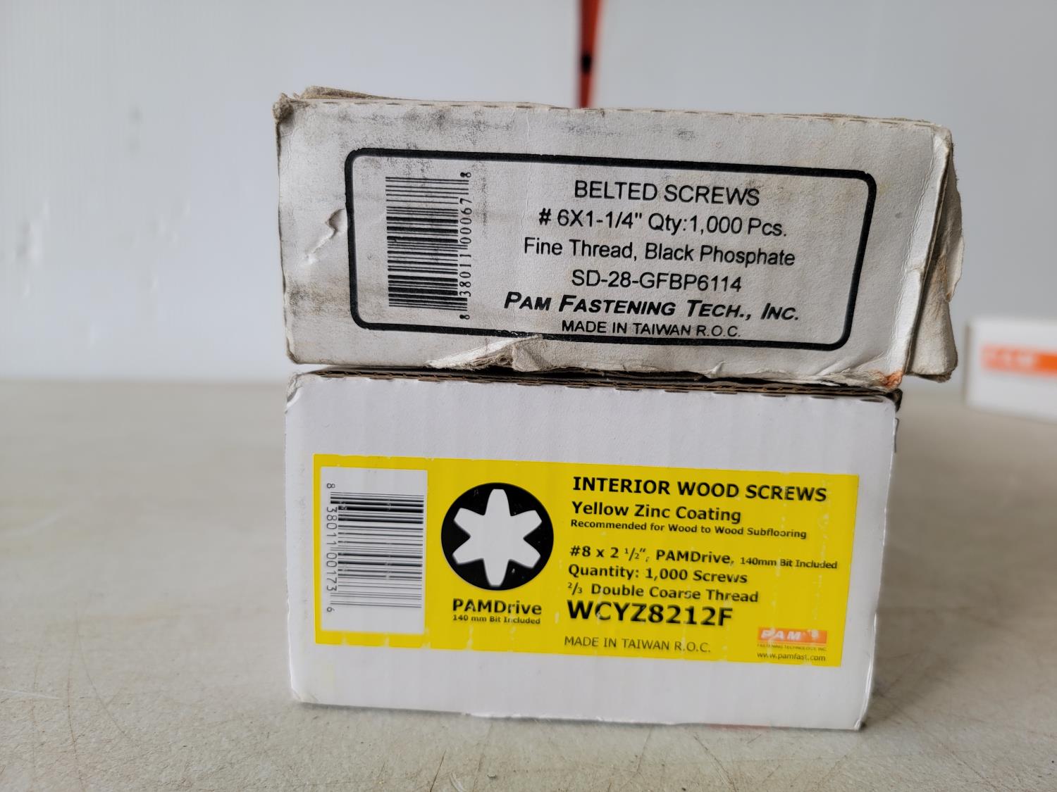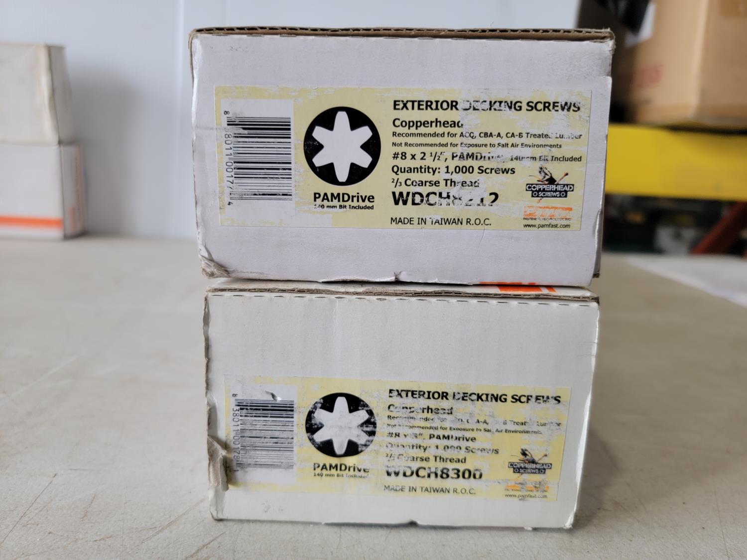 (2) boxes of #8 x 2-1/2 PAMDrive 2/3 coarse thread, (2) boxes of #8 x 3 inch PAMDrive 2/3 coarse thread (1) box of #6 x 1-1/4 inch black phosphate fine thread