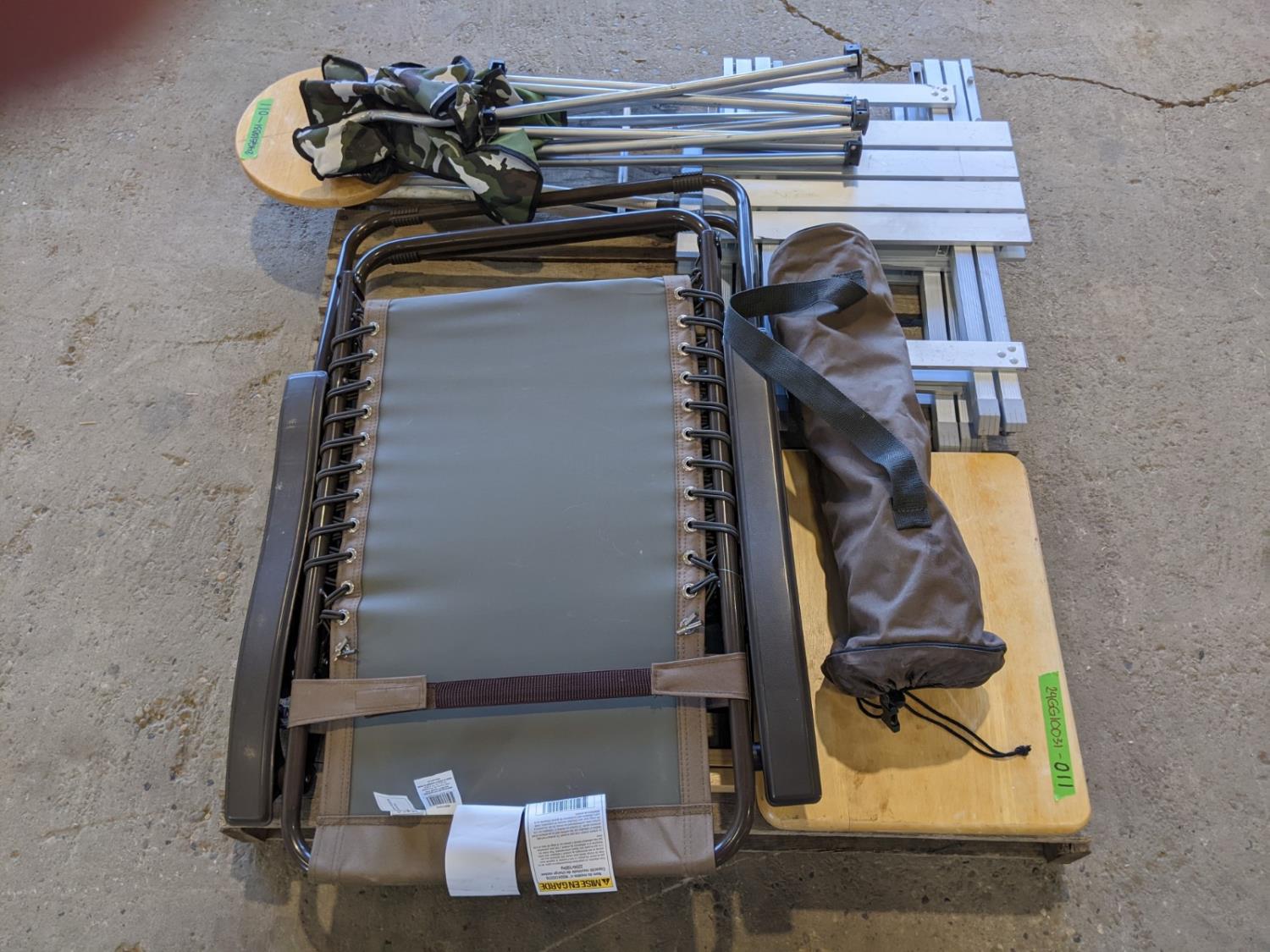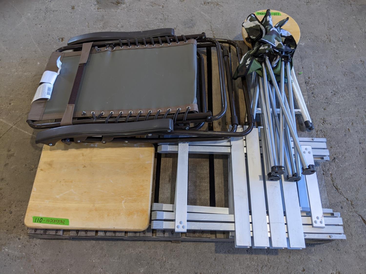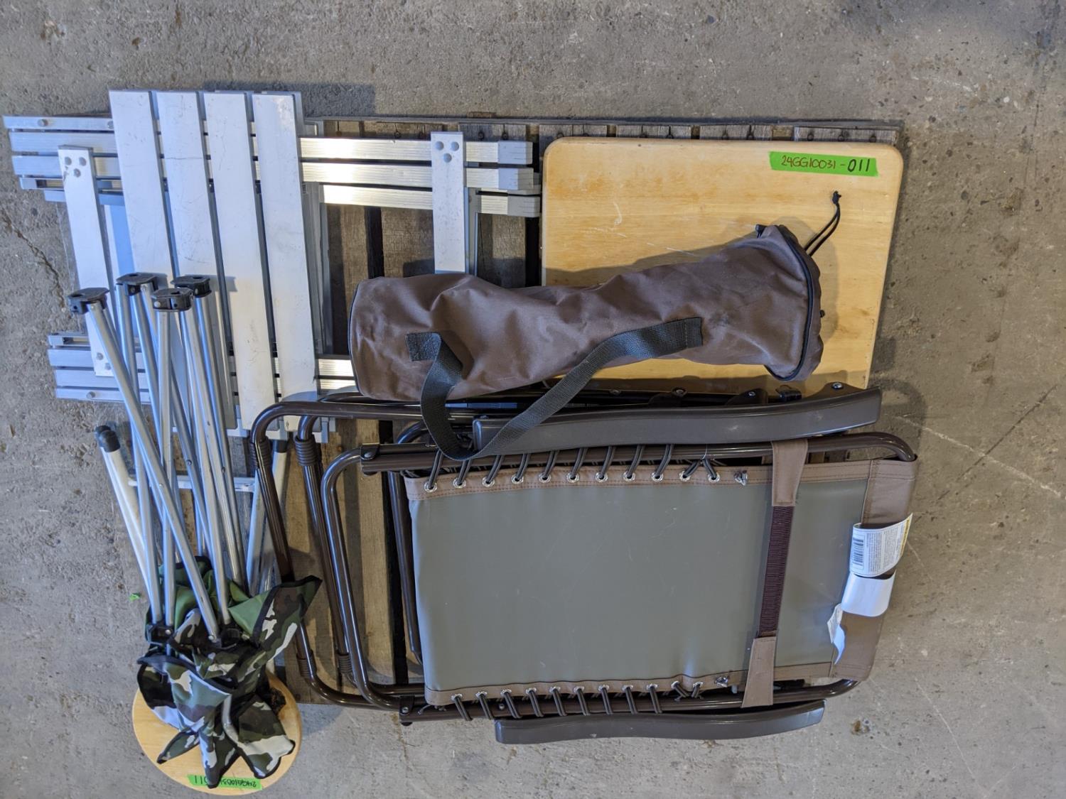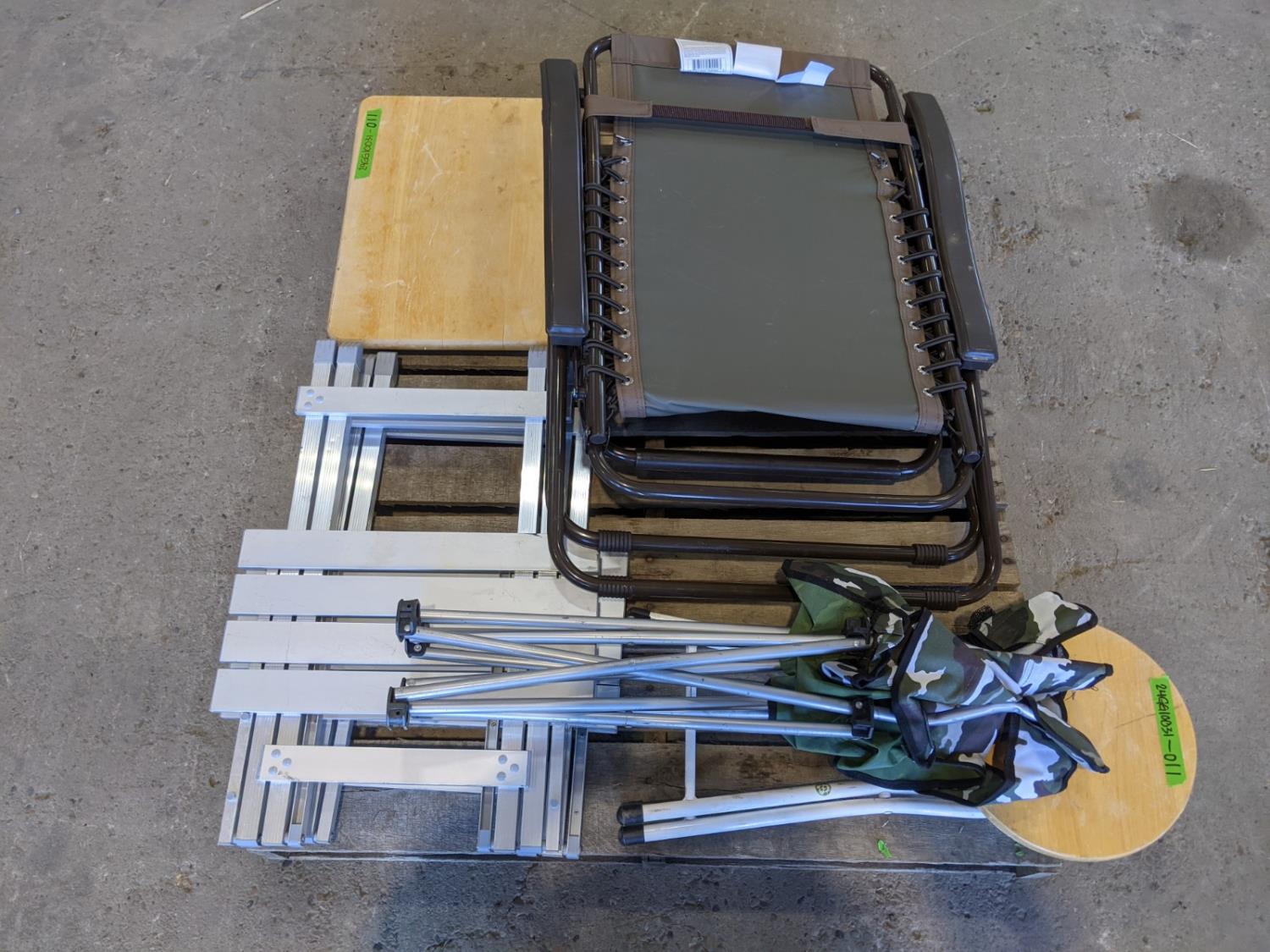 Foldable lounge chair, (2) aluminum side tables, (1) wooden folding table, (2) foldable chairs, (1) wooden foldable stool
