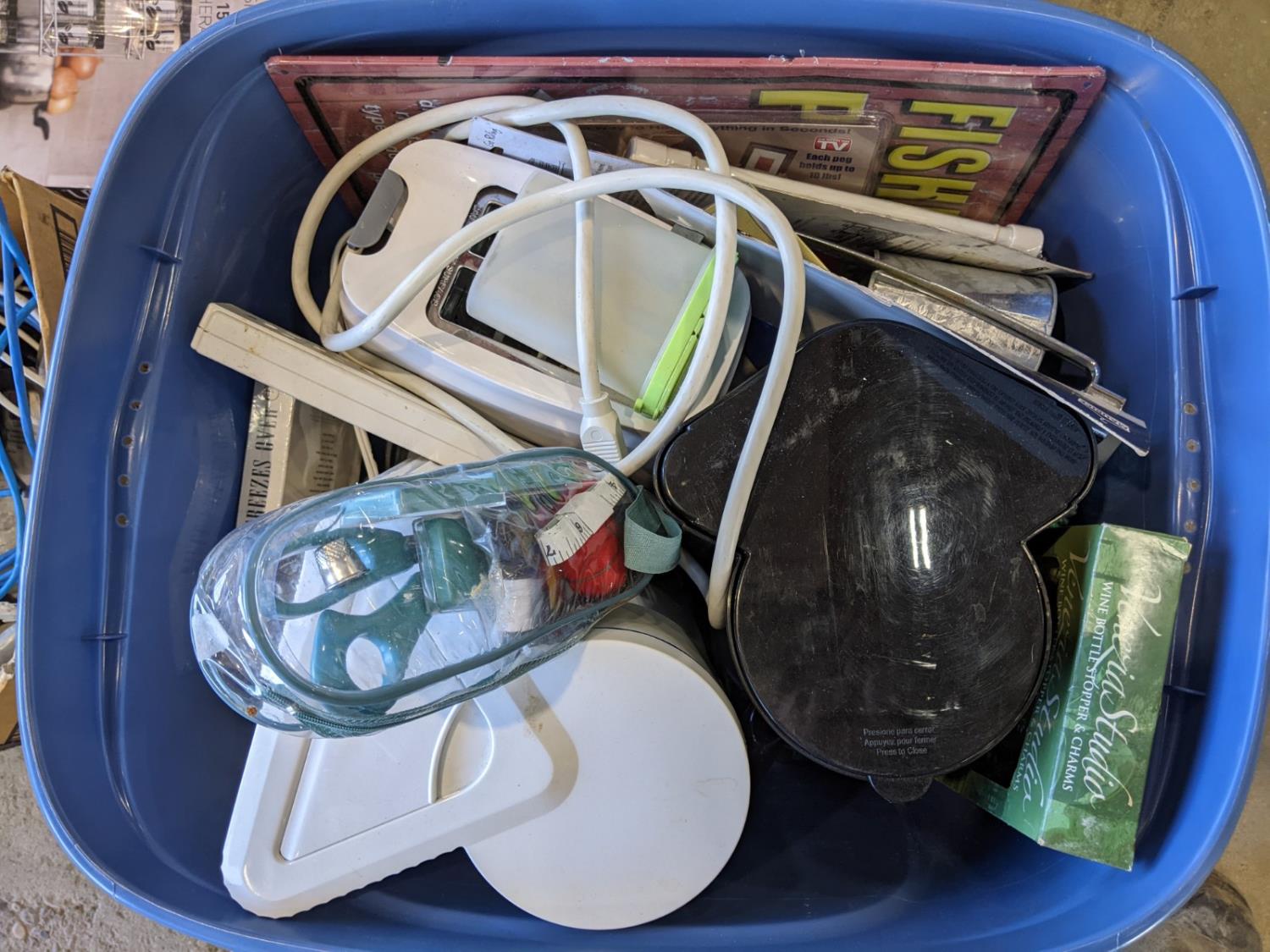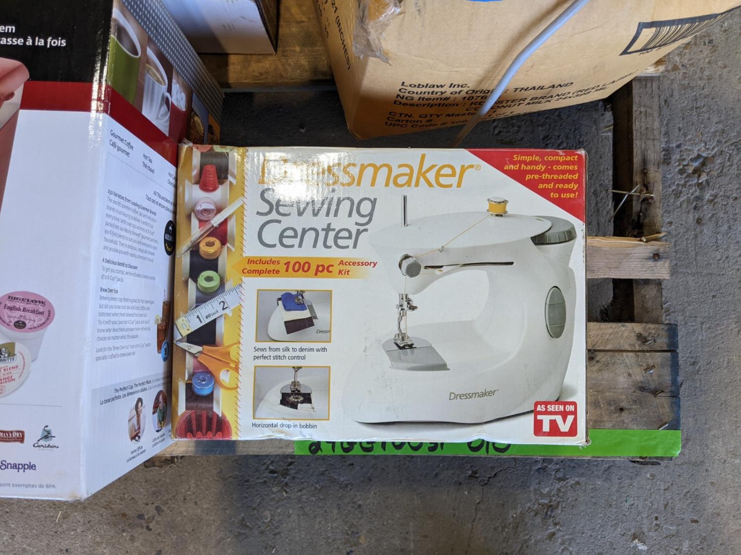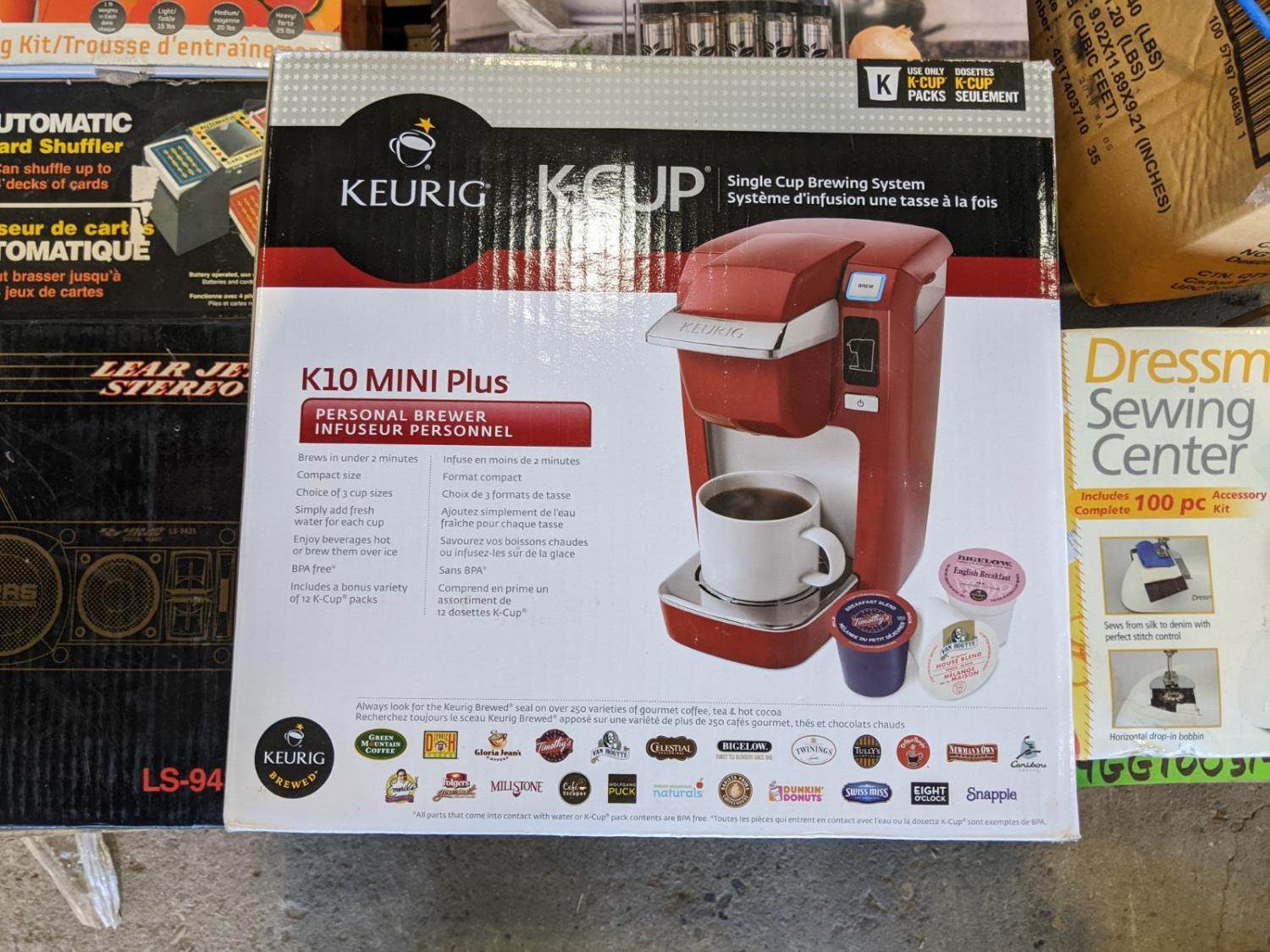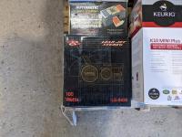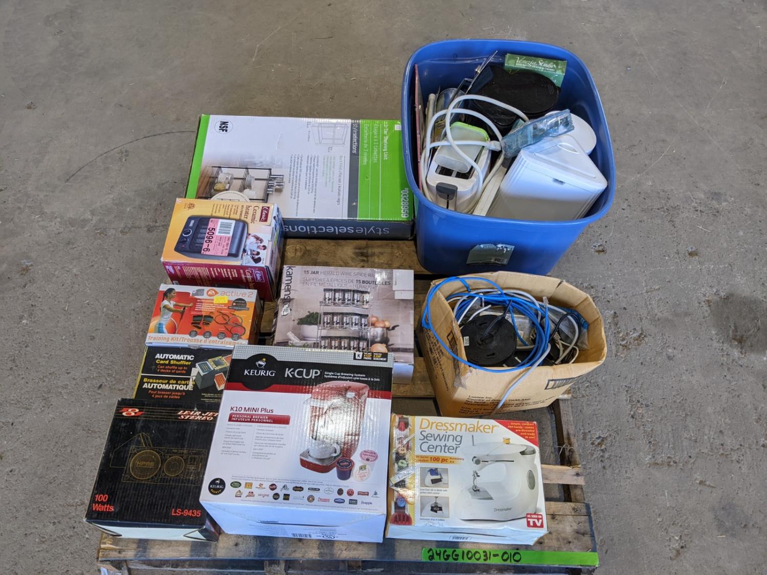 Portable speakers, keurig coffee maker, 15 jar spice rack, ceramic heater, 3 Tier shelving unit, sewing machine, miscellaneous household items