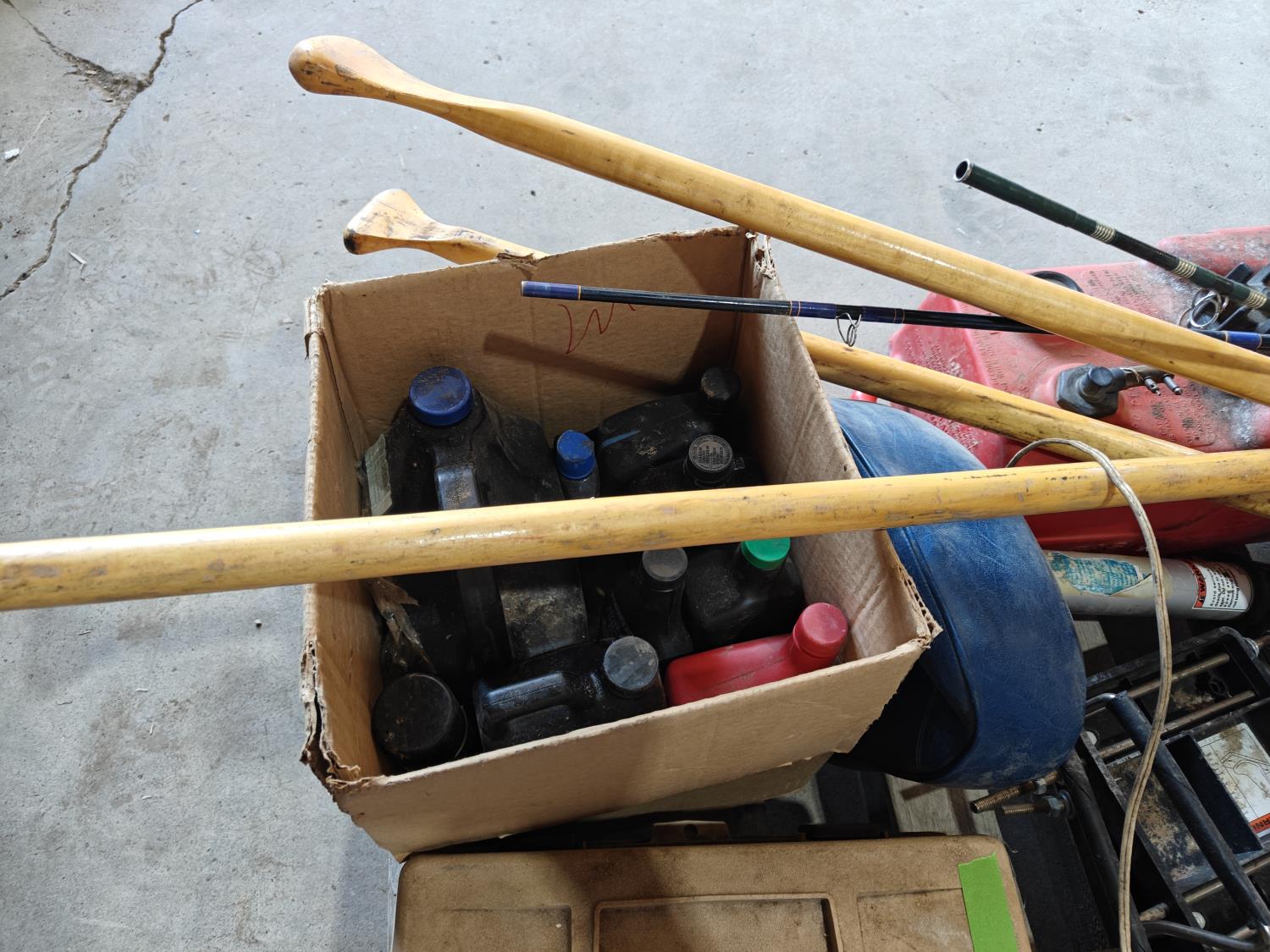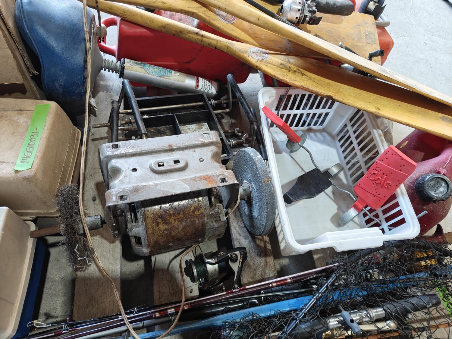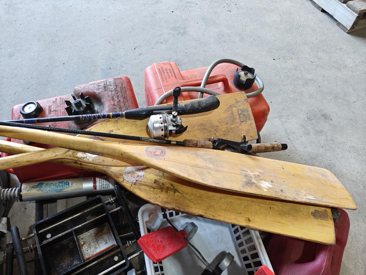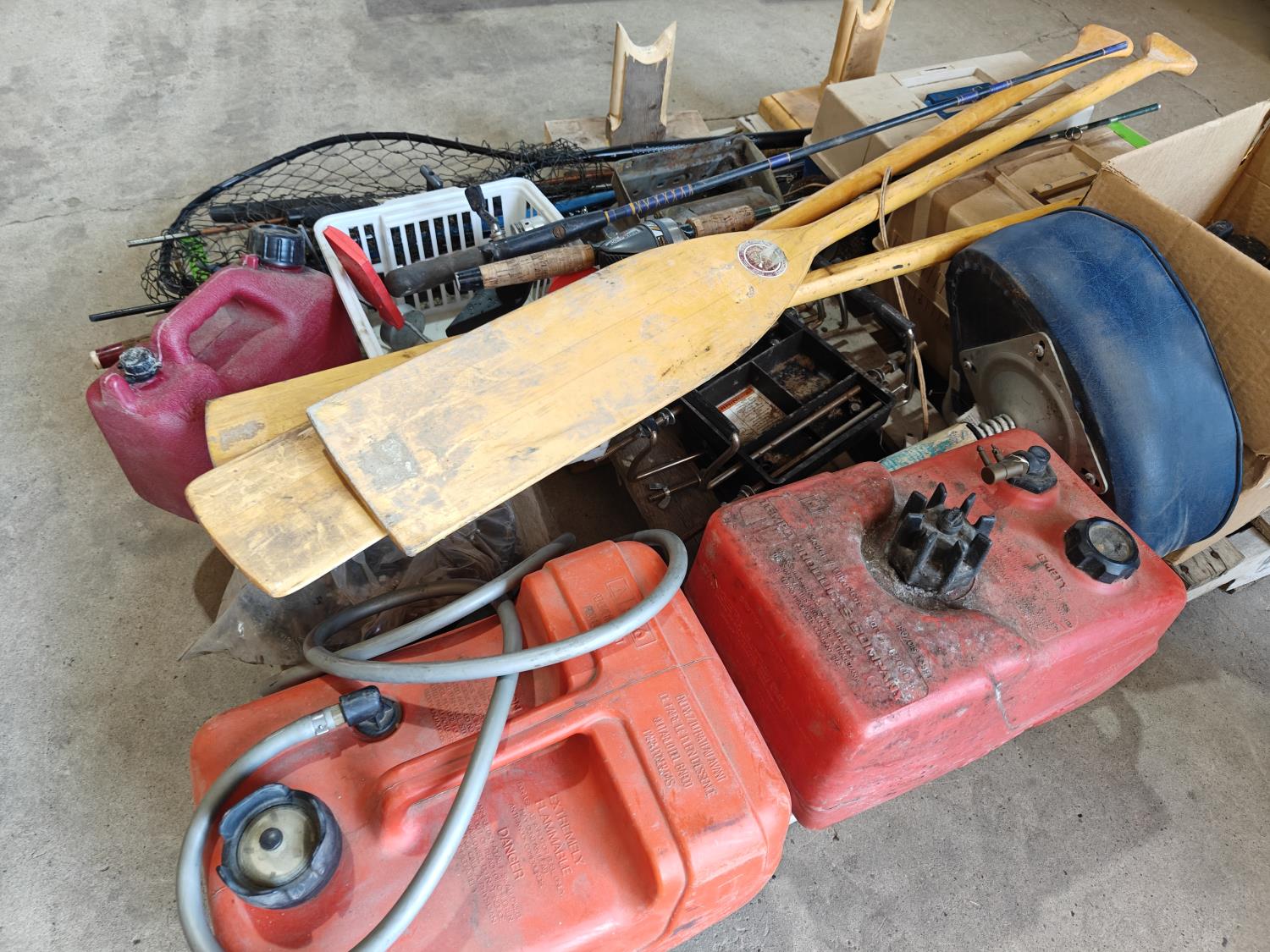 (2) Tackle boxes with gear, Qty of lubricants, boat anchor, (2) boat fuel tanks, Qty of fishing rods, (3) paddles, net